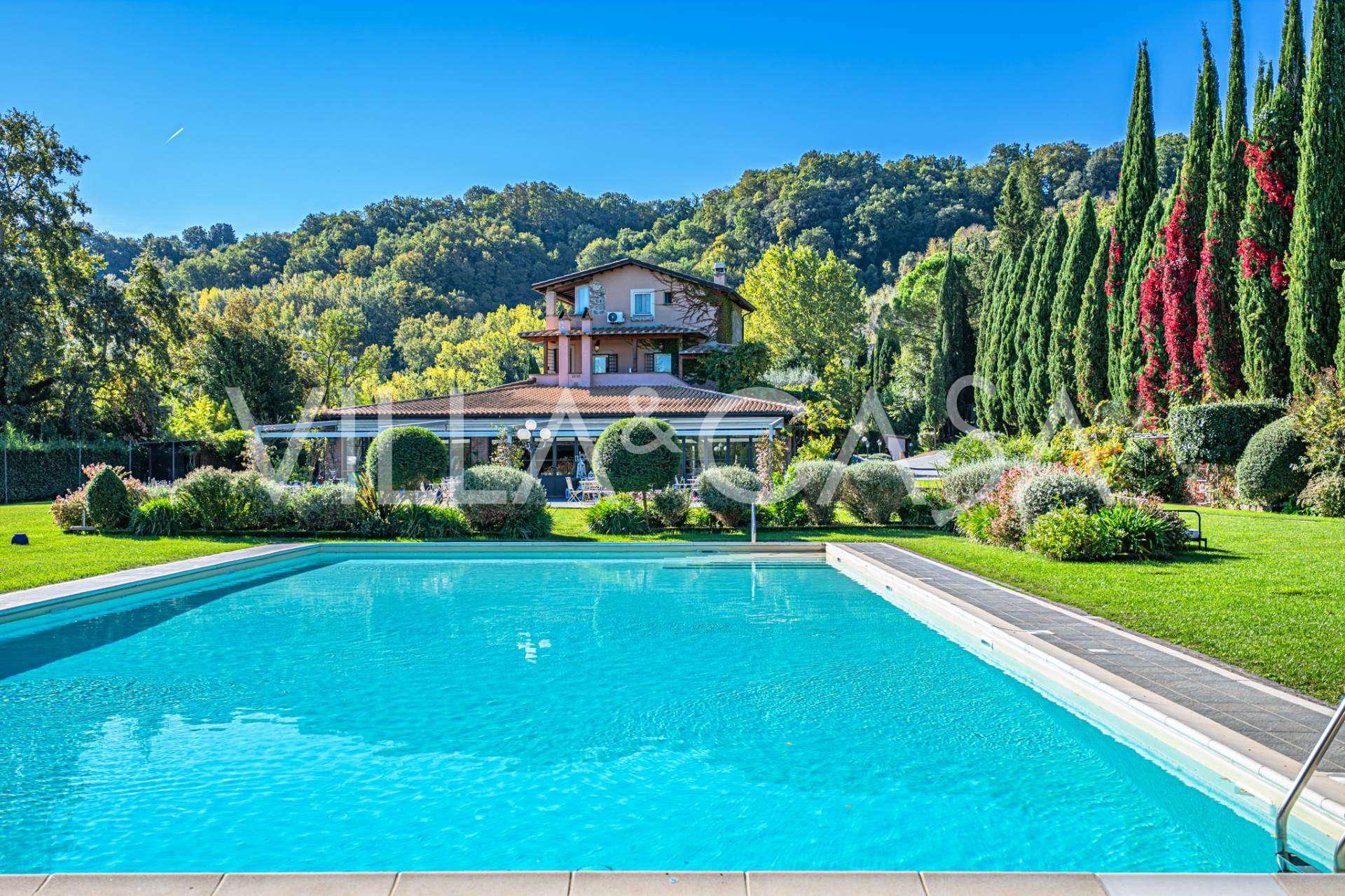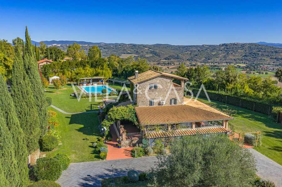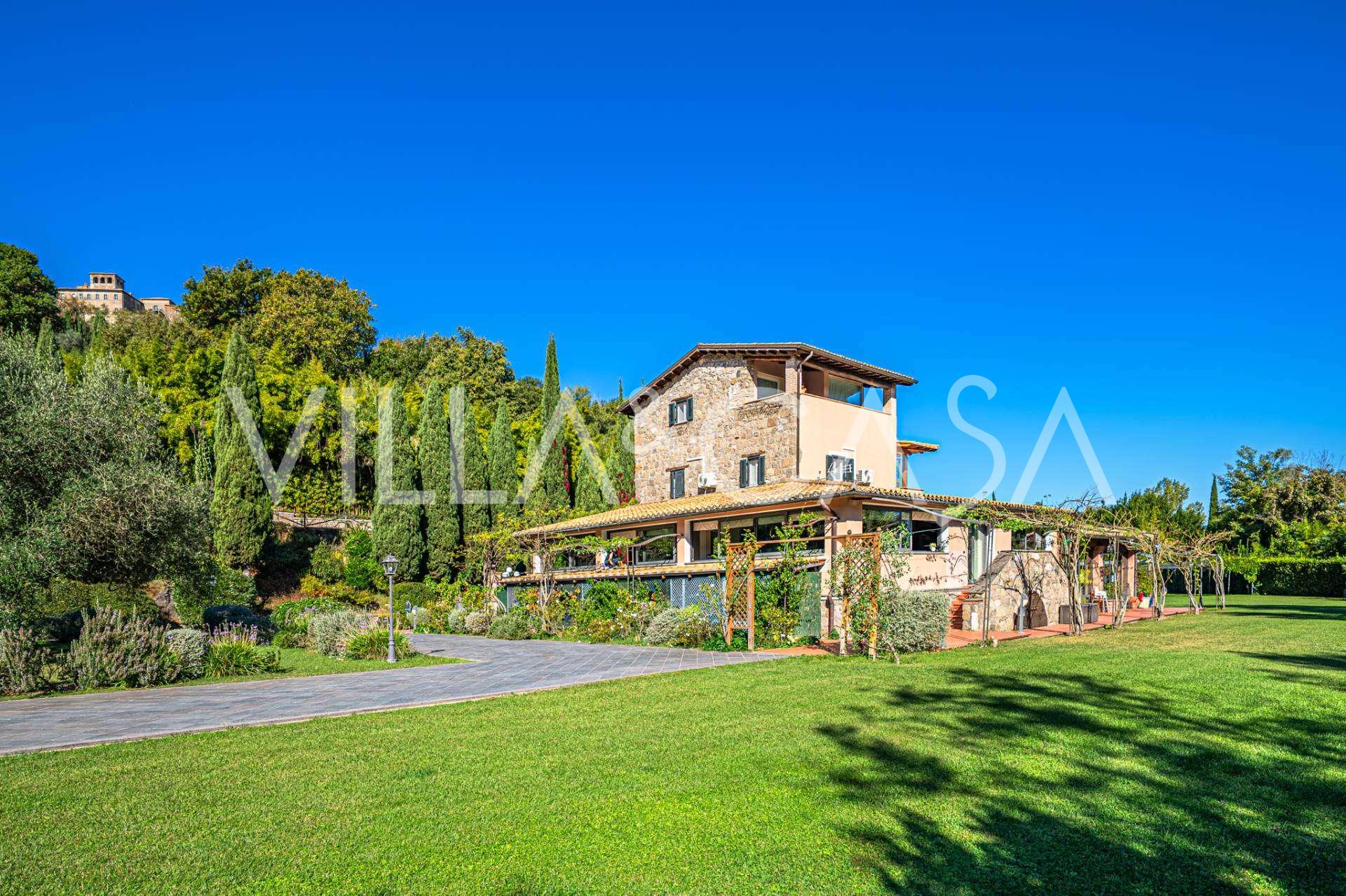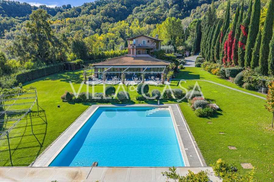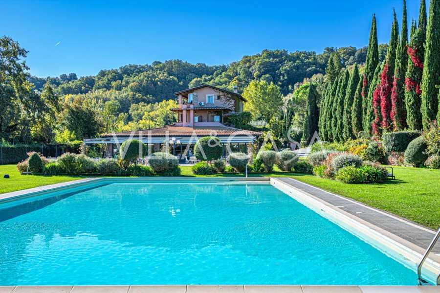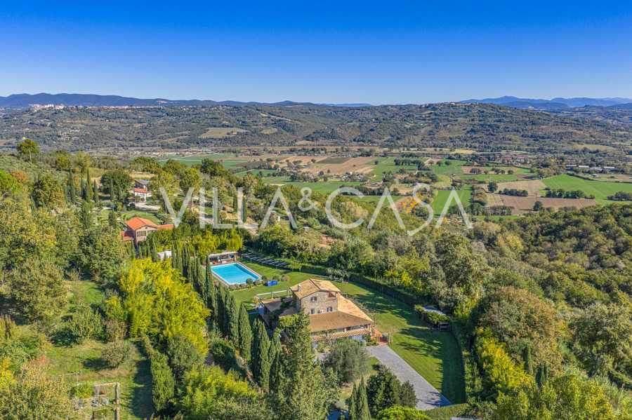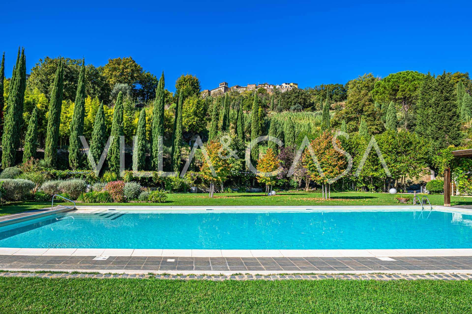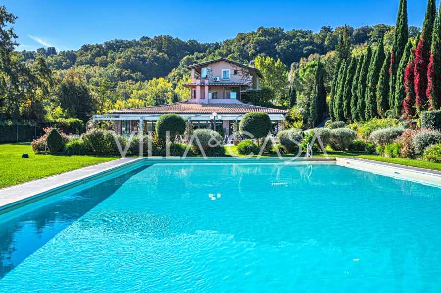 Dieses Anwesen in der Provinz Viterbo erhebt sich über die Hügel und bietet einen unglaublichen Blick auf das Tibertal. Es erstreckt sich über etwa 25 Hektar gepflegten Park, der eine Atmosphäre völliger Ruhe und Abgeschiedenheit schafft. Jeder Bereich hier ist auf Komfort, Eleganz und Harmonie ausgelegt: große sonnige Terrassen, Pavillons, stilvolle Liegestühle am Pool und schattige Wege, umgeben von jahrhundertealten Bäumen.