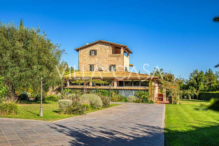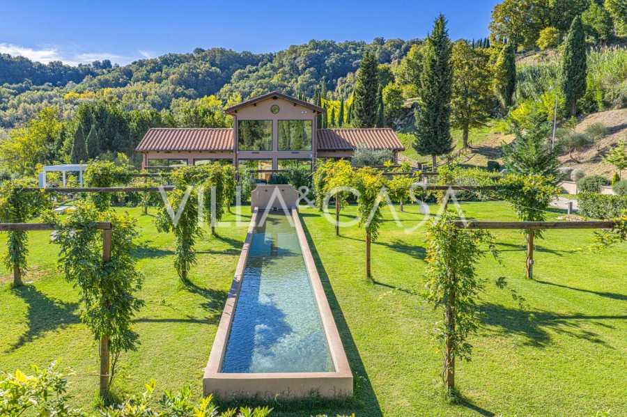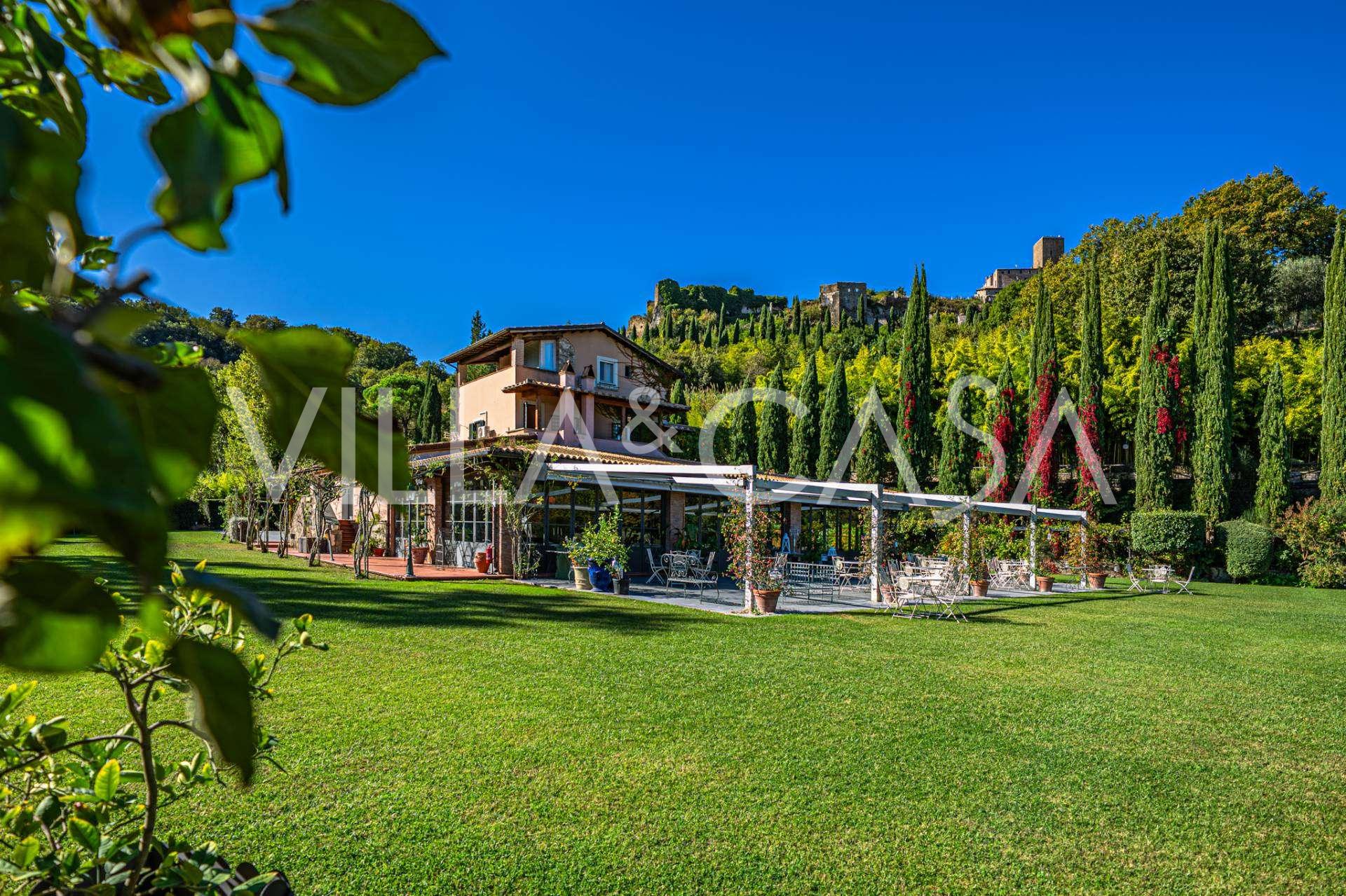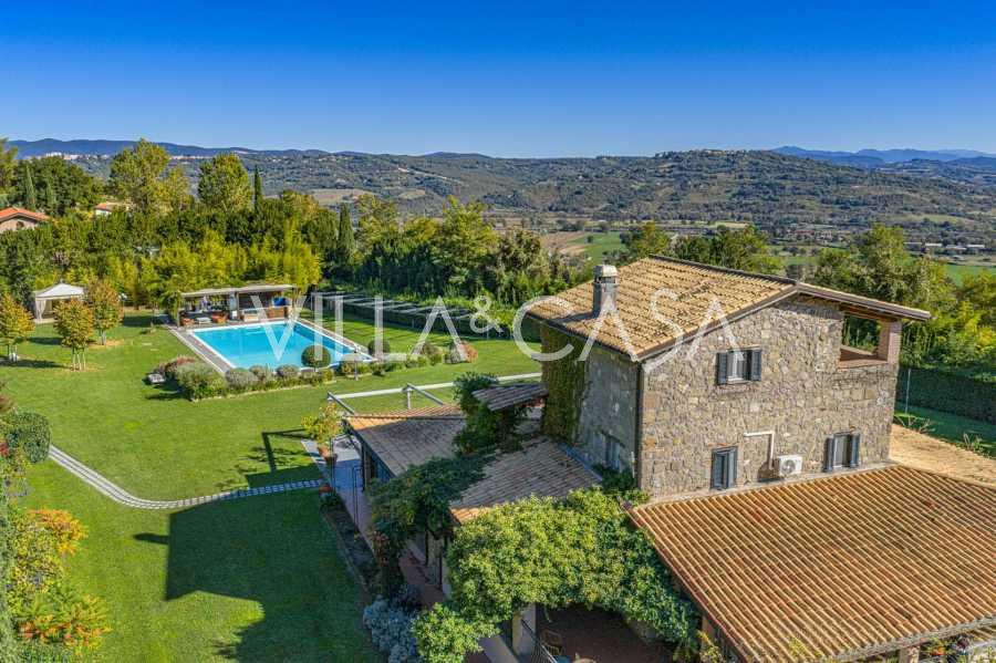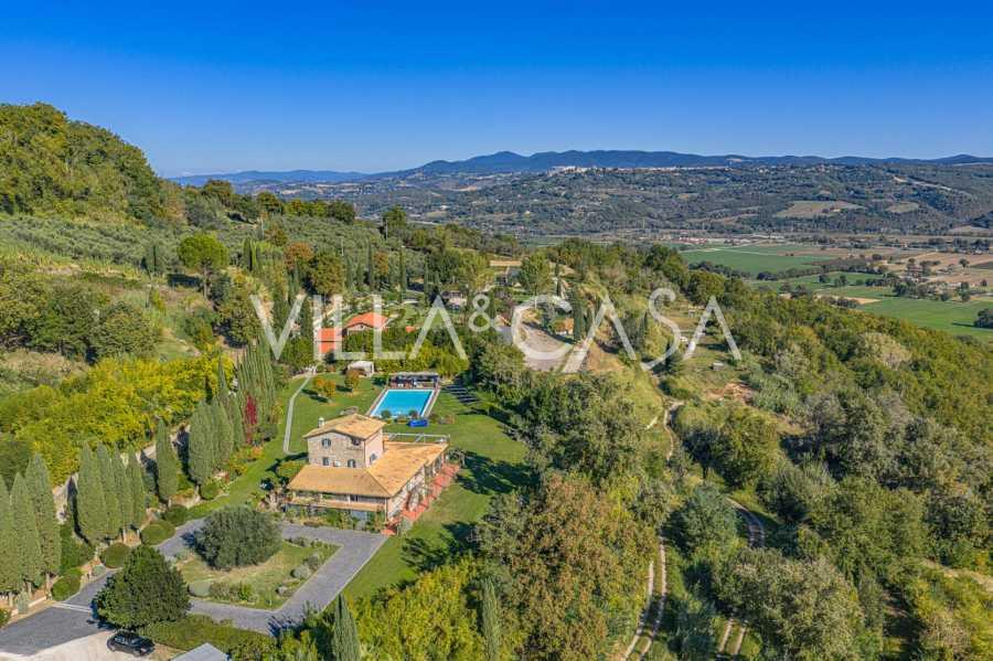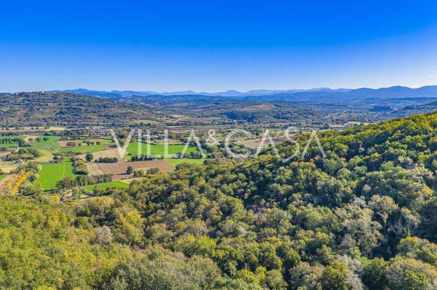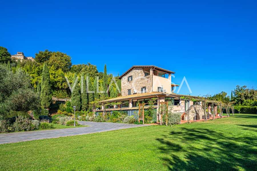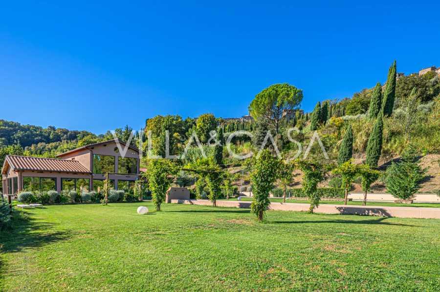 Dieses Anwesen in der Provinz Viterbo erhebt sich über die Hügel und bietet einen unglaublichen Blick auf das Tibertal. Es erstreckt sich über etwa 25 Hektar gepflegten Park, der eine Atmosphäre völliger Ruhe und Abgeschiedenheit schafft. Jeder Bereich hier ist auf Komfort, Eleganz und Harmonie ausgelegt: große sonnige Terrassen, Pavillons, stilvolle Liegestühle am Pool und schattige Wege, umgeben von jahrhundertealten Bäumen.