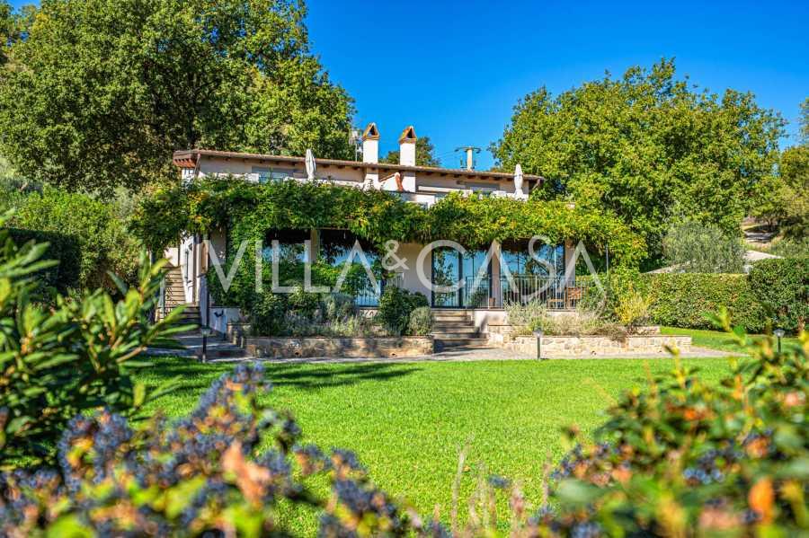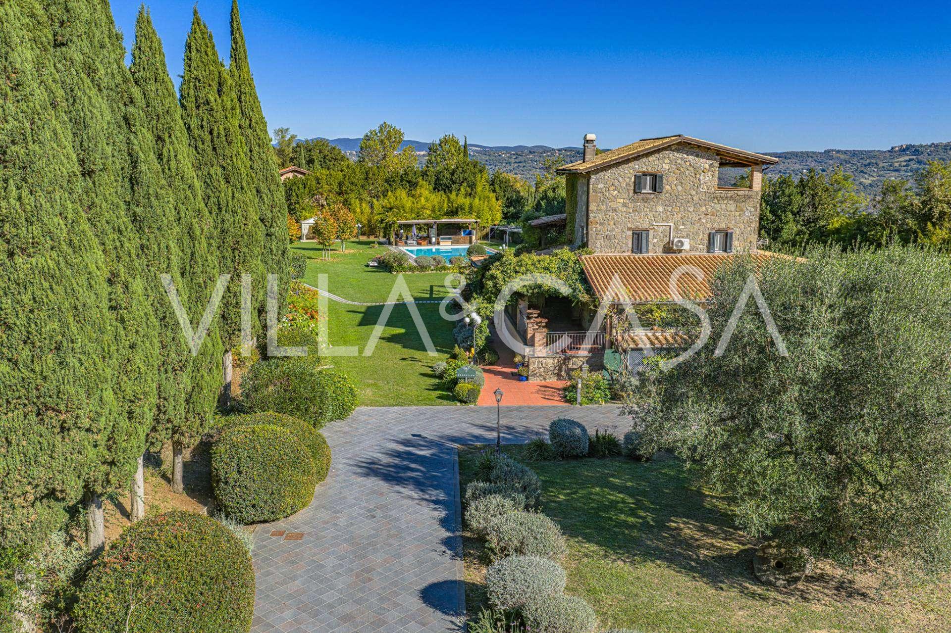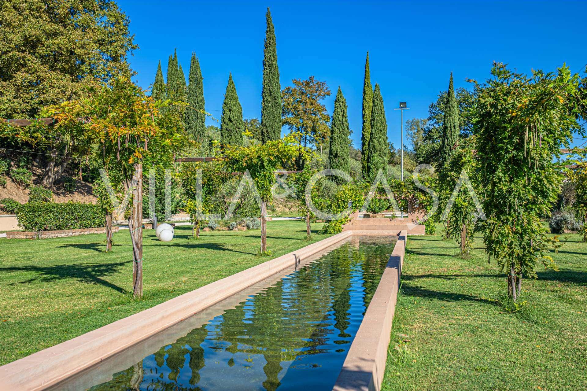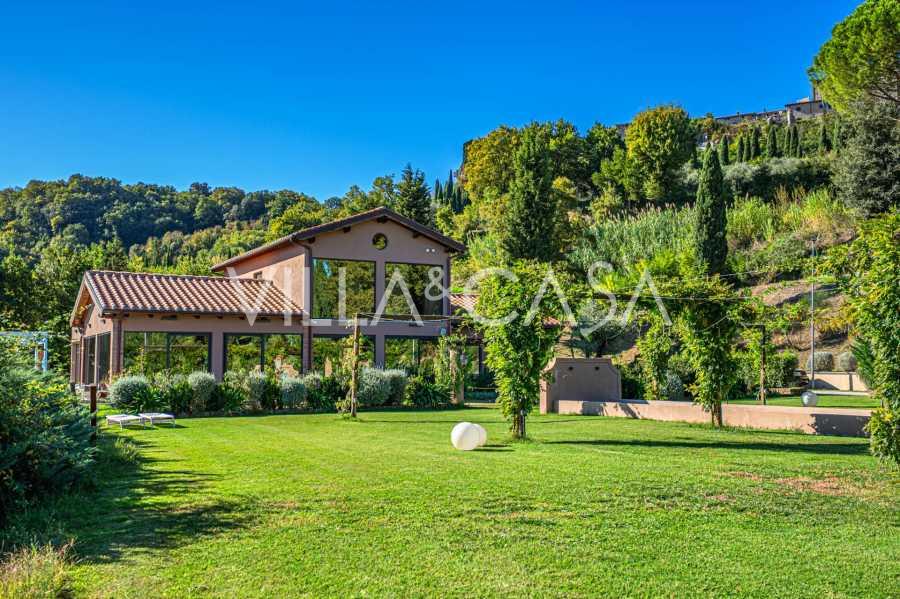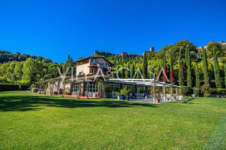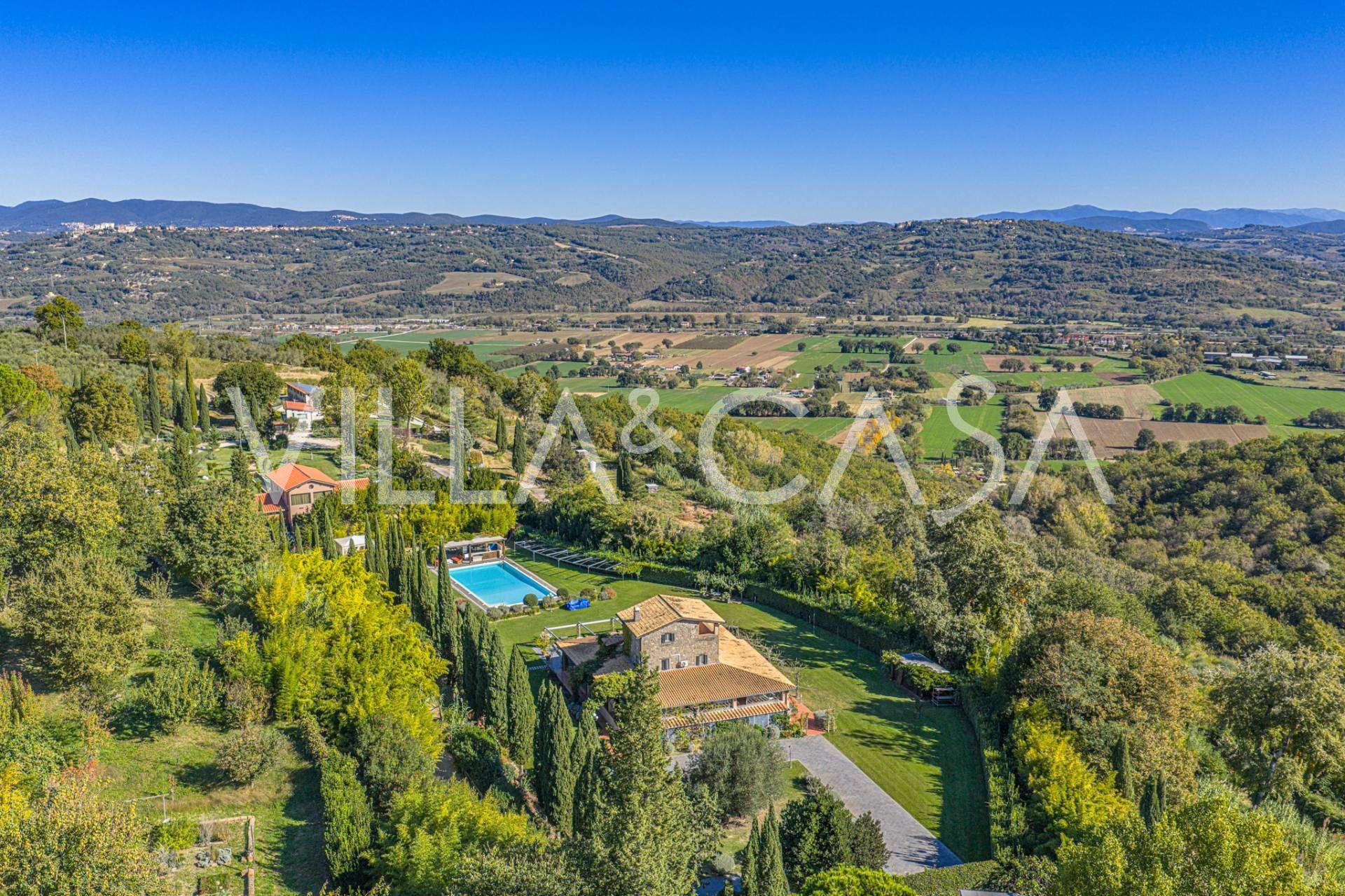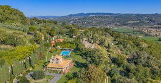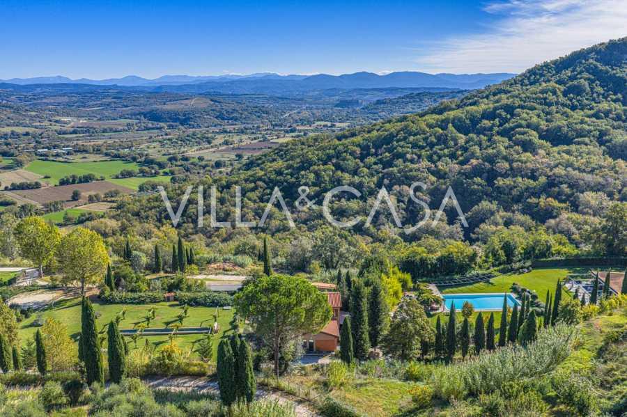 Dieses Anwesen in der Provinz Viterbo erhebt sich über die Hügel und bietet einen unglaublichen Blick auf das Tibertal. Es erstreckt sich über etwa 25 Hektar gepflegten Park, der eine Atmosphäre völliger Ruhe und Abgeschiedenheit schafft. Jeder Bereich hier ist auf Komfort, Eleganz und Harmonie ausgelegt: große sonnige Terrassen, Pavillons, stilvolle Liegestühle am Pool und schattige Wege, umgeben von jahrhundertealten Bäumen.