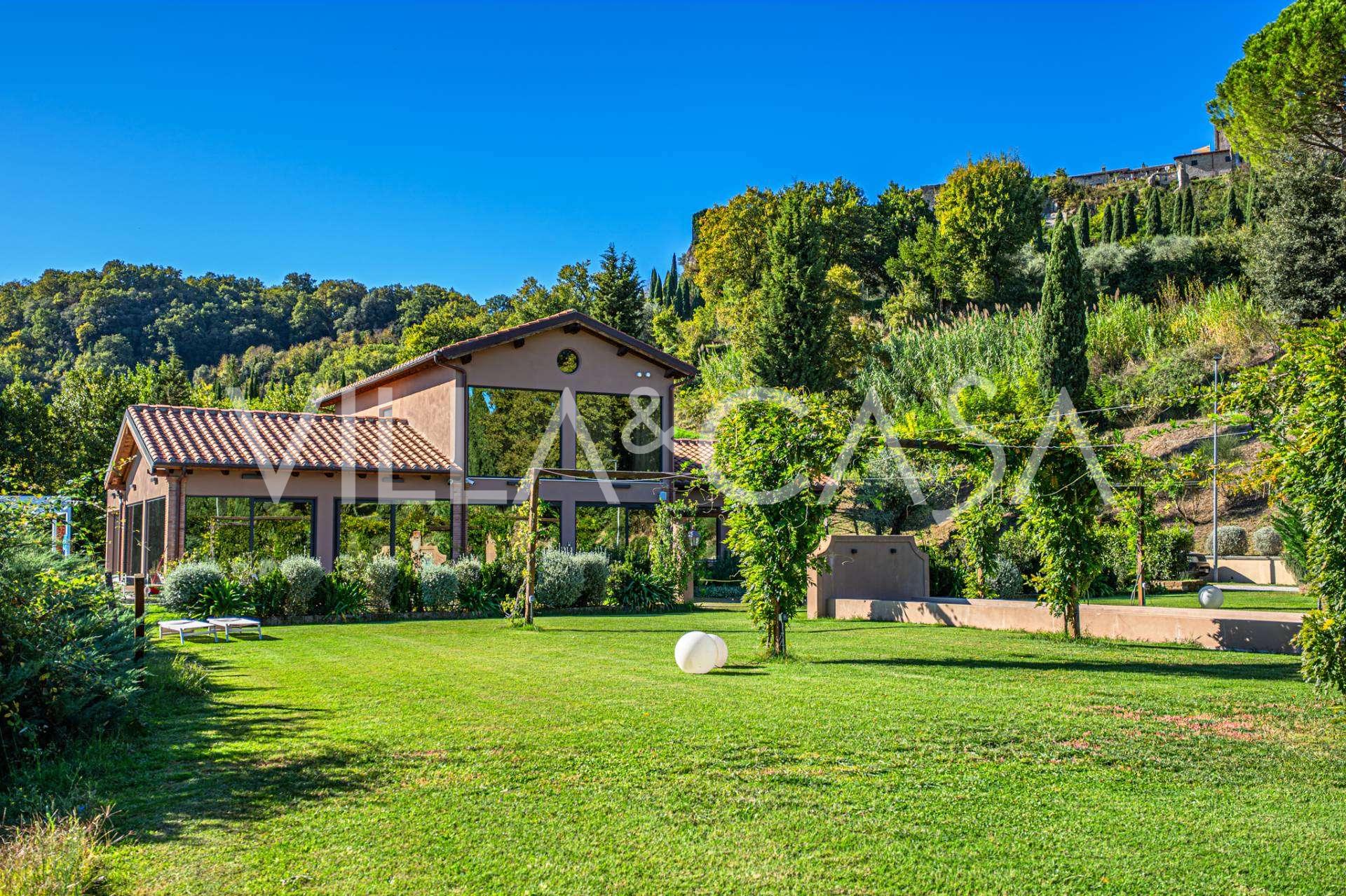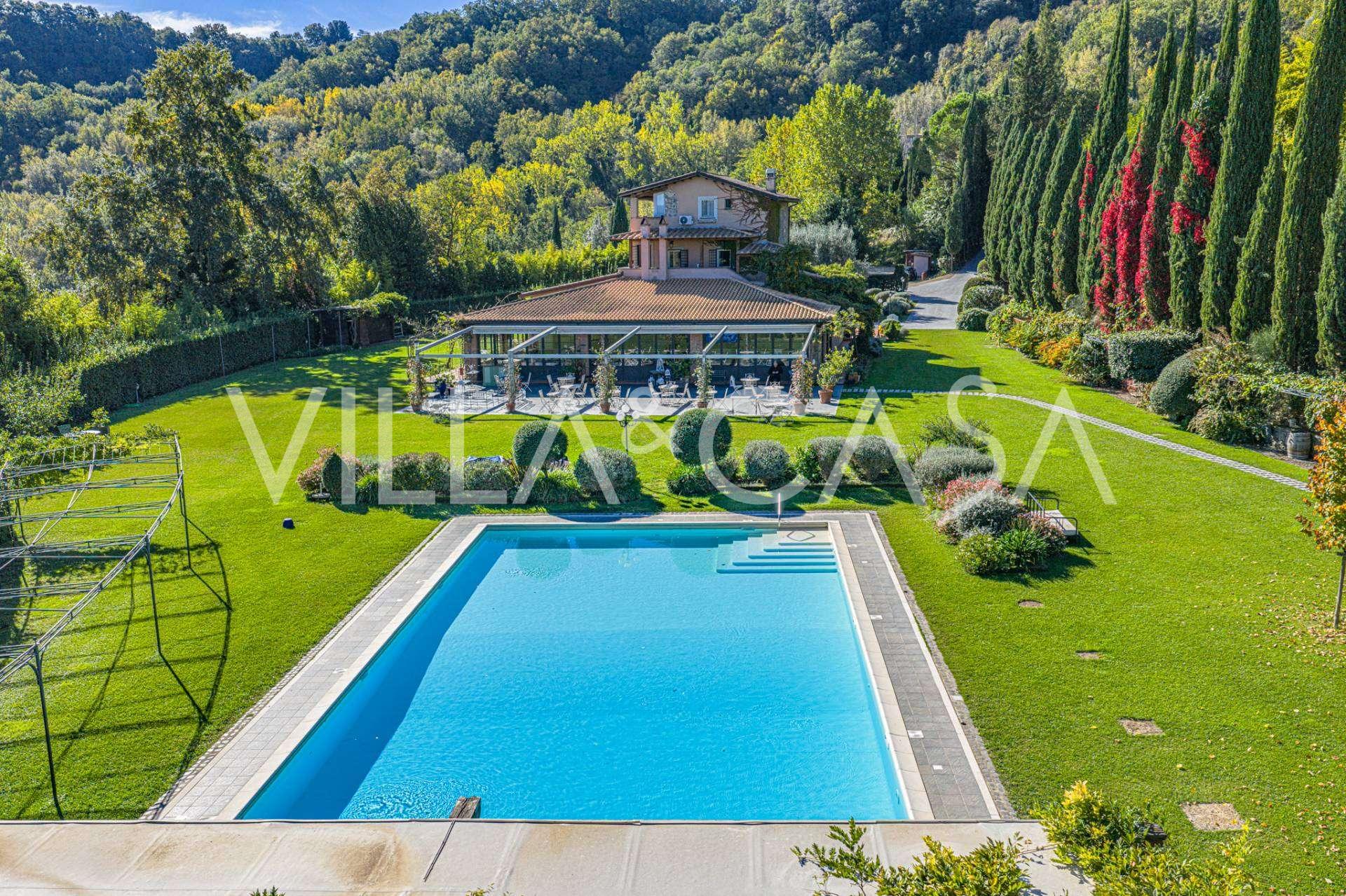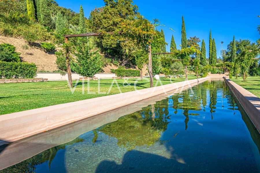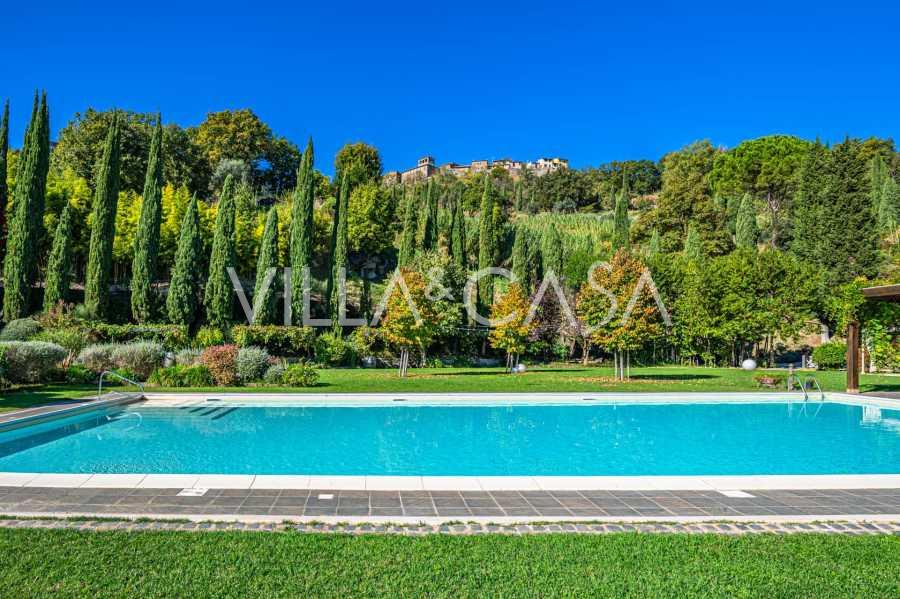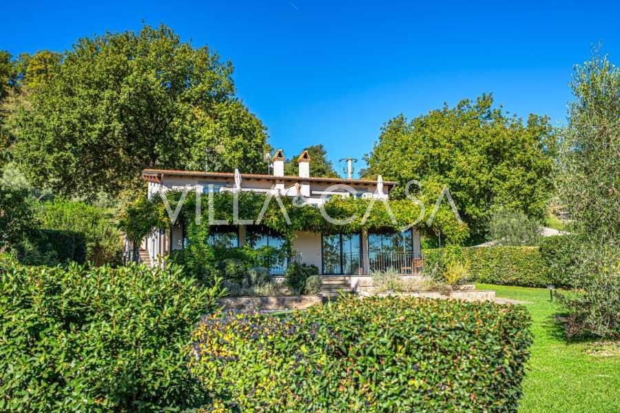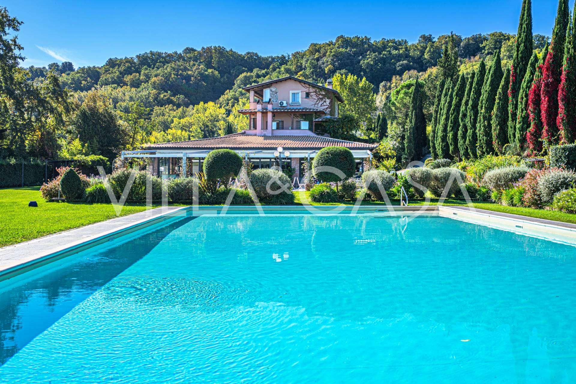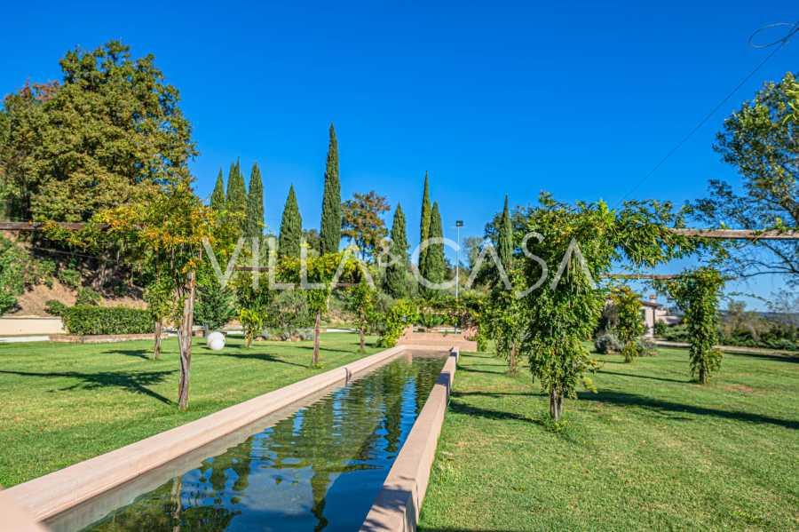 Dieses Anwesen in der Provinz Viterbo erhebt sich über die Hügel und bietet einen unglaublichen Blick auf das Tibertal. Es erstreckt sich über etwa 25 Hektar gepflegten Park, der eine Atmosphäre völliger Ruhe und Abgeschiedenheit schafft. Jeder Bereich hier ist auf Komfort, Eleganz und Harmonie ausgelegt: große sonnige Terrassen, Pavillons, stilvolle Liegestühle am Pool und schattige Wege, umgeben von jahrhundertealten Bäumen.