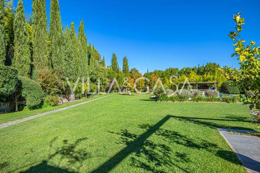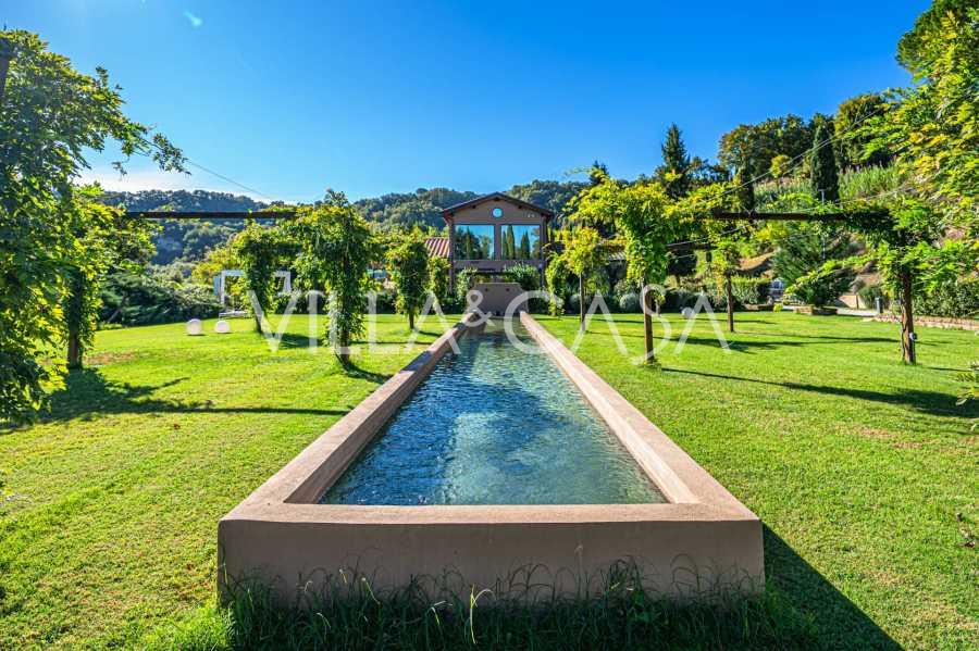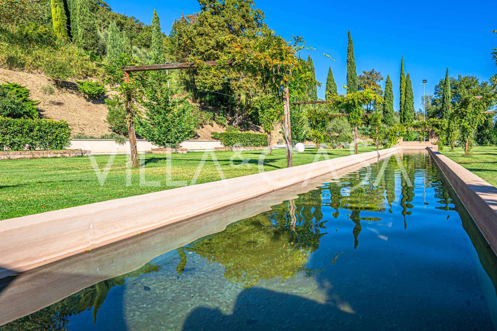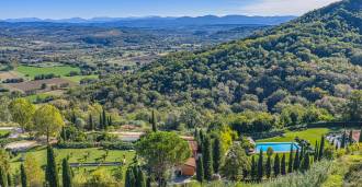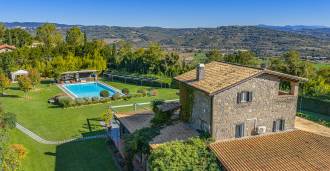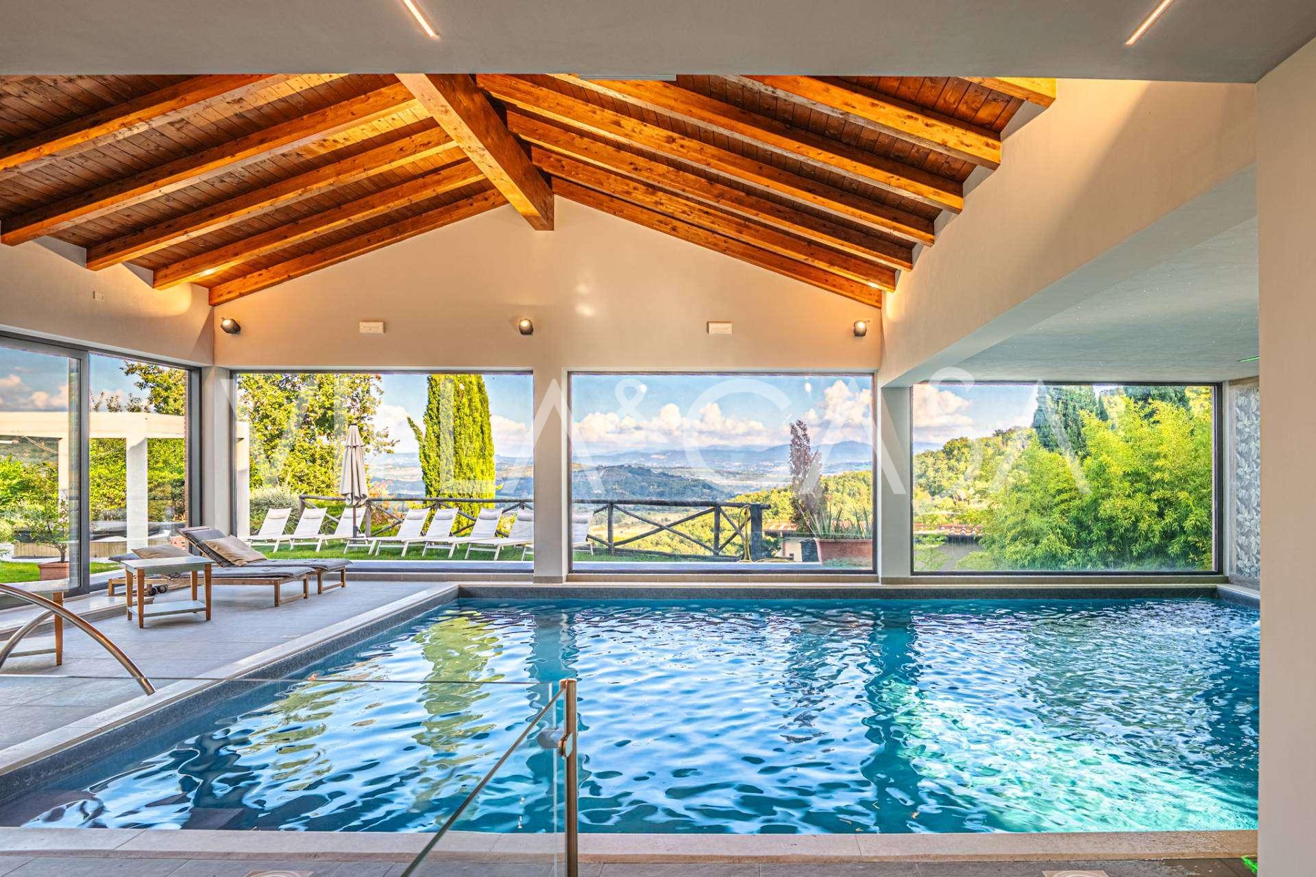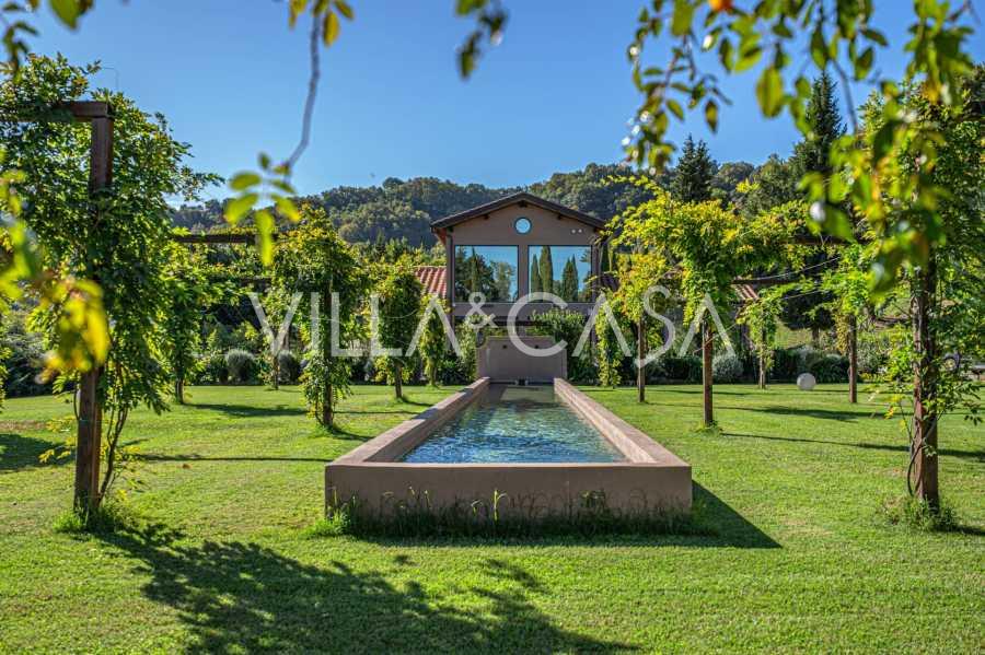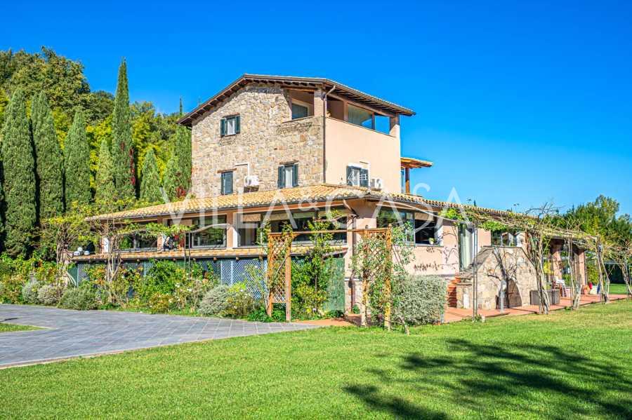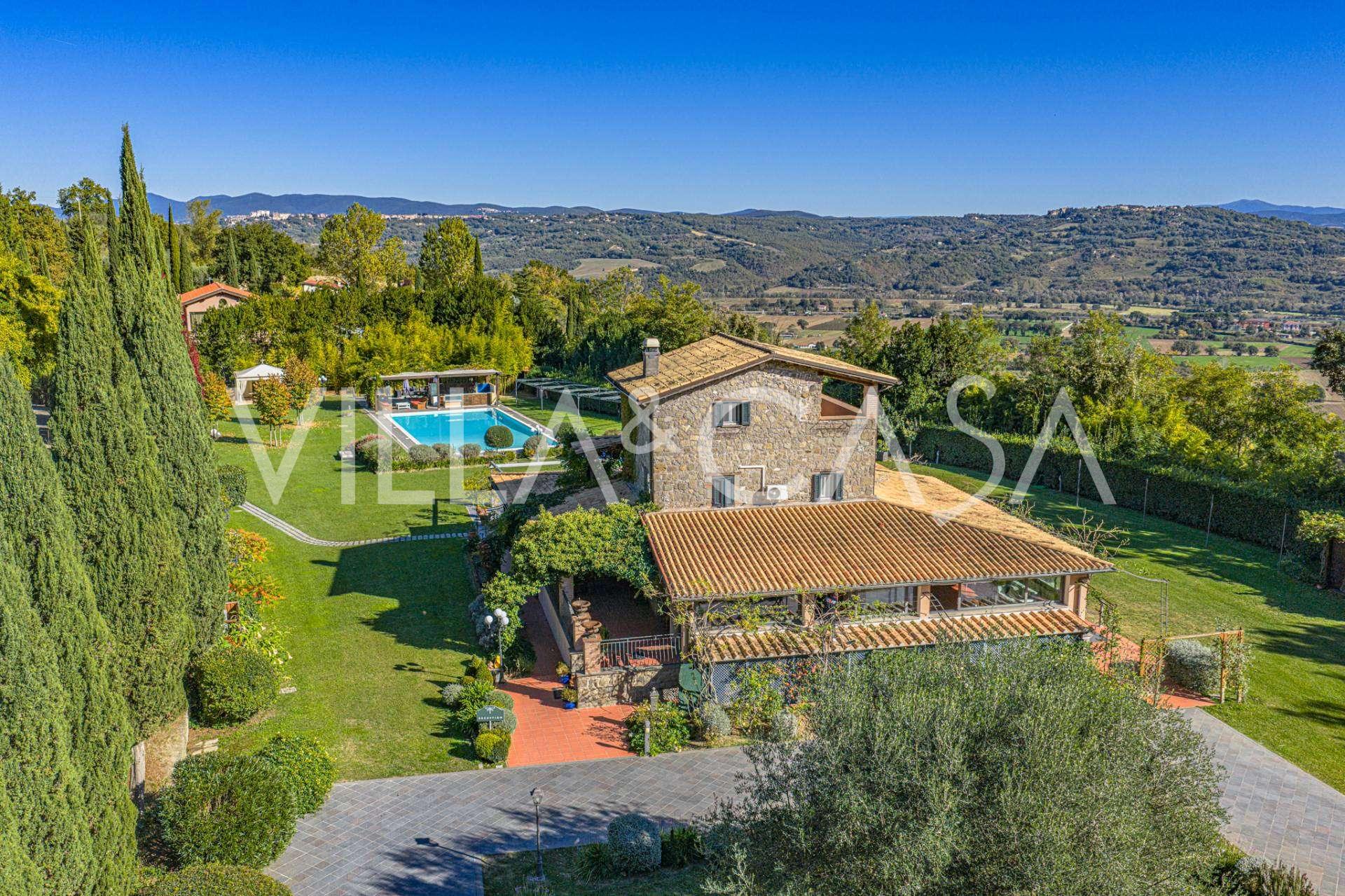 Dieses Anwesen in der Provinz Viterbo erhebt sich über die Hügel und bietet einen unglaublichen Blick auf das Tibertal. Es erstreckt sich über etwa 25 Hektar gepflegten Park, der eine Atmosphäre völliger Ruhe und Abgeschiedenheit schafft. Jeder Bereich hier ist auf Komfort, Eleganz und Harmonie ausgelegt: große sonnige Terrassen, Pavillons, stilvolle Liegestühle am Pool und schattige Wege, umgeben von jahrhundertealten Bäumen.