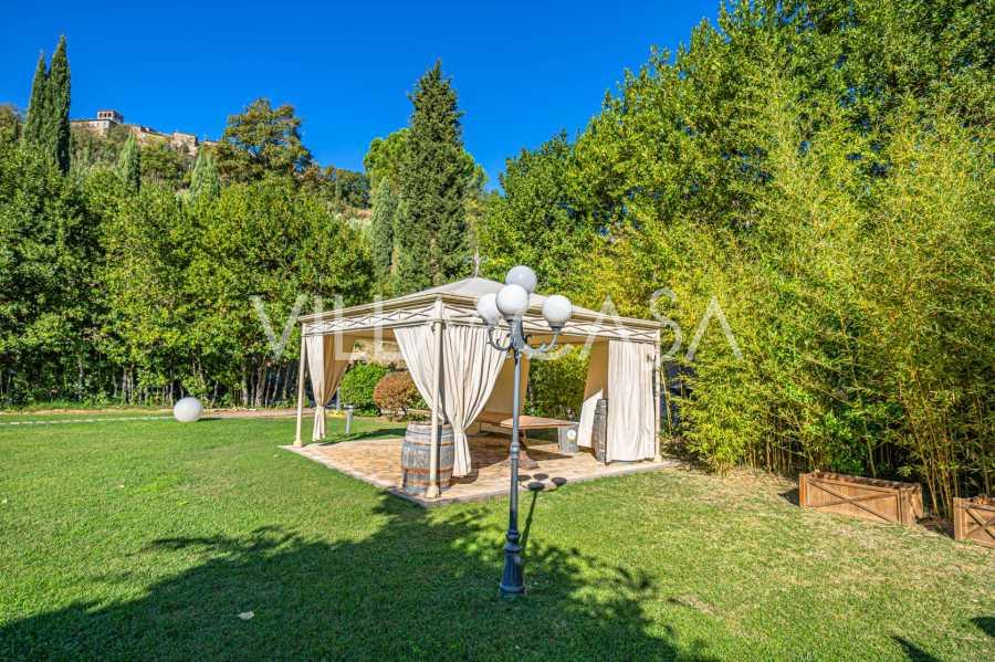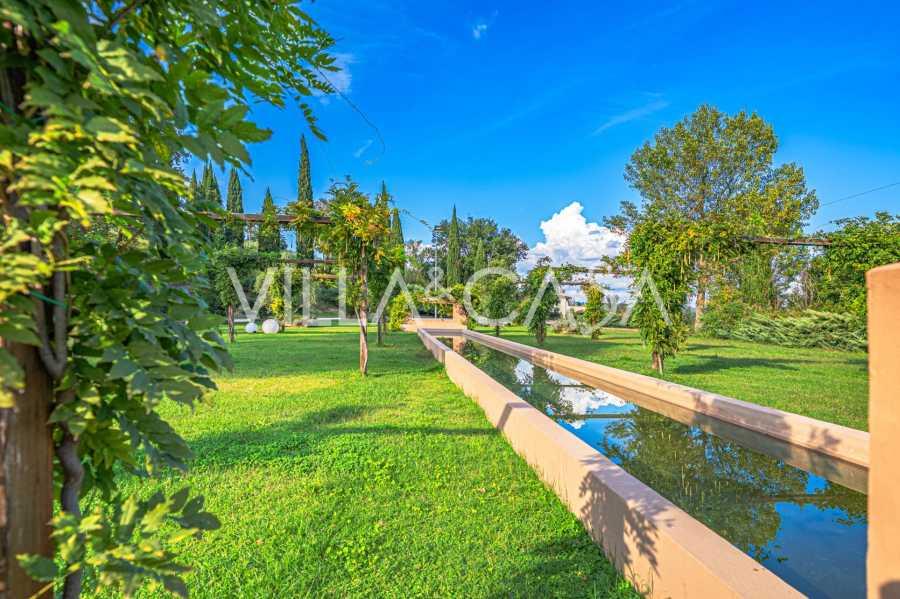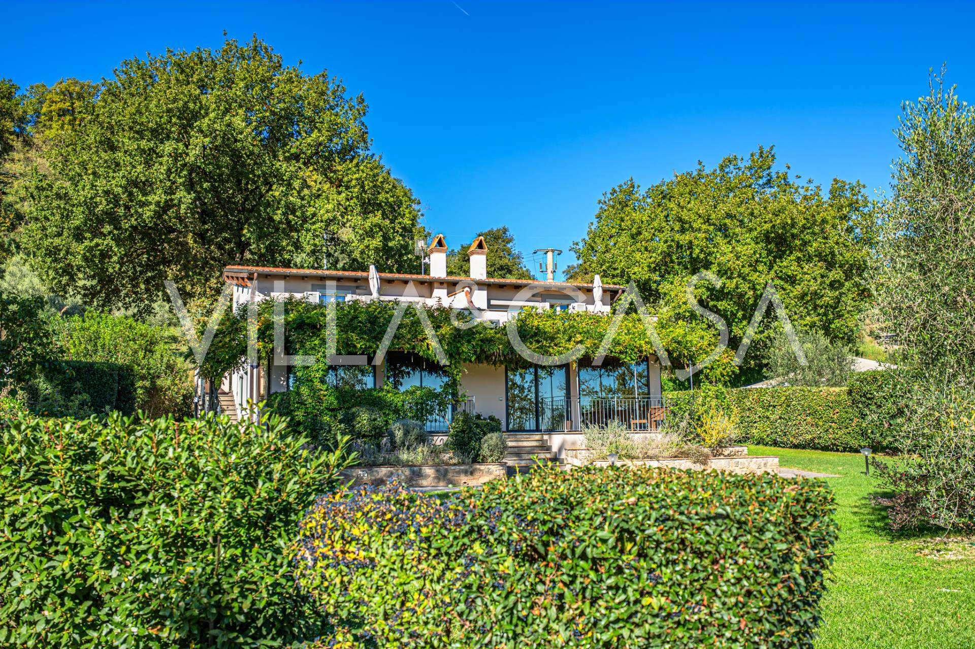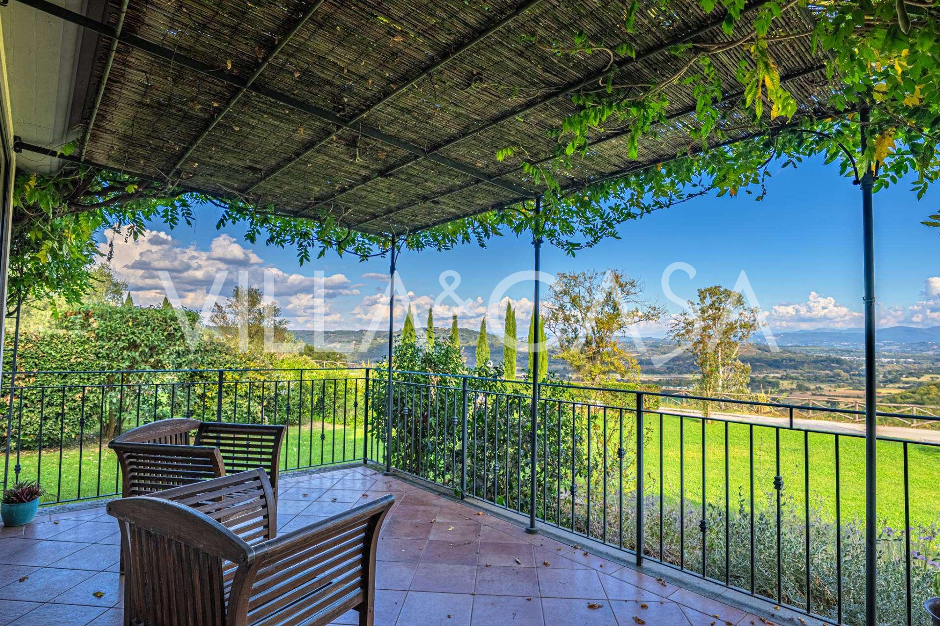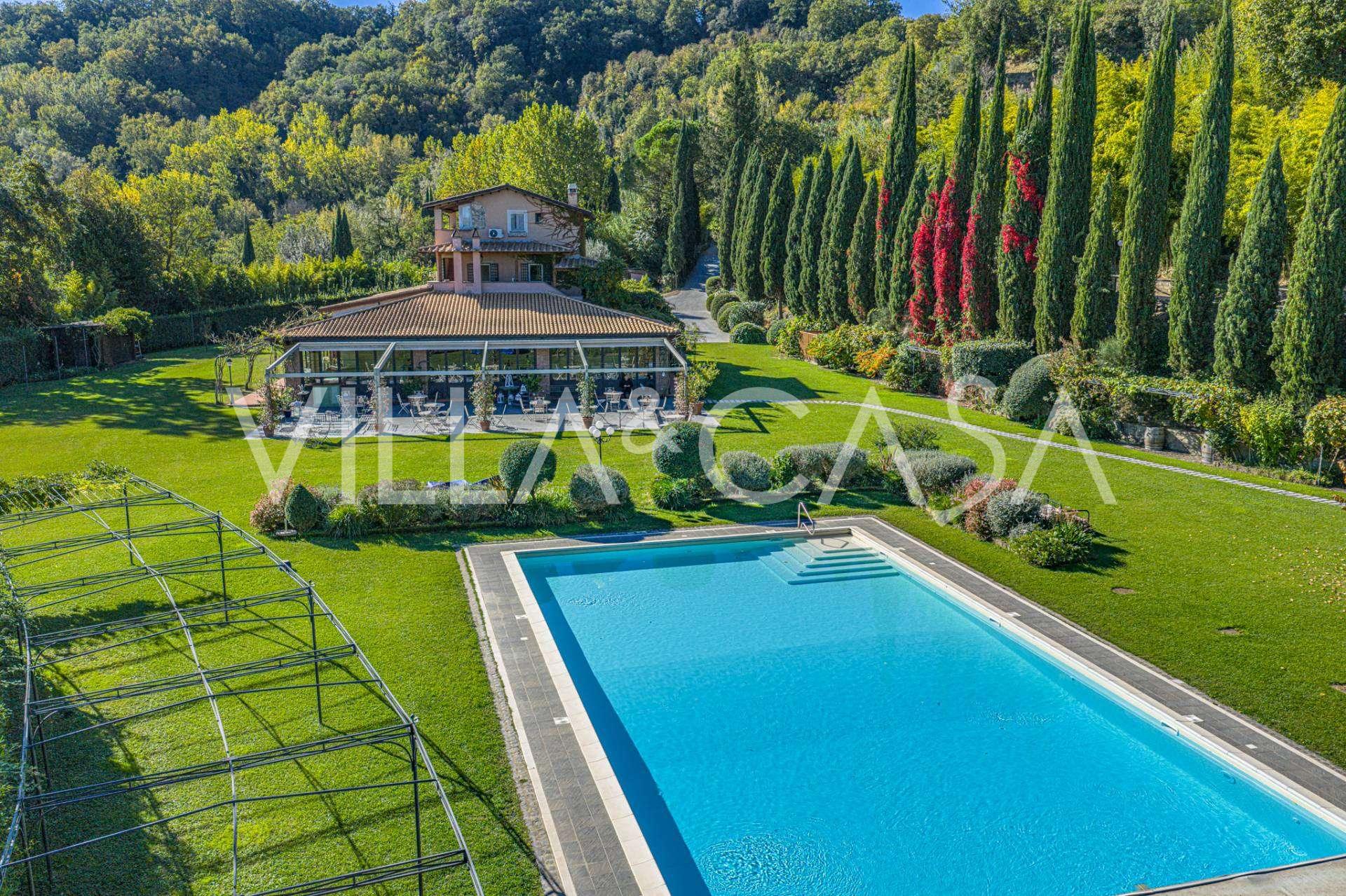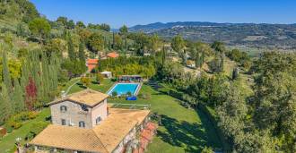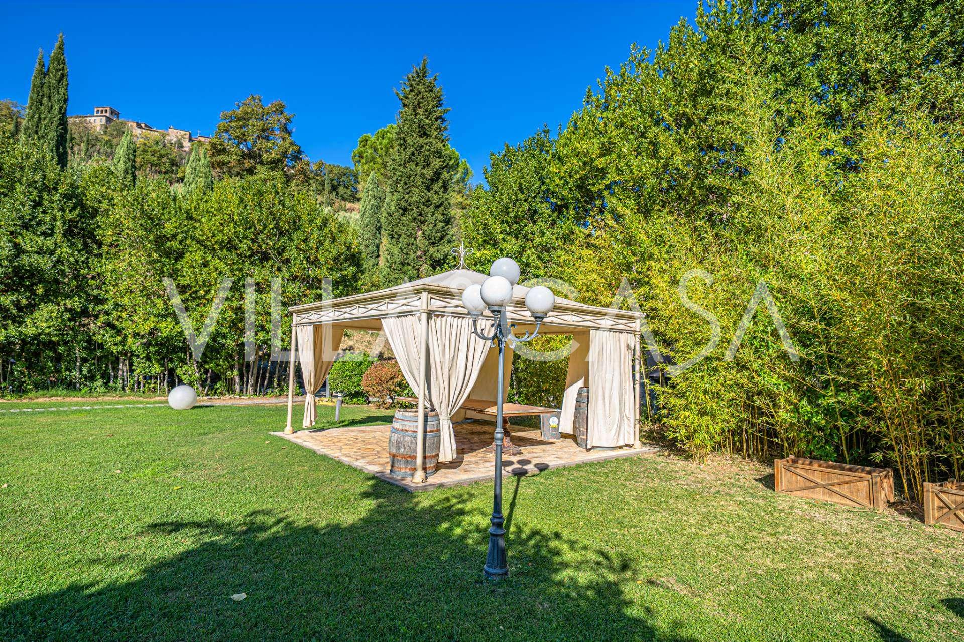 Dieses Anwesen in der Provinz Viterbo erhebt sich über die Hügel und bietet einen unglaublichen Blick auf das Tibertal. Es erstreckt sich über etwa 25 Hektar gepflegten Park, der eine Atmosphäre völliger Ruhe und Abgeschiedenheit schafft. Jeder Bereich hier ist auf Komfort, Eleganz und Harmonie ausgelegt: große sonnige Terrassen, Pavillons, stilvolle Liegestühle am Pool und schattige Wege, umgeben von jahrhundertealten Bäumen.