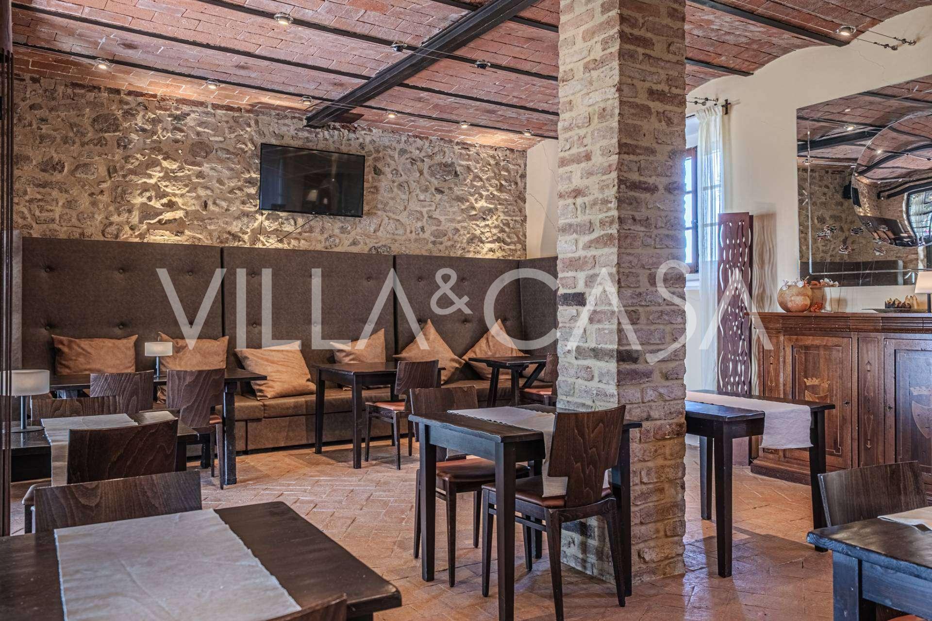 Im Erdgeschoss befinden sich der Empfangsbereich, ein geräumiges Wohnzimmer, ein Restaurant mit professioneller Küche, Personalräume und ein privates Zimmer mit Badezimmer.