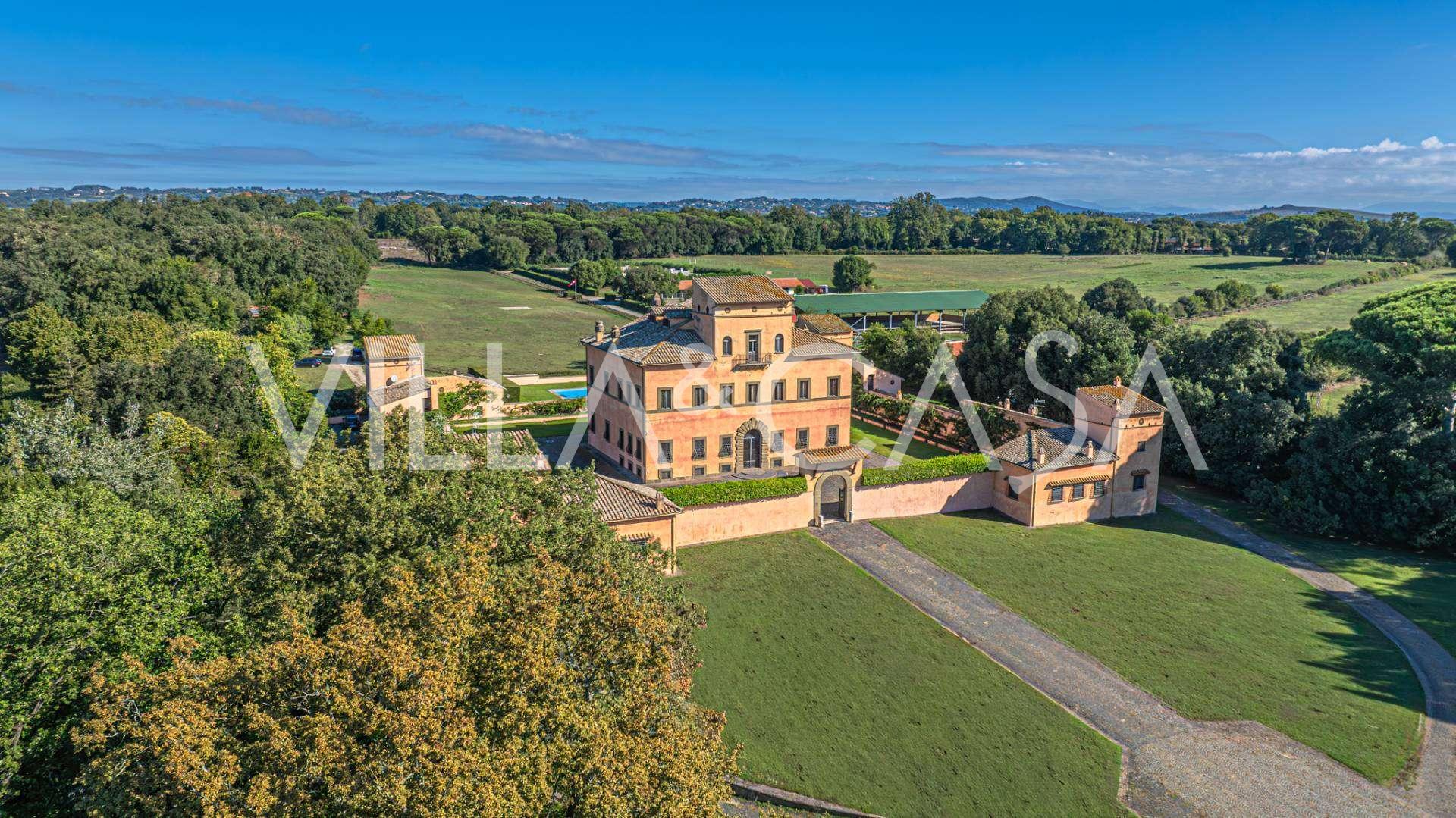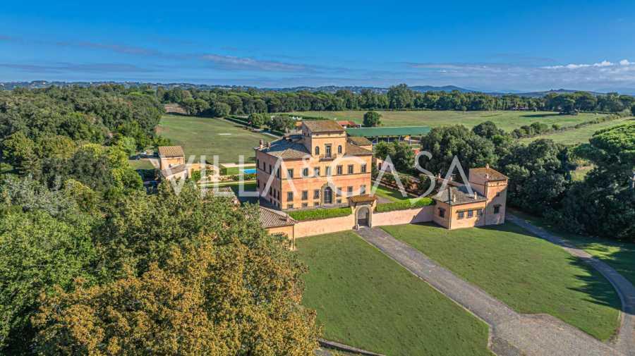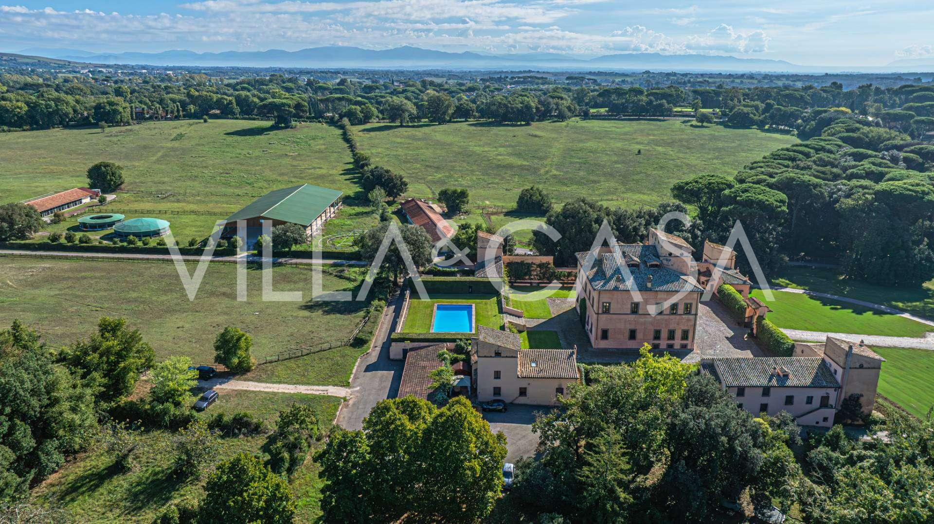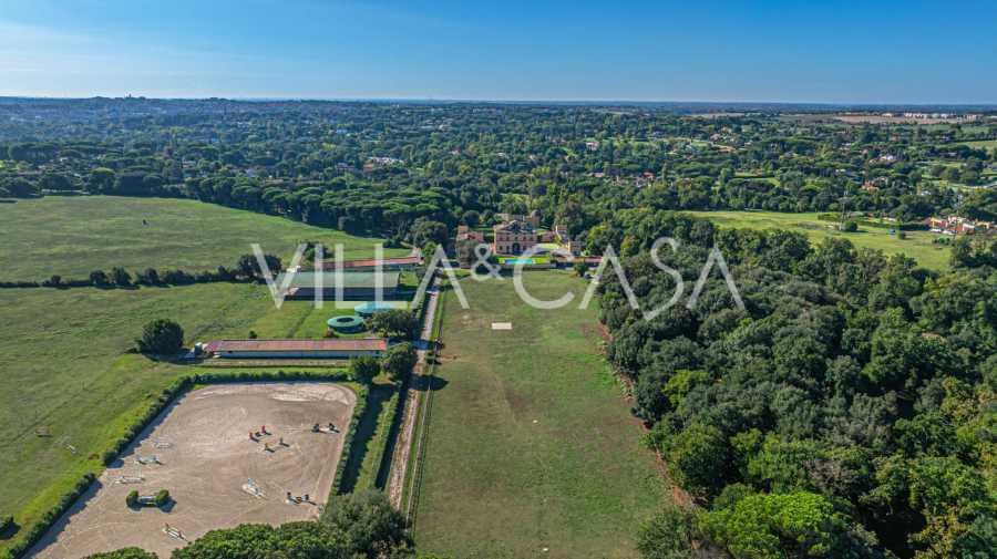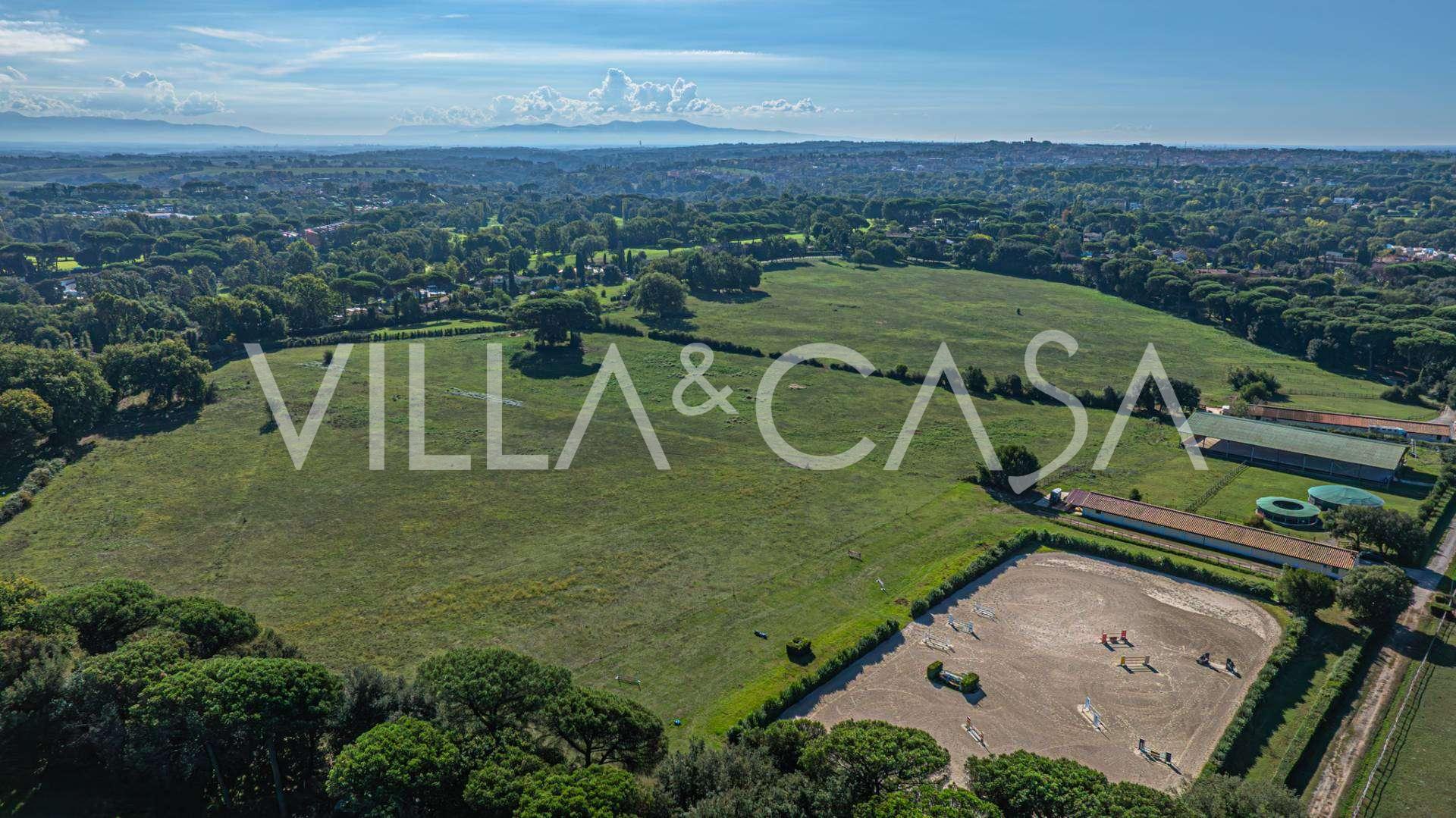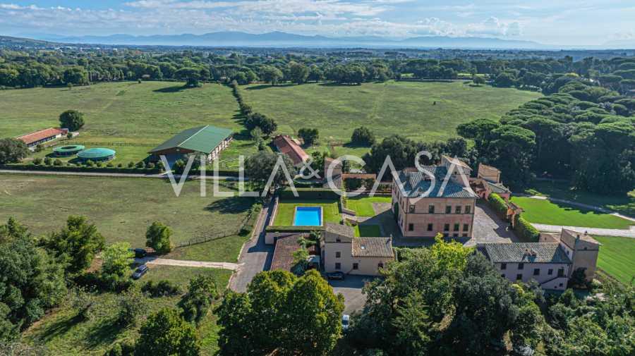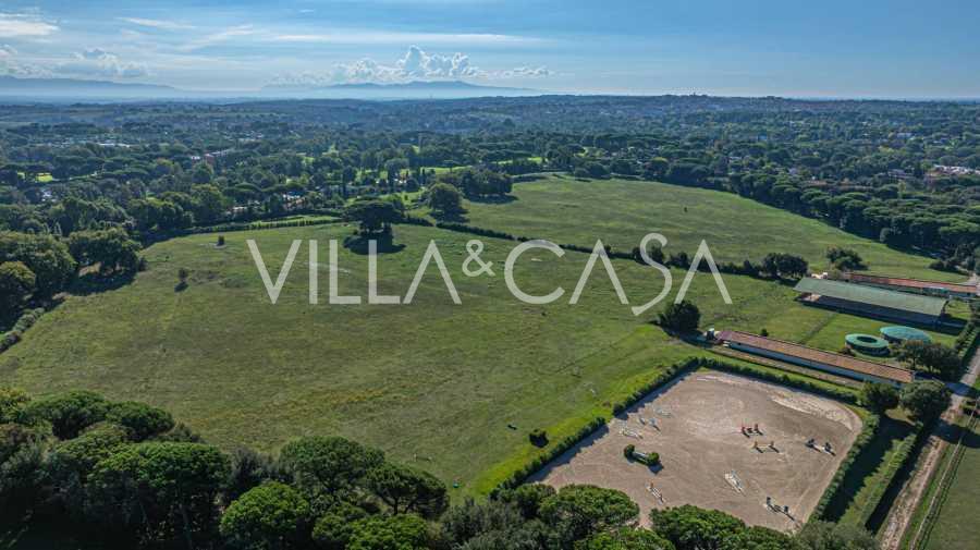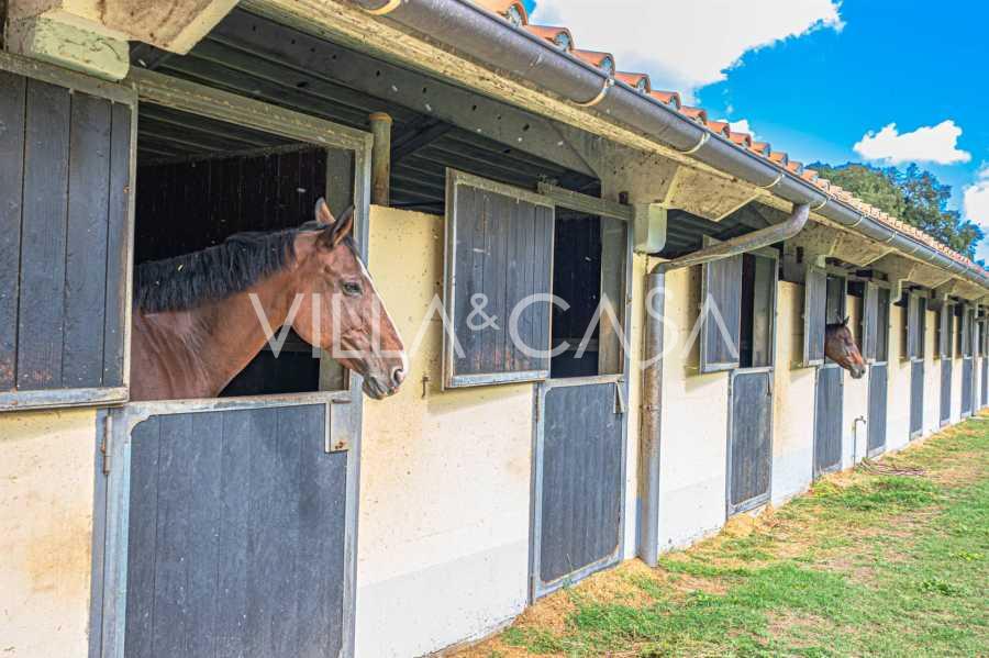 Die Burg, nur zwanzig Kilometer nördlich von Rom gelegen, ist von dreißig Hektar grüner Wiesen und alter Wälder umgeben, die eine Atmosphäre völliger Abgeschiedenheit und Harmonie mit der Natur schaffen. Hier wurde das berühmte Rennpferd Ribot geboren. Die Reitanlagen entsprechen höchsten internationalen Standards: zwei Ställe mit dreiundzwanzig und fünfundzwanzig Boxen — mit Sattelkammern, Pflegebereichen für Pferde und gemütlichen Personalwohnungen. Auf dem Gelände gibt es auch eine überdachte Reithalle, ein überdachtes Karussell und weitläufige Weiden, die sich für Training und Wettkämpfe eignen. Die Burg grenzt an einen der renommiertesten Golfclubs Europas und verfügt über einen eigenen Hubschrauberlandeplatz. Die alten etruskischen Höhlen auf dem Anwesen verleihen dem Ort besonderen Charme und historische Bedeutung.