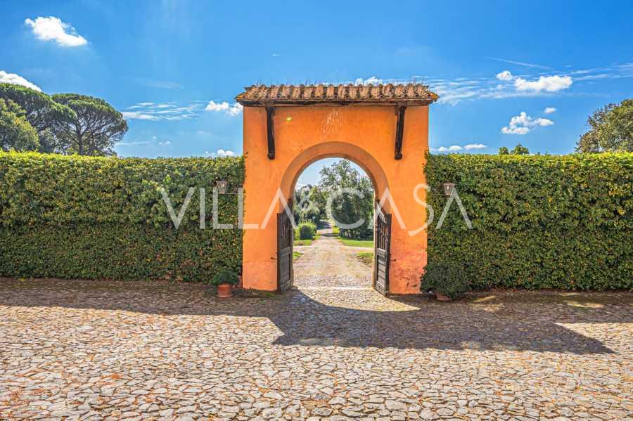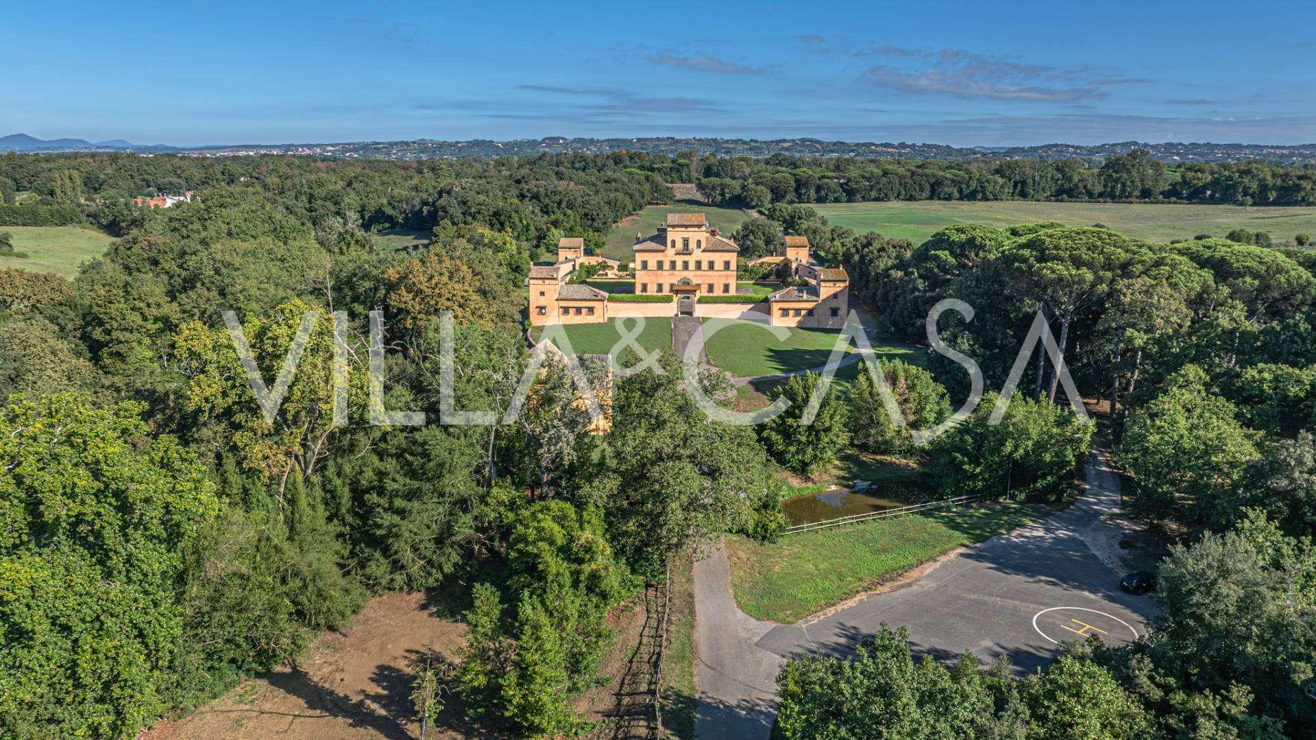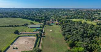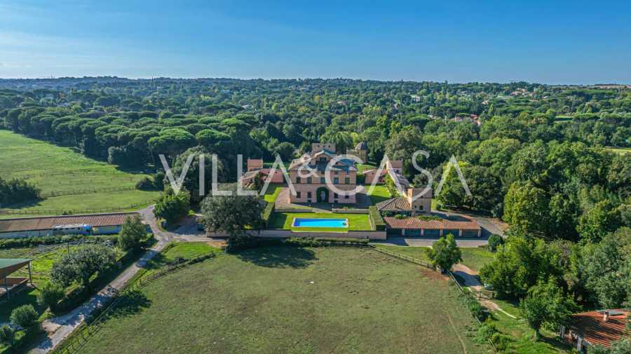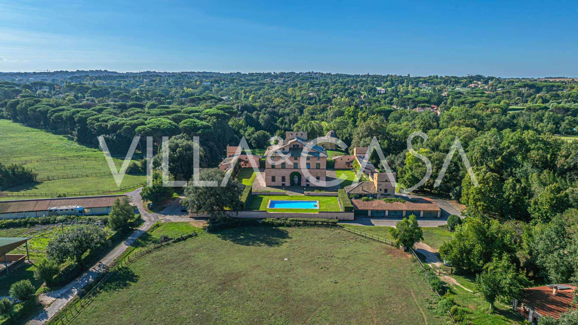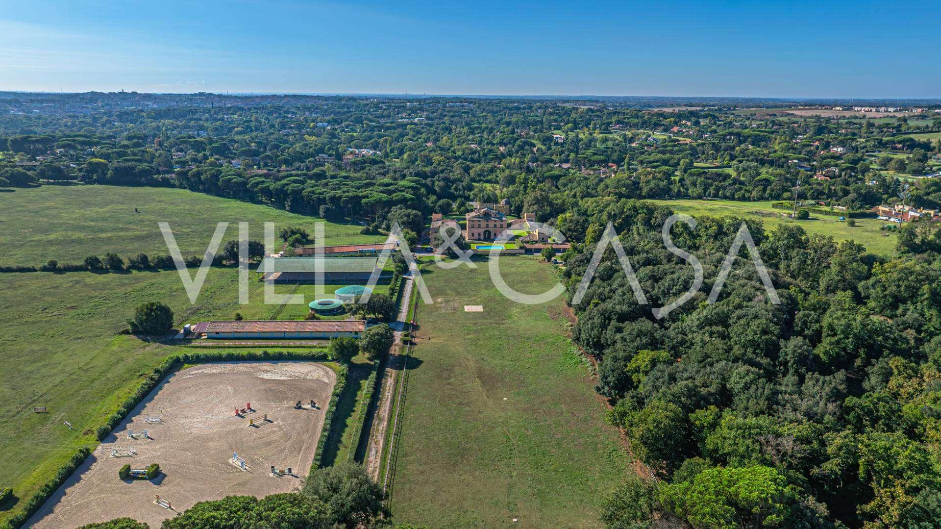 Die Burg, nur zwanzig Kilometer nördlich von Rom gelegen, ist von dreißig Hektar grüner Wiesen und alter Wälder umgeben, die eine Atmosphäre völliger Abgeschiedenheit und Harmonie mit der Natur schaffen. Hier wurde das berühmte Rennpferd Ribot geboren. Die Reitanlagen entsprechen höchsten internationalen Standards: zwei Ställe mit dreiundzwanzig und fünfundzwanzig Boxen — mit Sattelkammern, Pflegebereichen für Pferde und gemütlichen Personalwohnungen. Auf dem Gelände gibt es auch eine überdachte Reithalle, ein überdachtes Karussell und weitläufige Weiden, die sich für Training und Wettkämpfe eignen. Die Burg grenzt an einen der renommiertesten Golfclubs Europas und verfügt über einen eigenen Hubschrauberlandeplatz. Die alten etruskischen Höhlen auf dem Anwesen verleihen dem Ort besonderen Charme und historische Bedeutung.