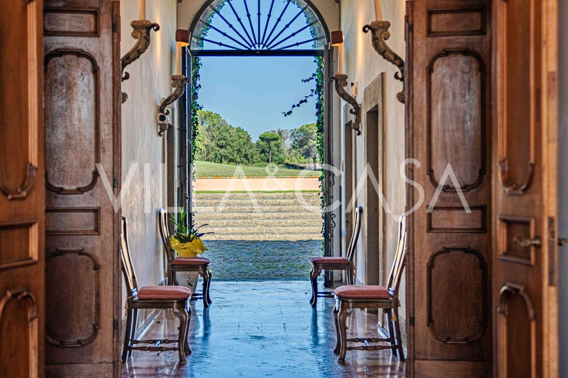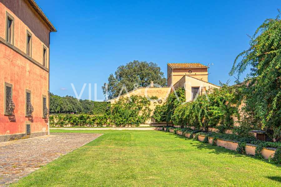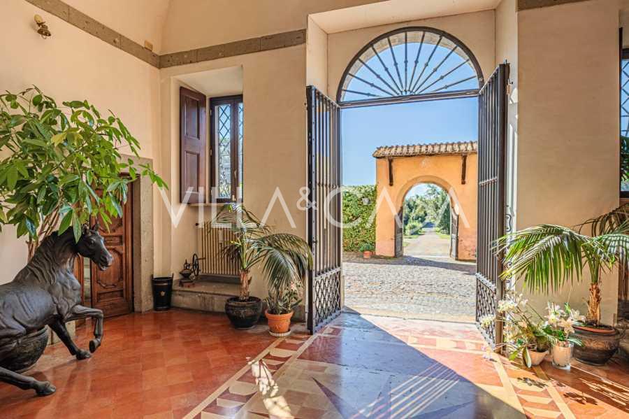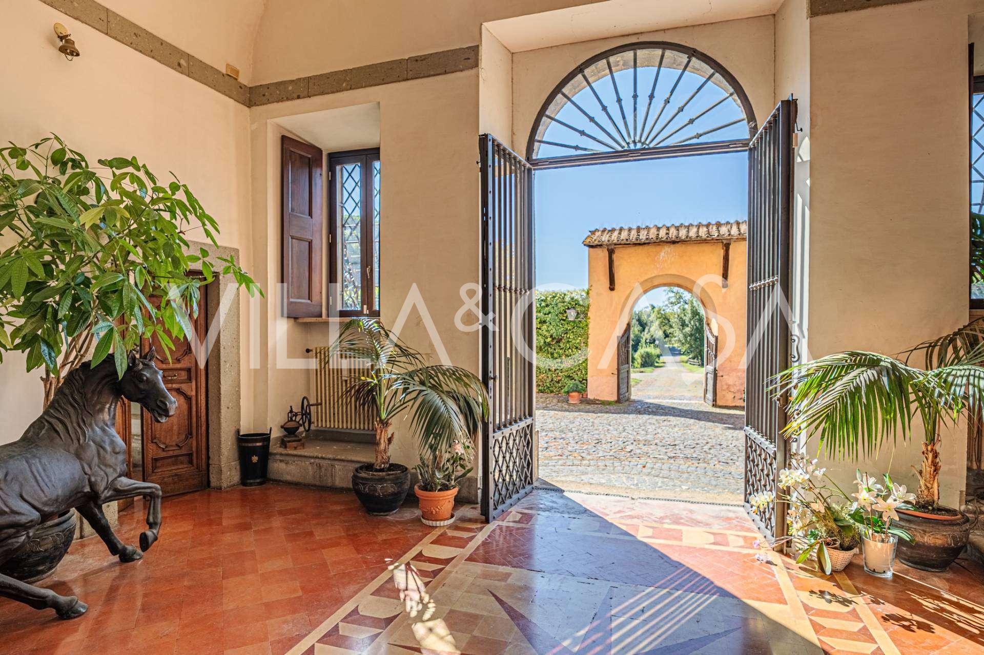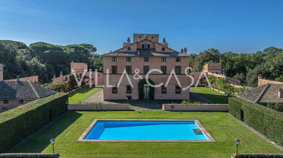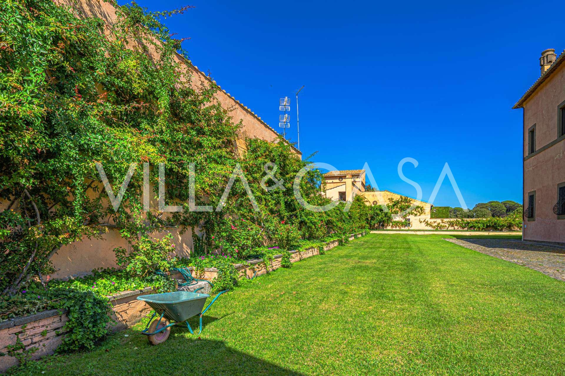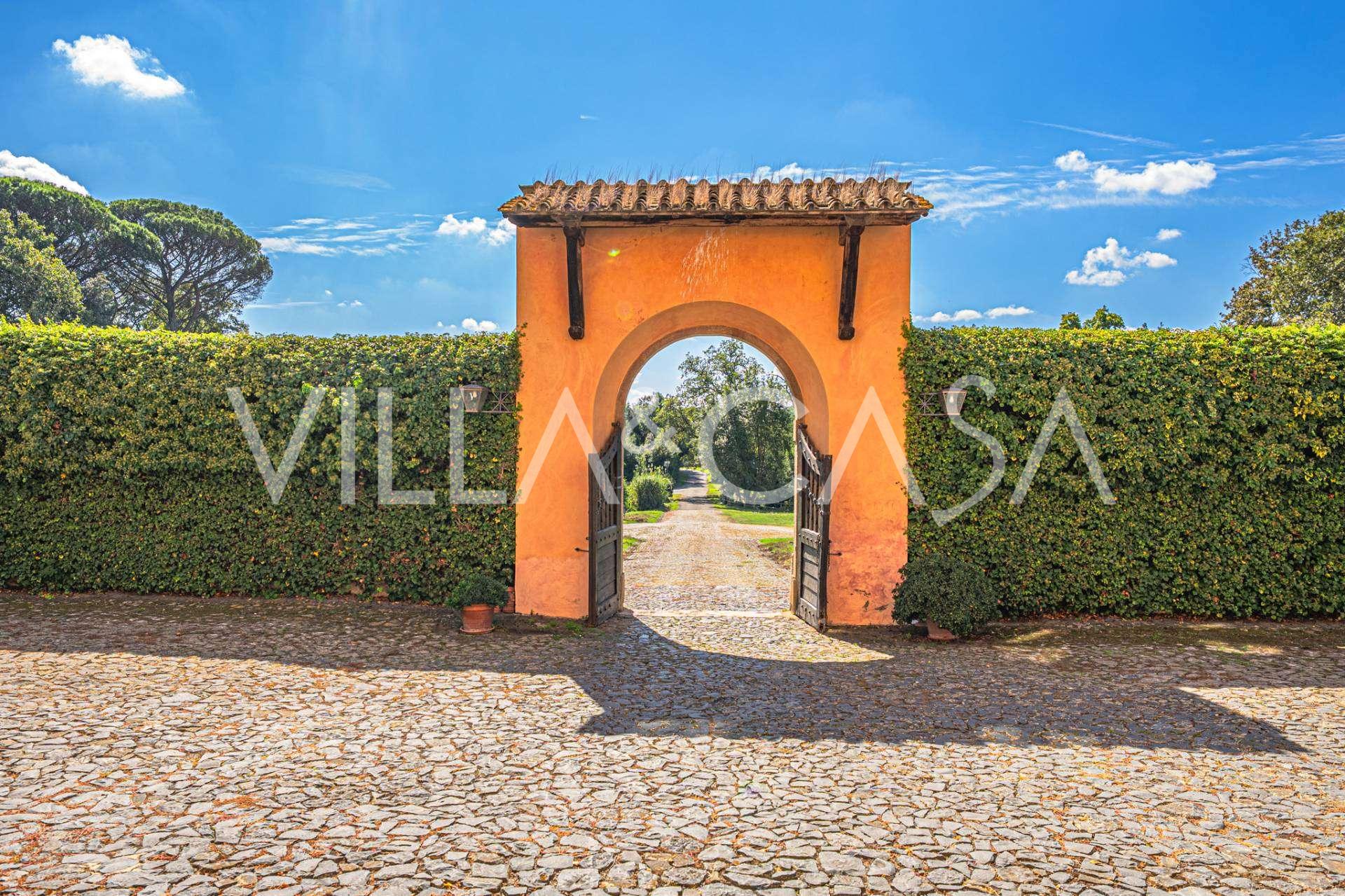 Die Burg, nur zwanzig Kilometer nördlich von Rom gelegen, ist von dreißig Hektar grüner Wiesen und alter Wälder umgeben, die eine Atmosphäre völliger Abgeschiedenheit und Harmonie mit der Natur schaffen. Hier wurde das berühmte Rennpferd Ribot geboren. Die Reitanlagen entsprechen höchsten internationalen Standards: zwei Ställe mit dreiundzwanzig und fünfundzwanzig Boxen — mit Sattelkammern, Pflegebereichen für Pferde und gemütlichen Personalwohnungen. Auf dem Gelände gibt es auch eine überdachte Reithalle, ein überdachtes Karussell und weitläufige Weiden, die sich für Training und Wettkämpfe eignen. Die Burg grenzt an einen der renommiertesten Golfclubs Europas und verfügt über einen eigenen Hubschrauberlandeplatz. Die alten etruskischen Höhlen auf dem Anwesen verleihen dem Ort besonderen Charme und historische Bedeutung.