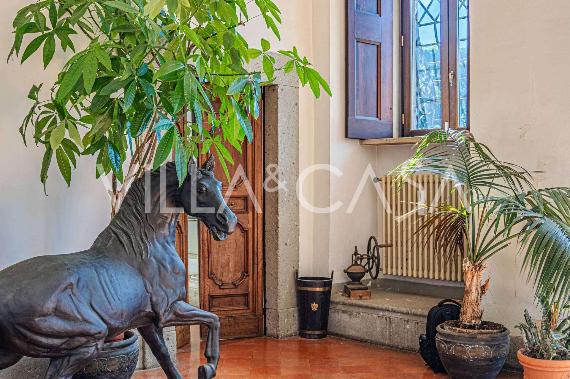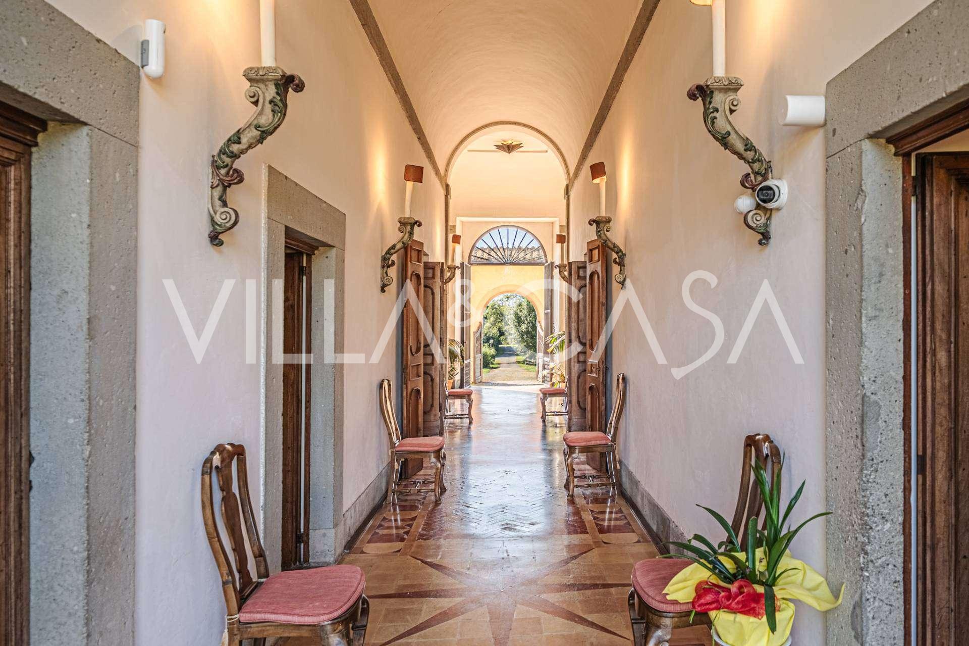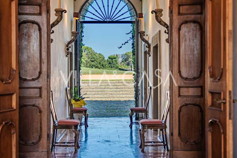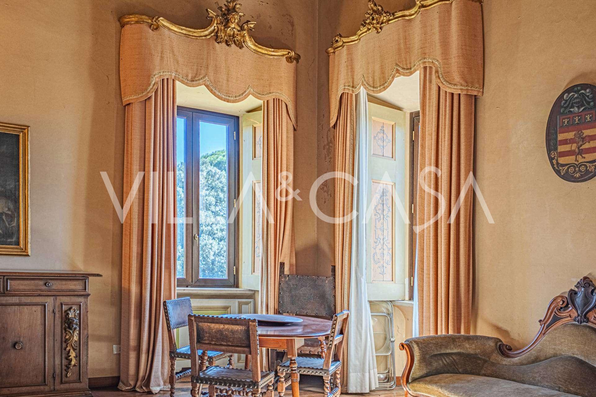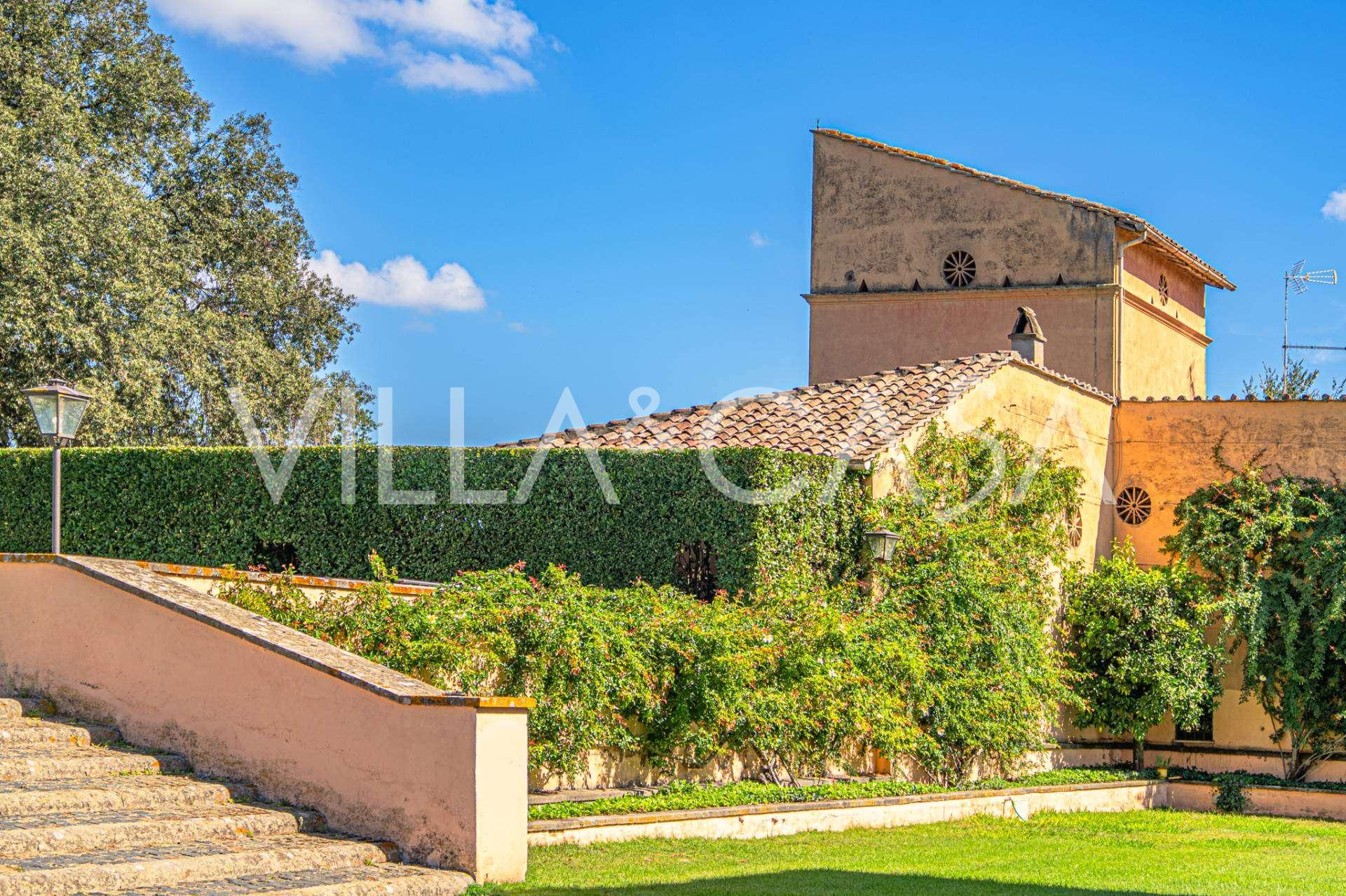 Die Burg, nur zwanzig Kilometer nördlich von Rom gelegen, ist von dreißig Hektar grüner Wiesen und alter Wälder umgeben, die eine Atmosphäre völliger Abgeschiedenheit und Harmonie mit der Natur schaffen. Hier wurde das berühmte Rennpferd Ribot geboren. Die Reitanlagen entsprechen höchsten internationalen Standards: zwei Ställe mit dreiundzwanzig und fünfundzwanzig Boxen — mit Sattelkammern, Pflegebereichen für Pferde und gemütlichen Personalwohnungen. Auf dem Gelände gibt es auch eine überdachte Reithalle, ein überdachtes Karussell und weitläufige Weiden, die sich für Training und Wettkämpfe eignen. Die Burg grenzt an einen der renommiertesten Golfclubs Europas und verfügt über einen eigenen Hubschrauberlandeplatz. Die alten etruskischen Höhlen auf dem Anwesen verleihen dem Ort besonderen Charme und historische Bedeutung.