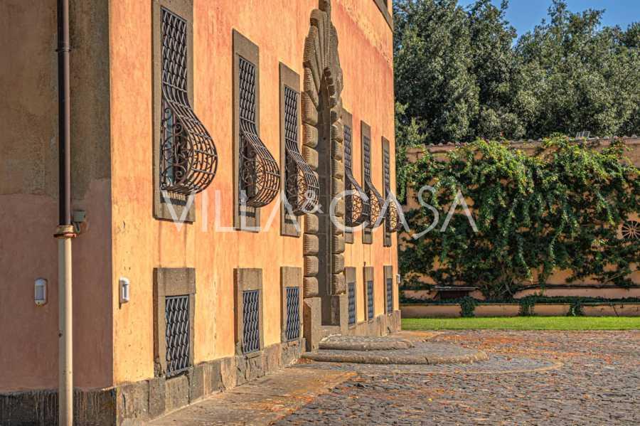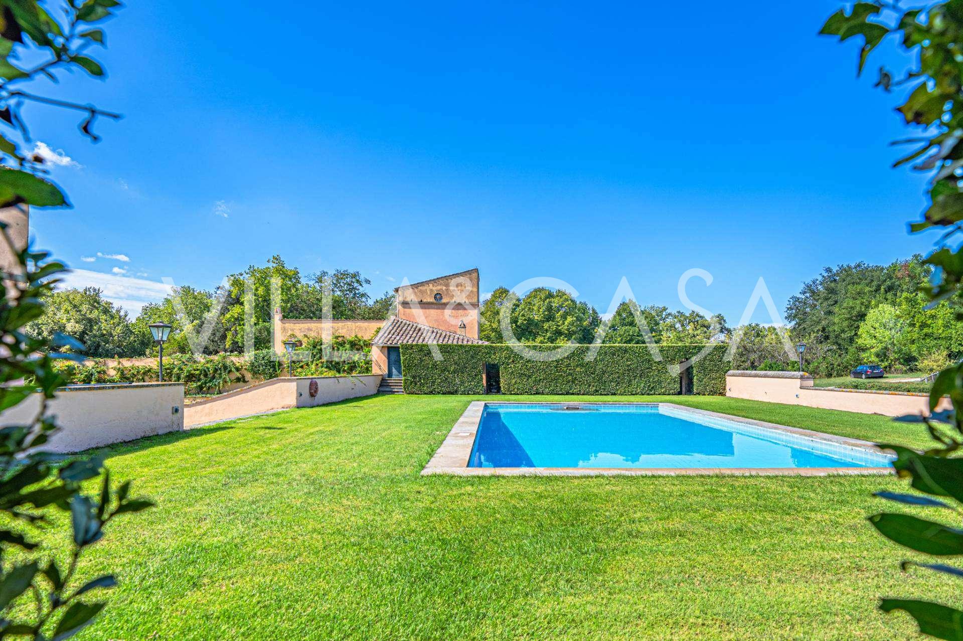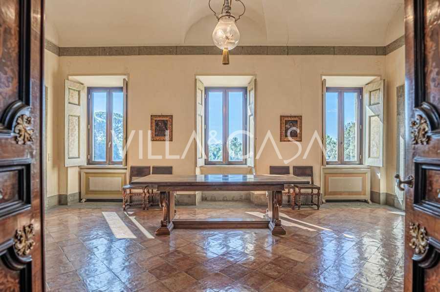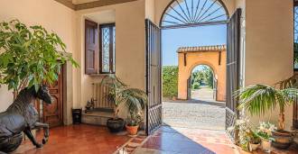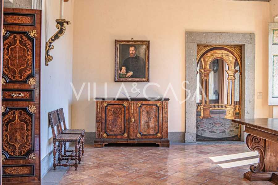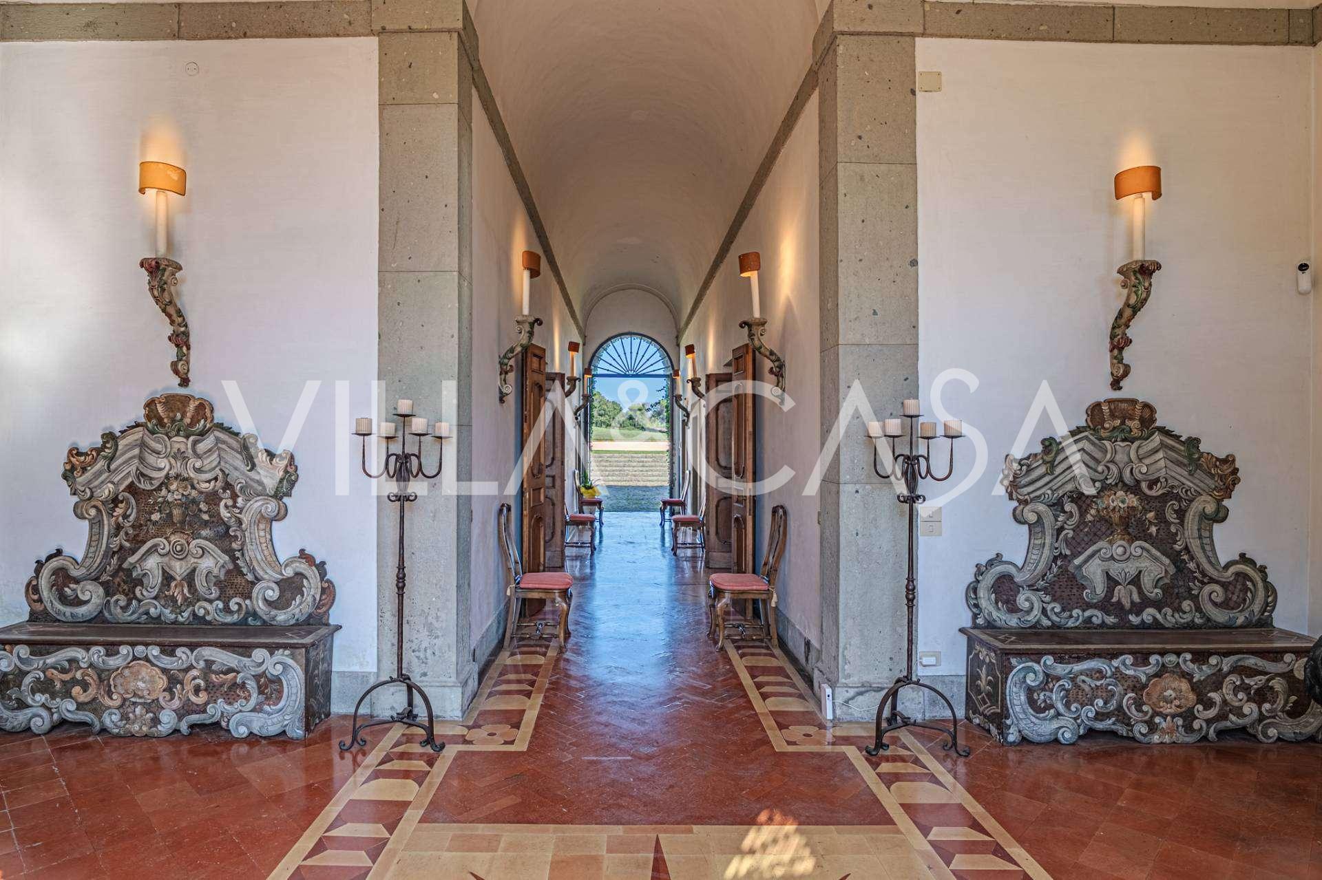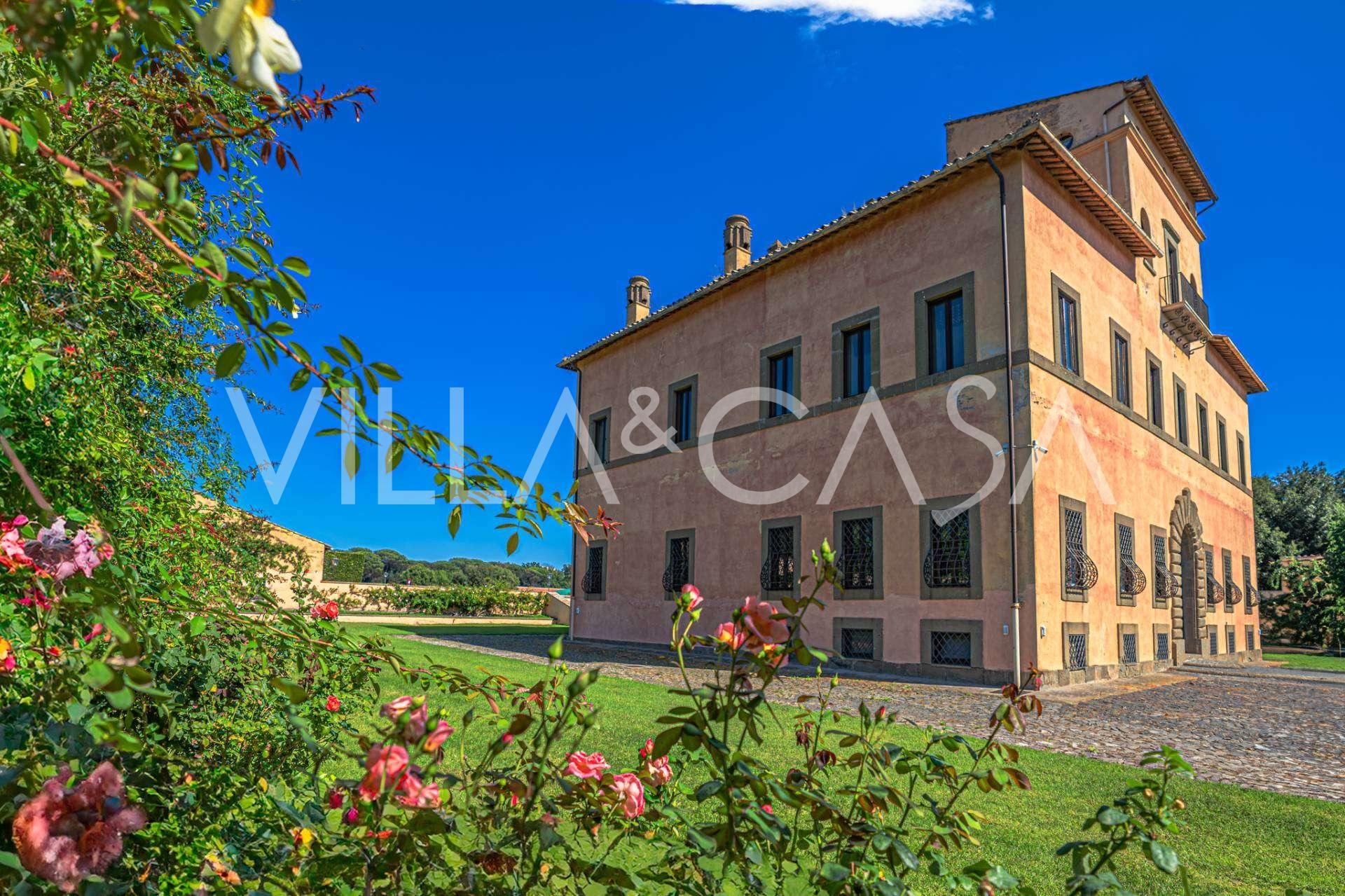 Die Burg, nur zwanzig Kilometer nördlich von Rom gelegen, ist von dreißig Hektar grüner Wiesen und alter Wälder umgeben, die eine Atmosphäre völliger Abgeschiedenheit und Harmonie mit der Natur schaffen. Hier wurde das berühmte Rennpferd Ribot geboren. Die Reitanlagen entsprechen höchsten internationalen Standards: zwei Ställe mit dreiundzwanzig und fünfundzwanzig Boxen — mit Sattelkammern, Pflegebereichen für Pferde und gemütlichen Personalwohnungen. Auf dem Gelände gibt es auch eine überdachte Reithalle, ein überdachtes Karussell und weitläufige Weiden, die sich für Training und Wettkämpfe eignen. Die Burg grenzt an einen der renommiertesten Golfclubs Europas und verfügt über einen eigenen Hubschrauberlandeplatz. Die alten etruskischen Höhlen auf dem Anwesen verleihen dem Ort besonderen Charme und historische Bedeutung.