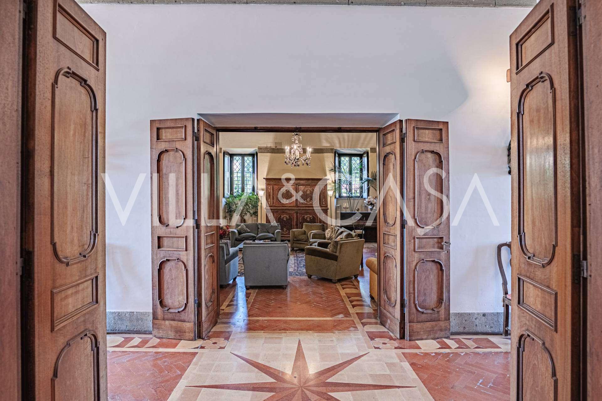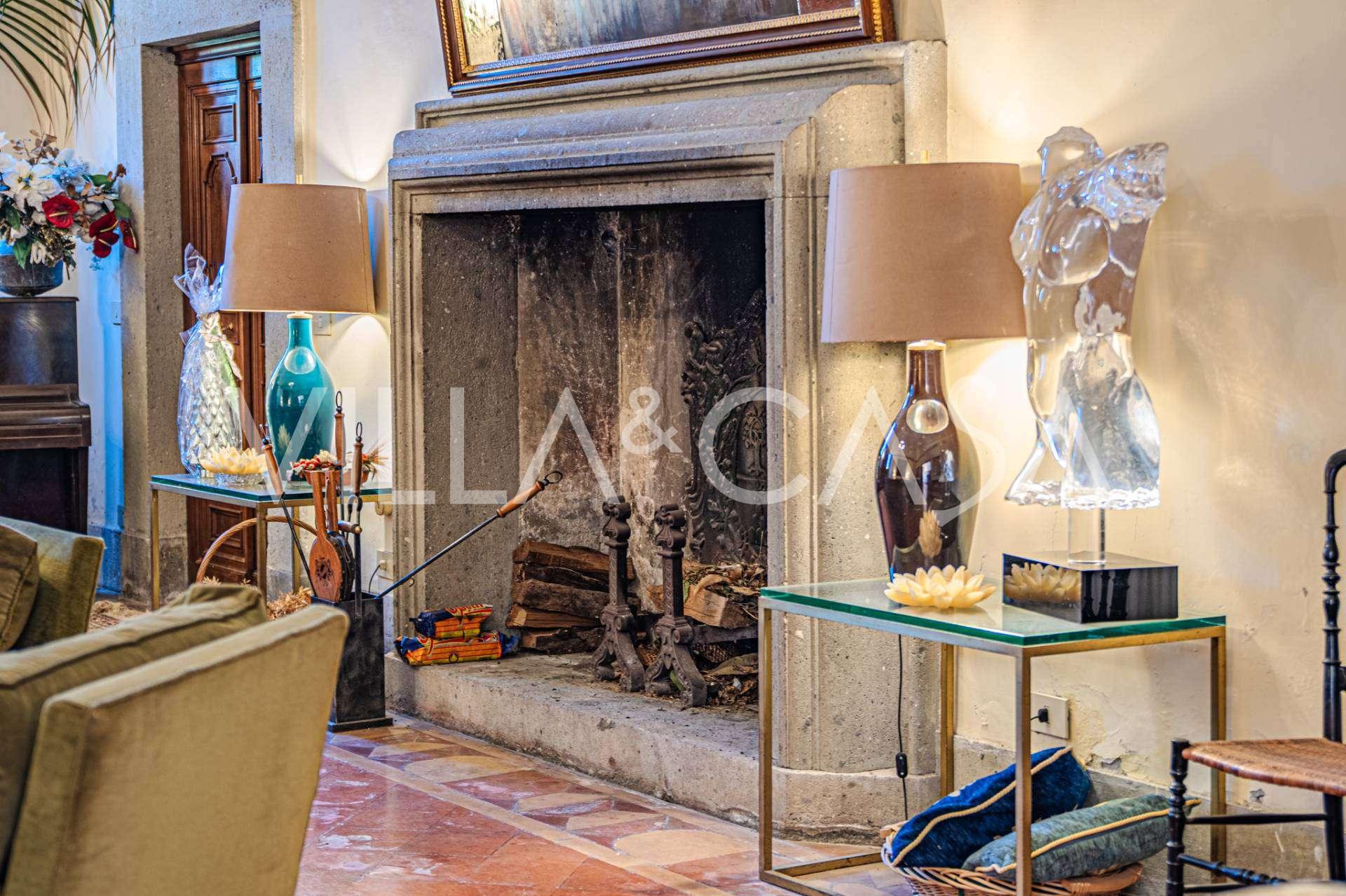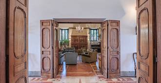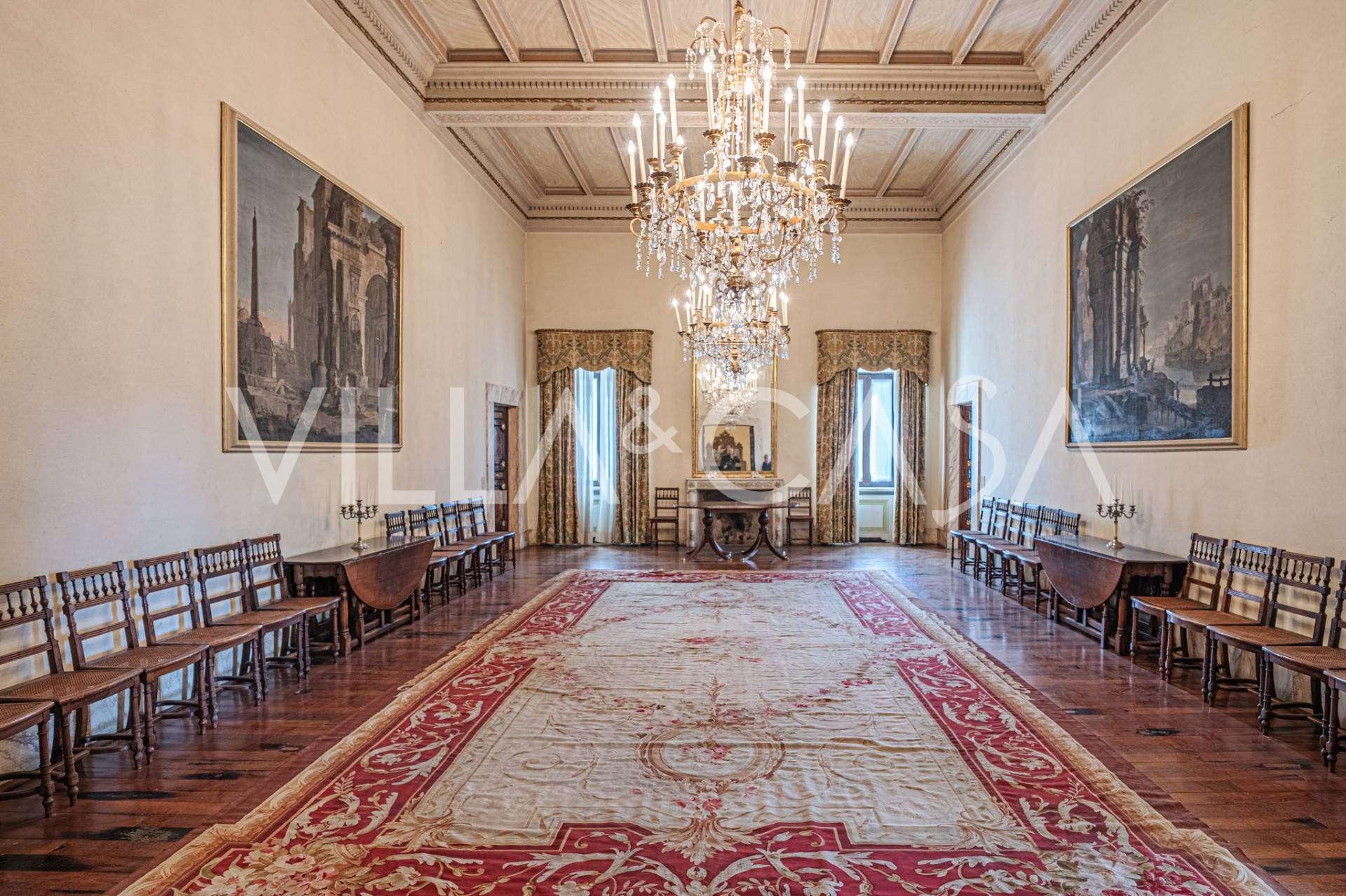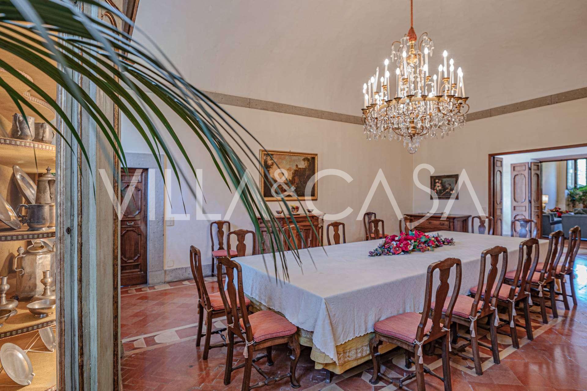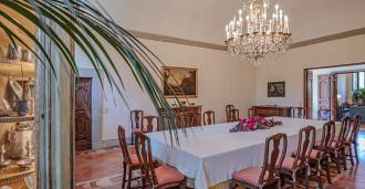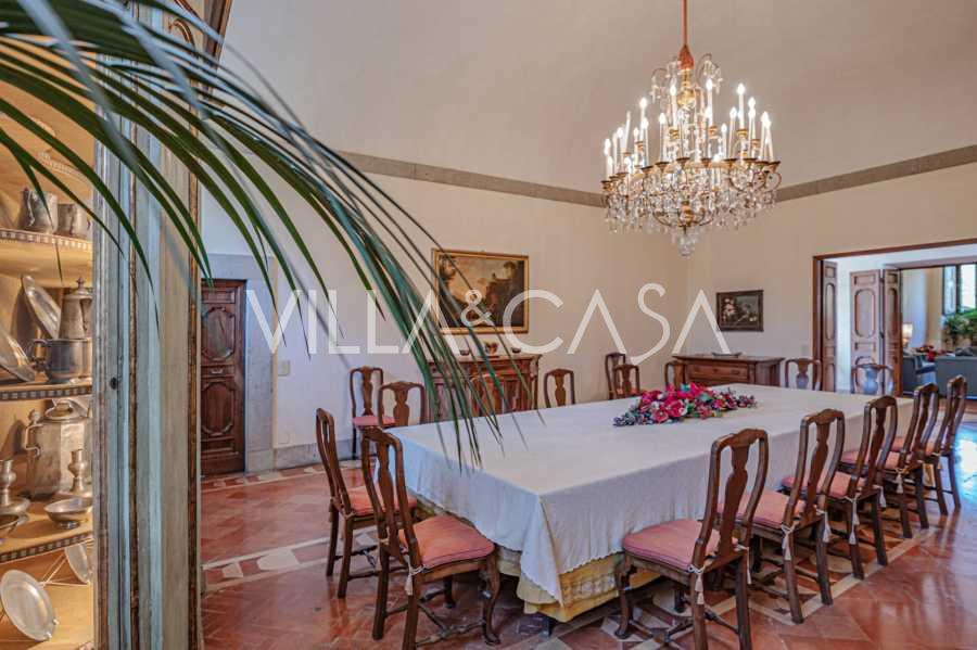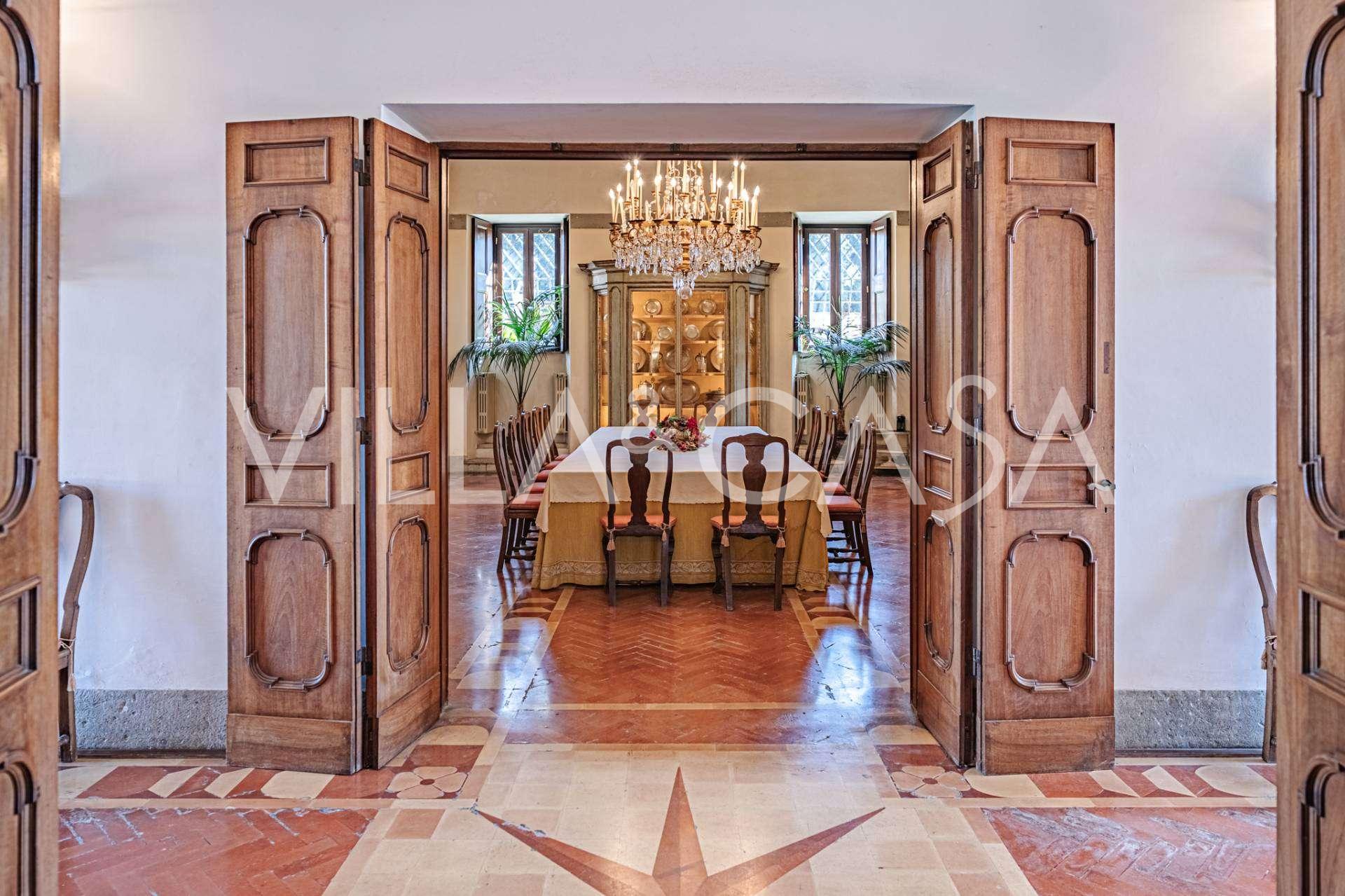 Im Erdgeschoss befinden sich geräumige Empfangsräume, ein Büro, ein Schlafzimmer, drei Badezimmer, ein elegantes Esszimmer und eine große Küche, die sich auf der unteren Ebene fortsetzt, wo sich ein Bankettsaal befindet, der sich ideal für Feierlichkeiten eignet.