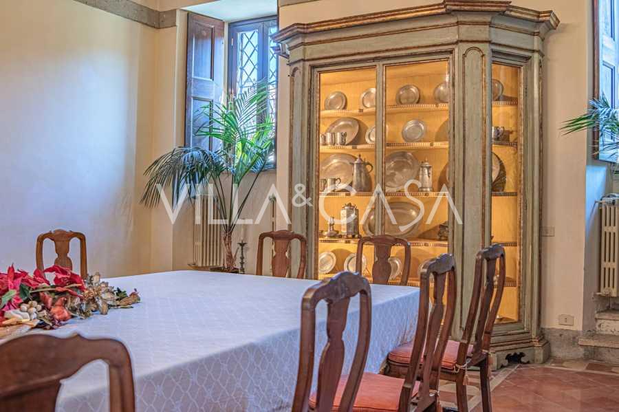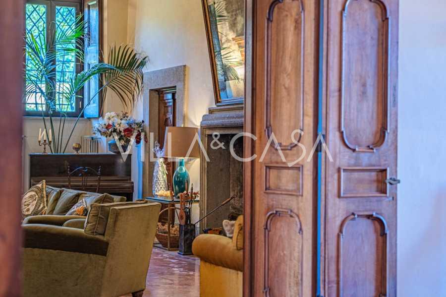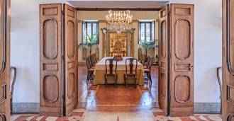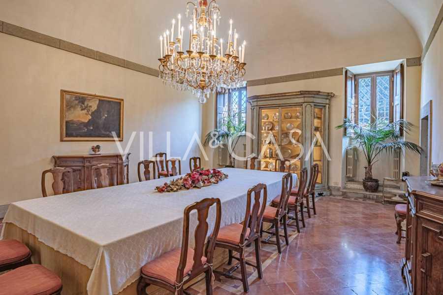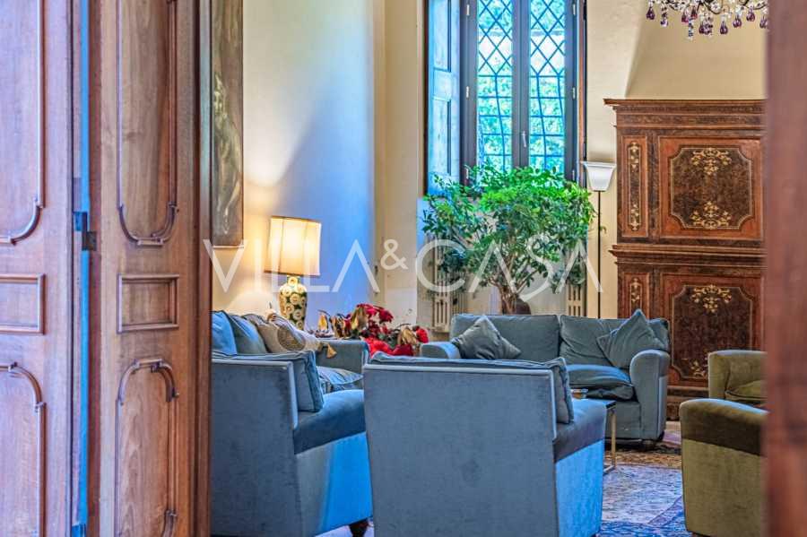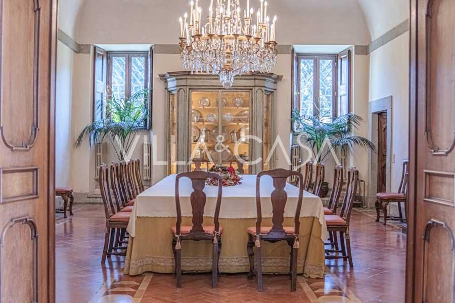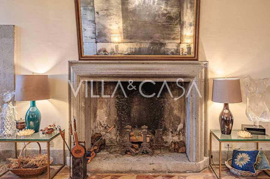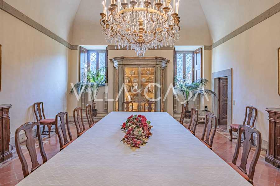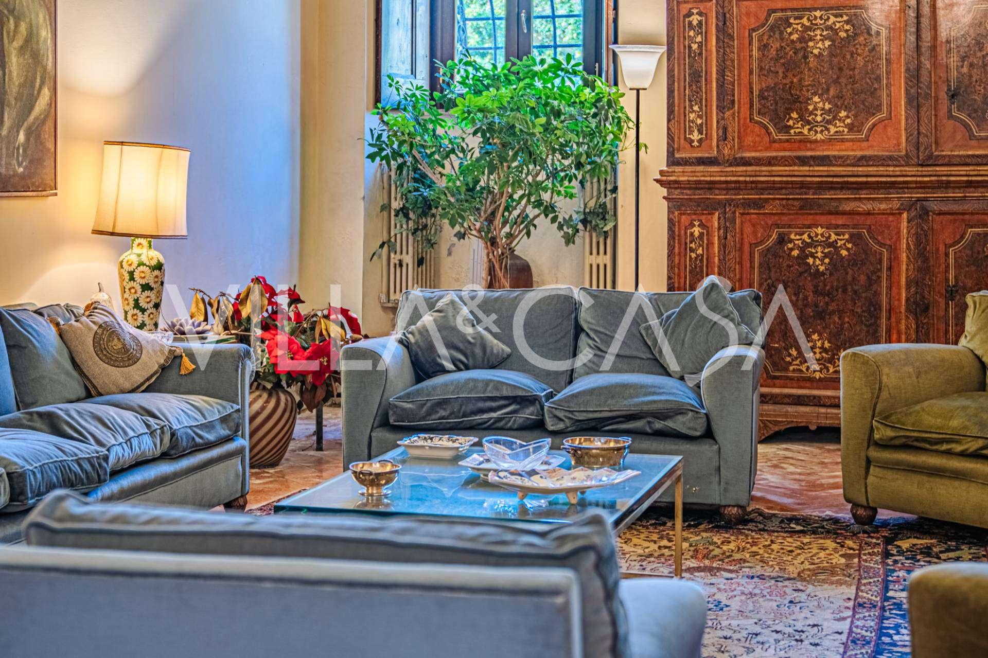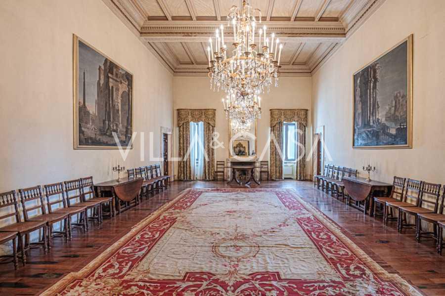 Im Erdgeschoss befinden sich geräumige Empfangsräume, ein Büro, ein Schlafzimmer, drei Badezimmer, ein elegantes Esszimmer und eine große Küche, die sich auf der unteren Ebene fortsetzt, wo sich ein Bankettsaal befindet, der sich ideal für Feierlichkeiten eignet.
