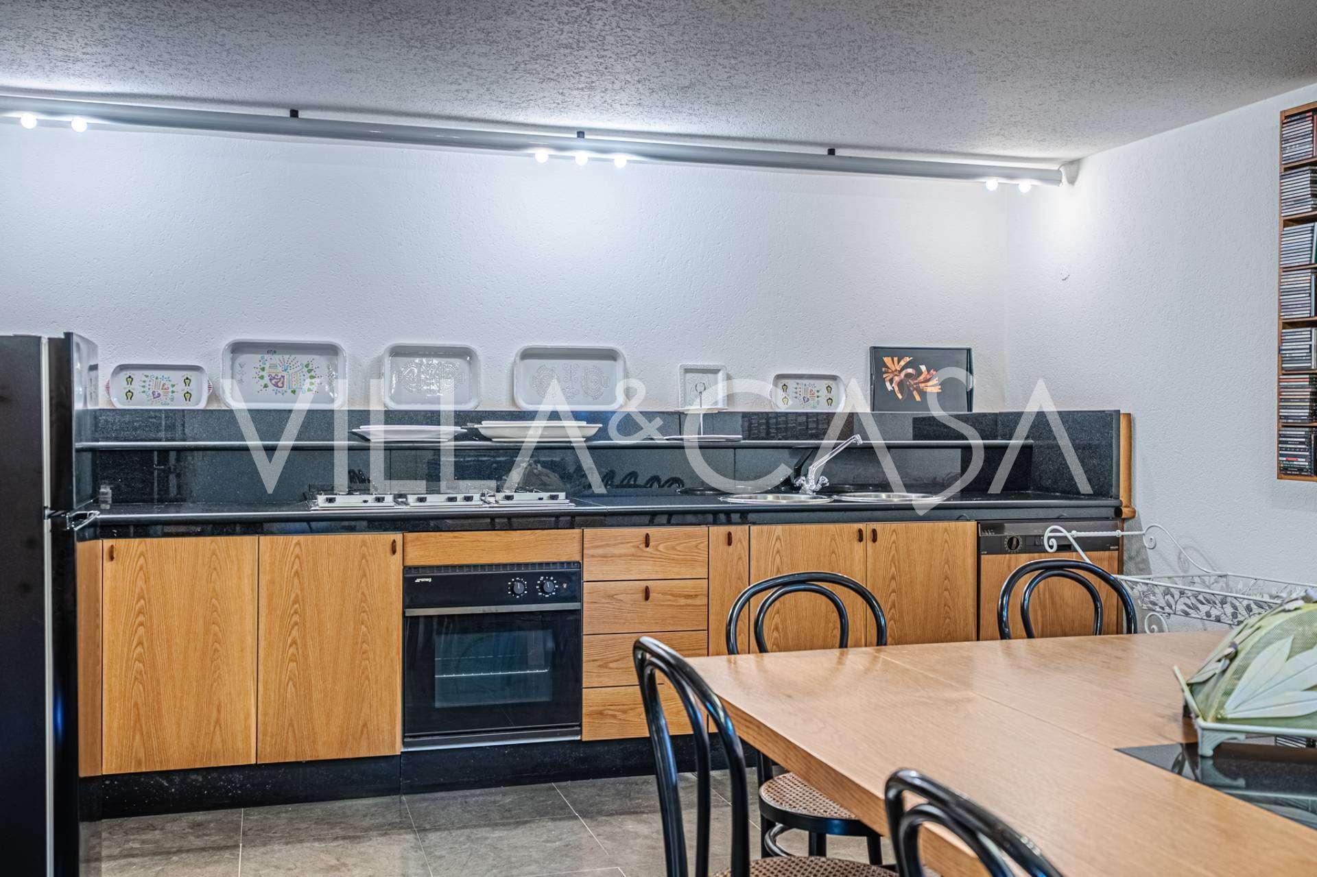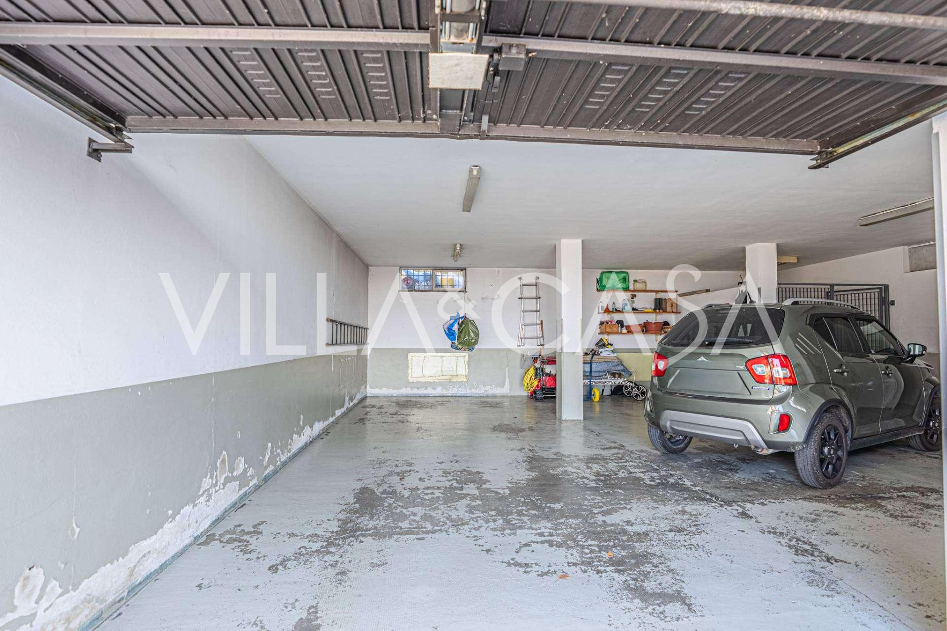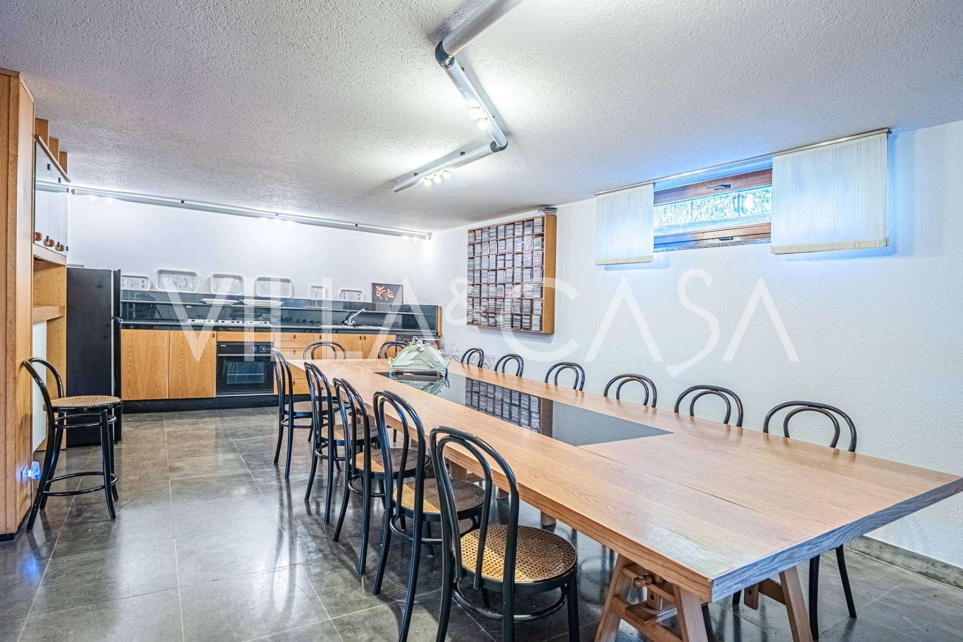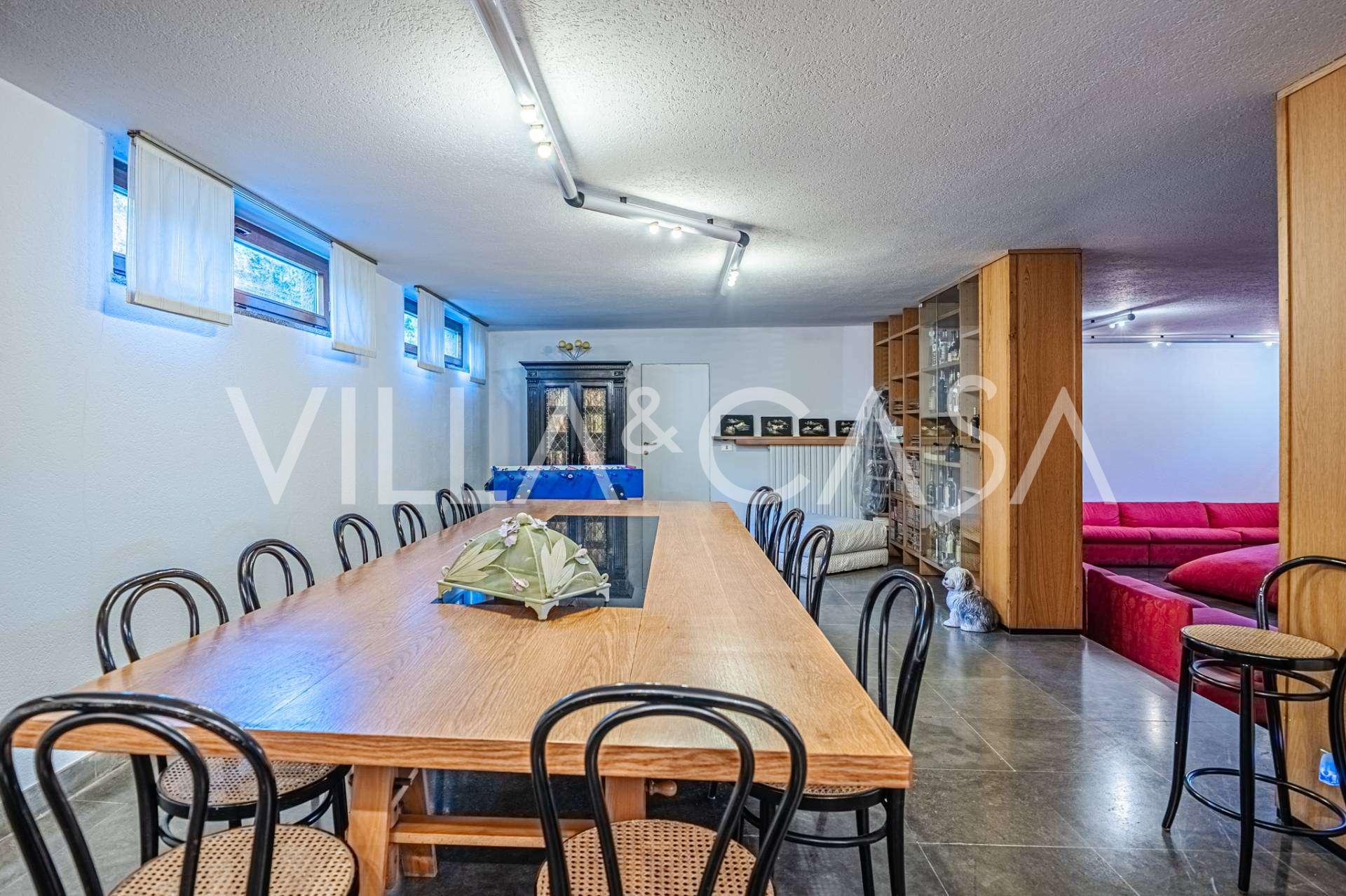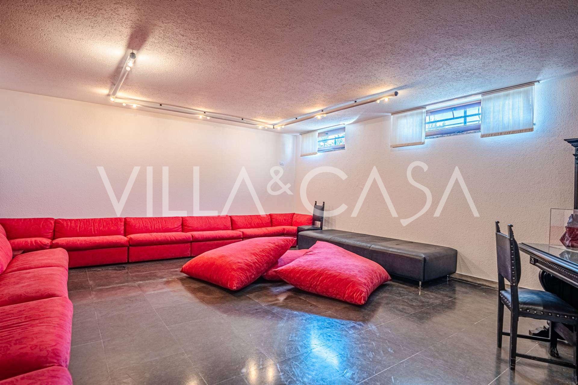Kellergeschoss: zwei separate Eingänge, ein geräumiger Doppelwohnraum mit Panoramafenstern und Zugang zur Terrasse und zum Garten, moderne Küche, Esszimmer, Arbeitszimmer und Gästetoilette.