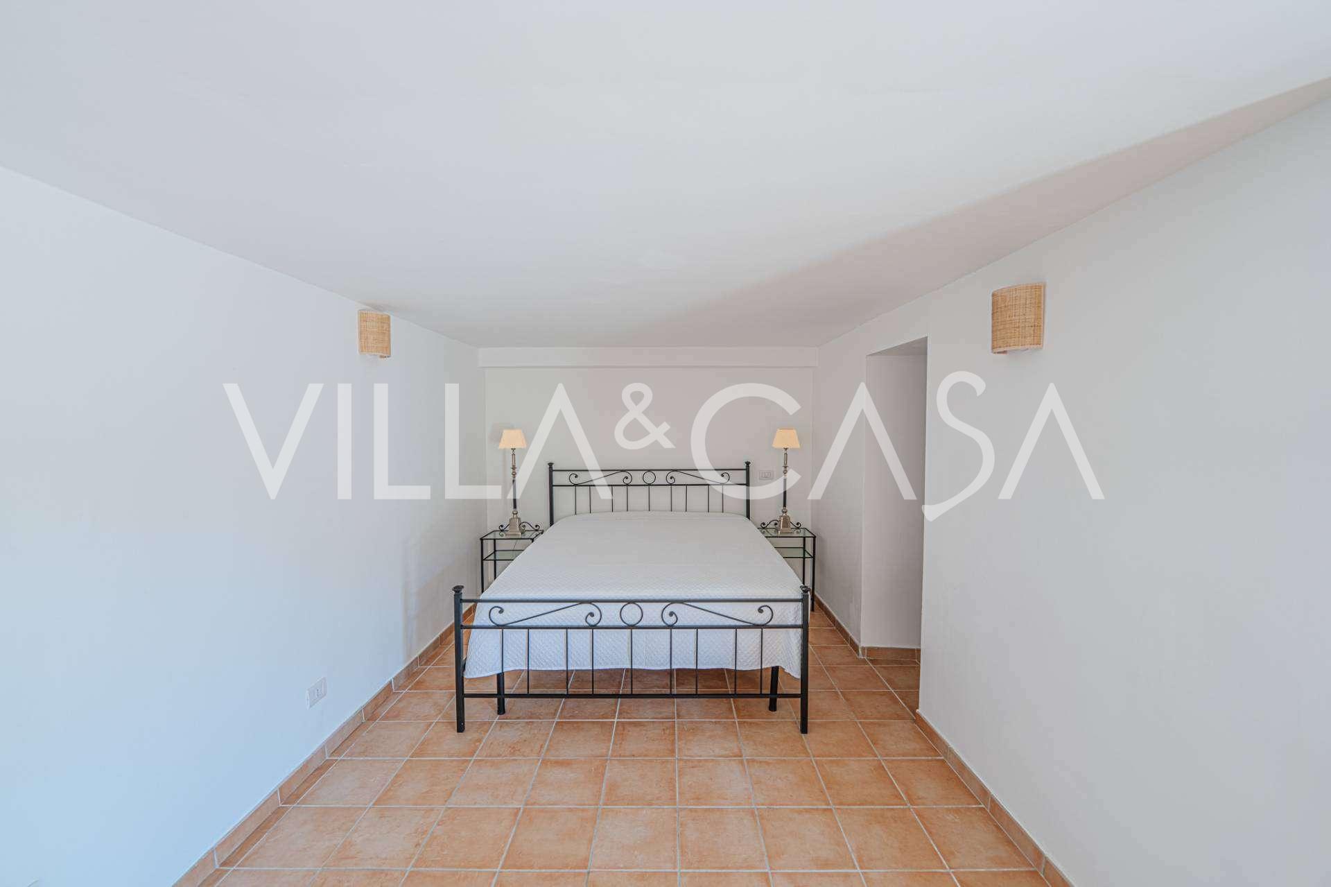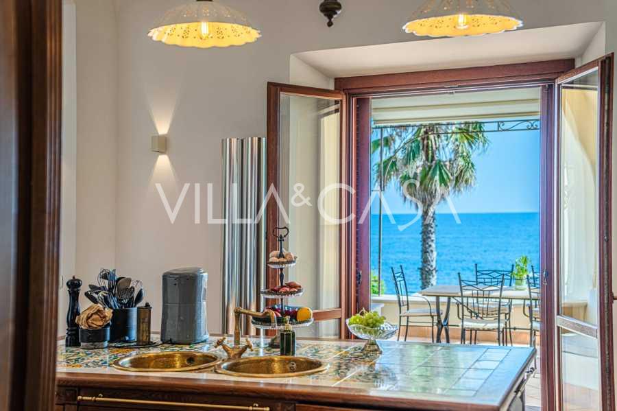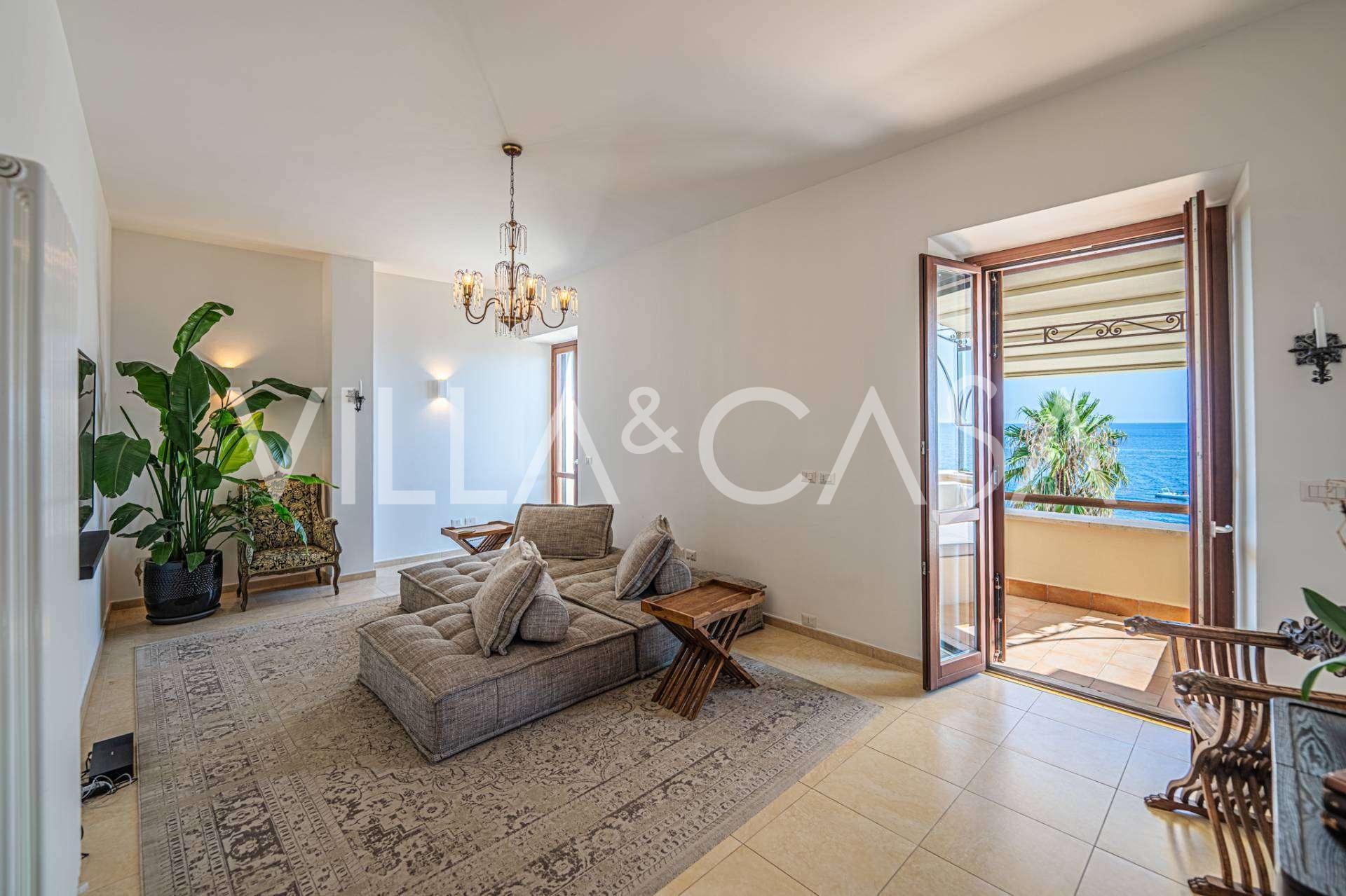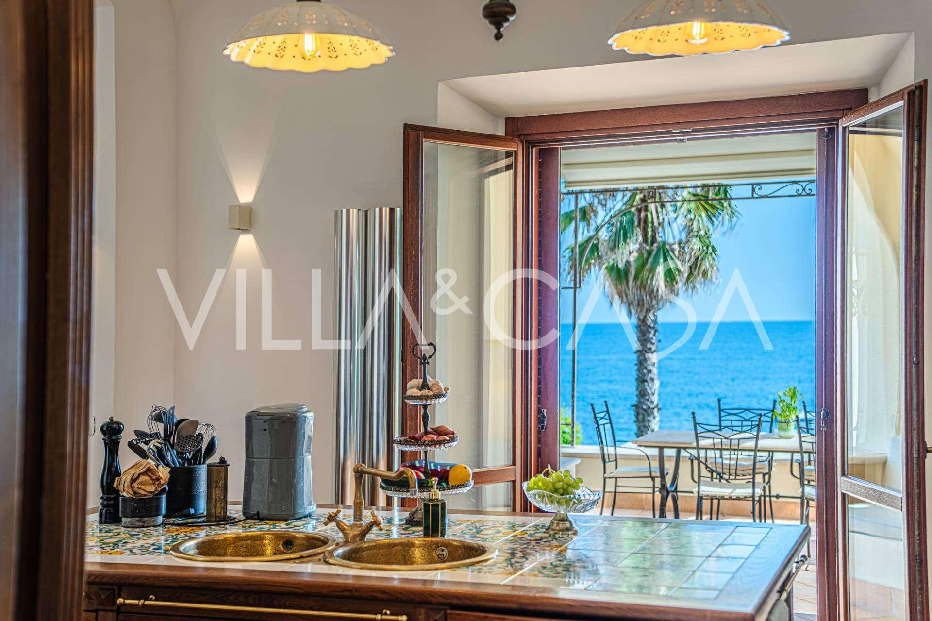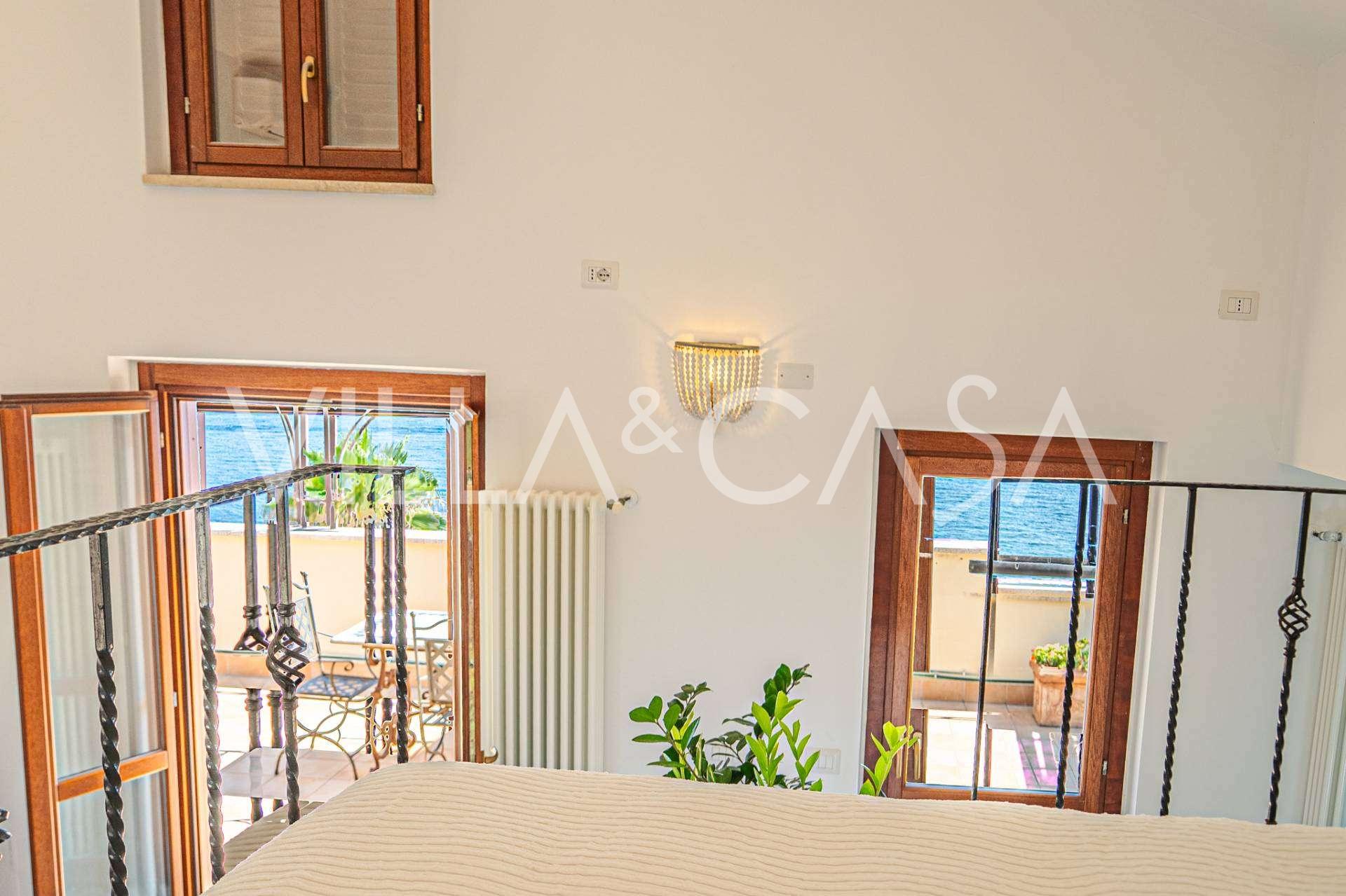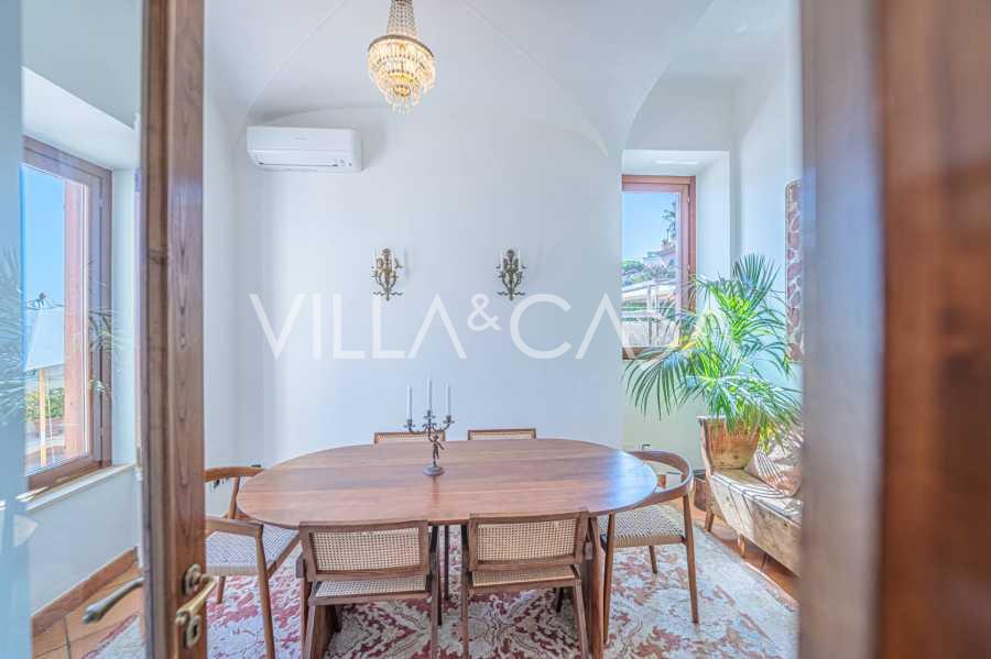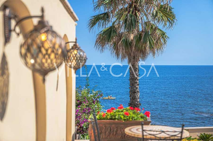 Die Fenster bieten einen 180-Grad-Panoramablick auf das Meer, der blaue Horizont füllt jeden Innenraum und erstreckt sich bis zu den weitläufigen Panoramaterrassen. Die Innenräume, mit Deckenhöhen von über drei Metern, Terrakottaböden aus der damaligen Zeit, einer Marmortreppe und einem Kamin, schaffen eine Atmosphäre von raffinierter, zeitloser Eleganz.