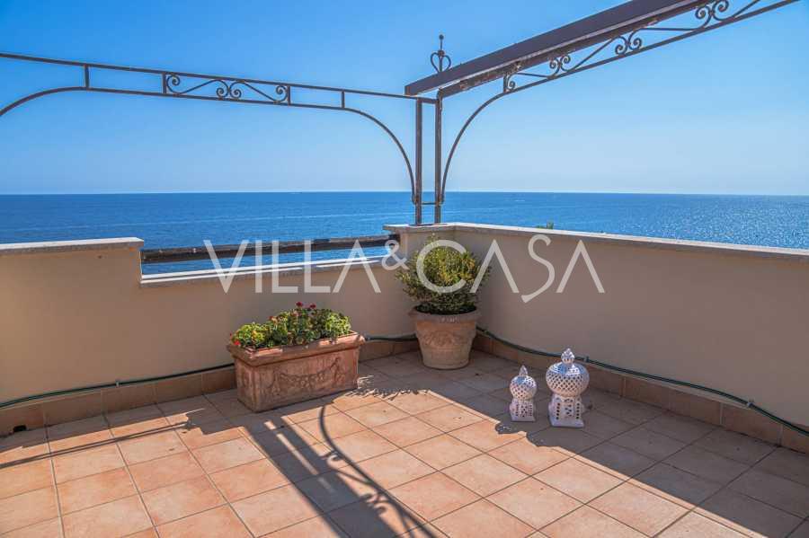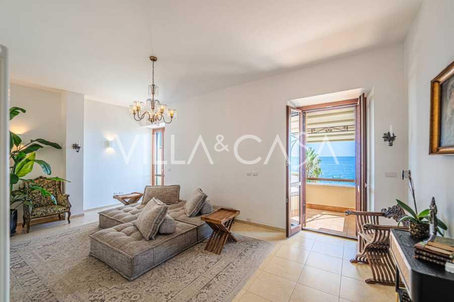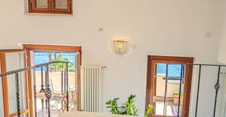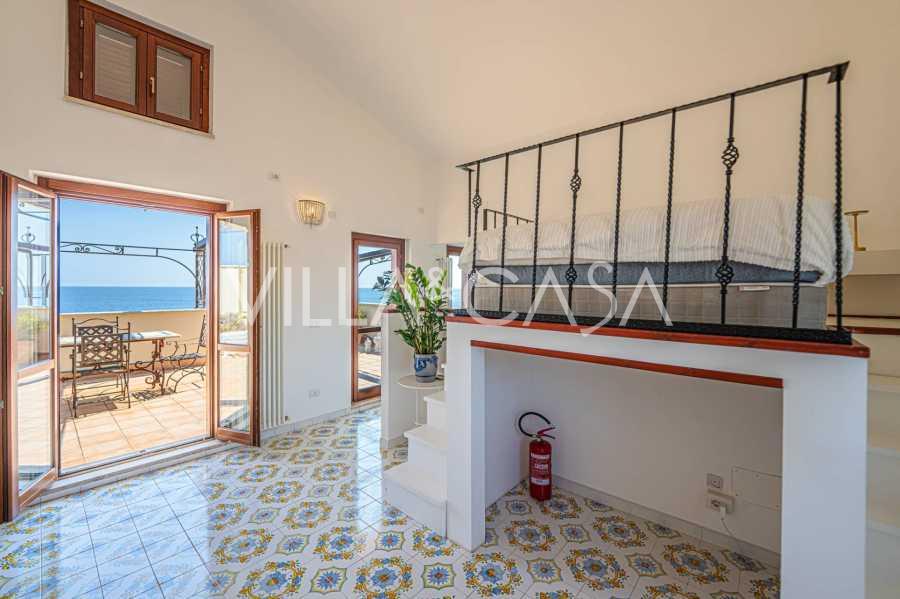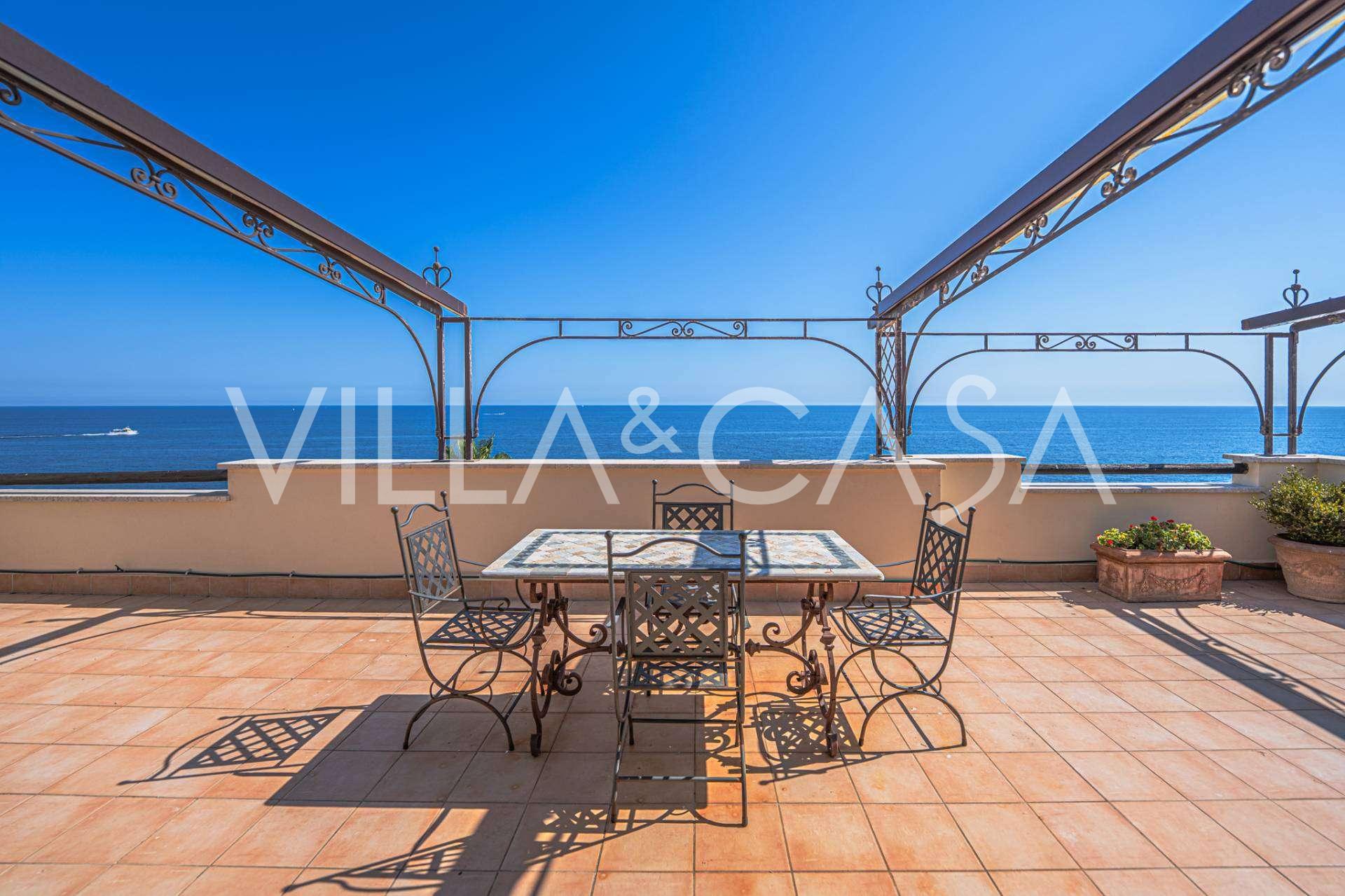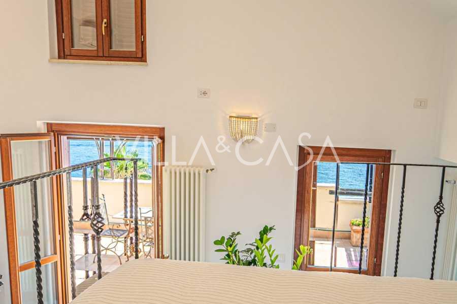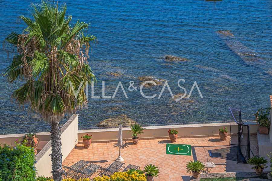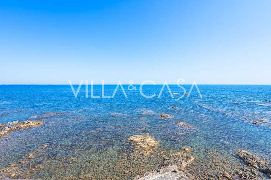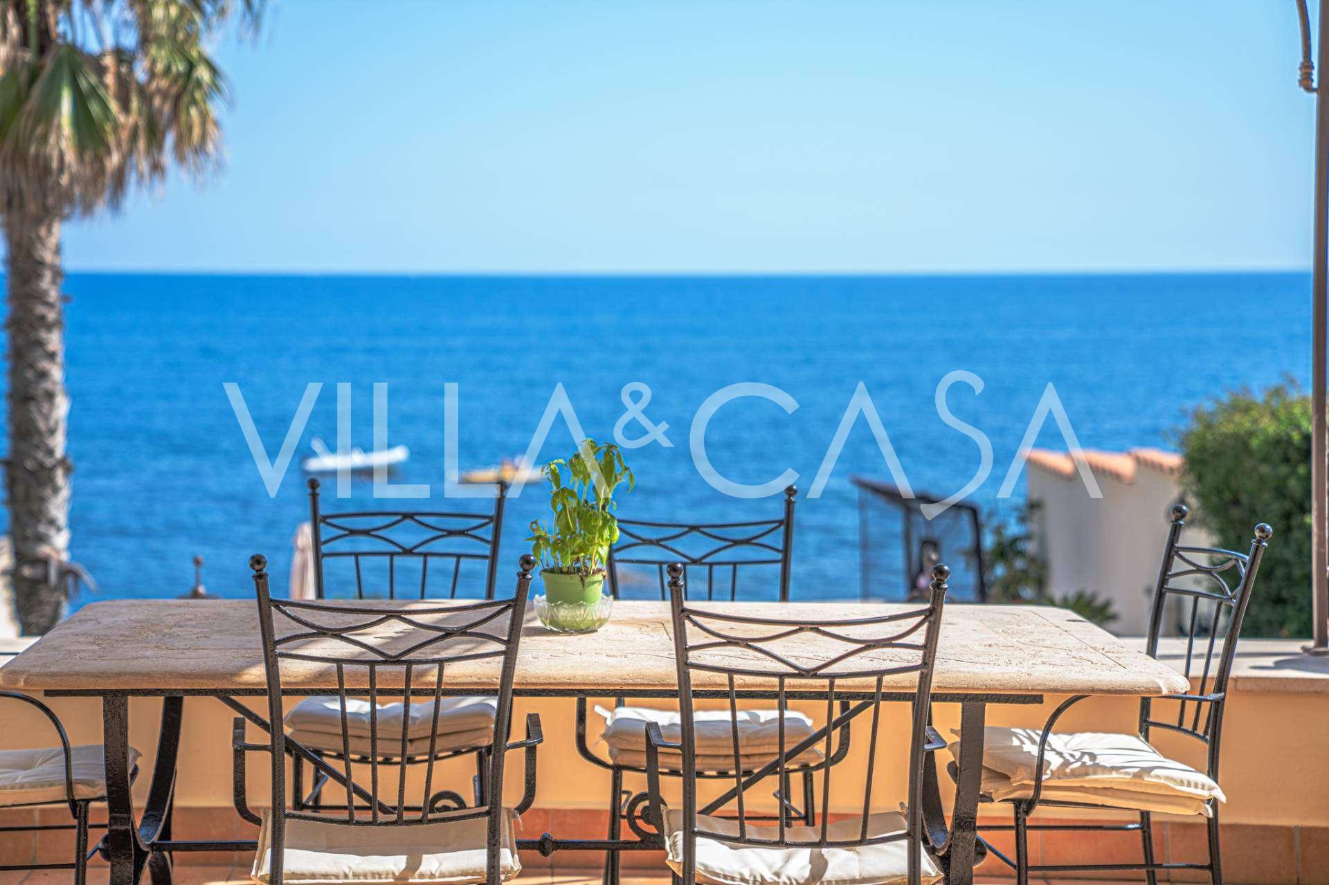 Die Fenster bieten einen 180-Grad-Panoramablick auf das Meer, der blaue Horizont füllt jeden Innenraum und erstreckt sich bis zu den weitläufigen Panoramaterrassen. Die Innenräume, mit Deckenhöhen von über drei Metern, Terrakottaböden aus der damaligen Zeit, einer Marmortreppe und einem Kamin, schaffen eine Atmosphäre von raffinierter, zeitloser Eleganz.