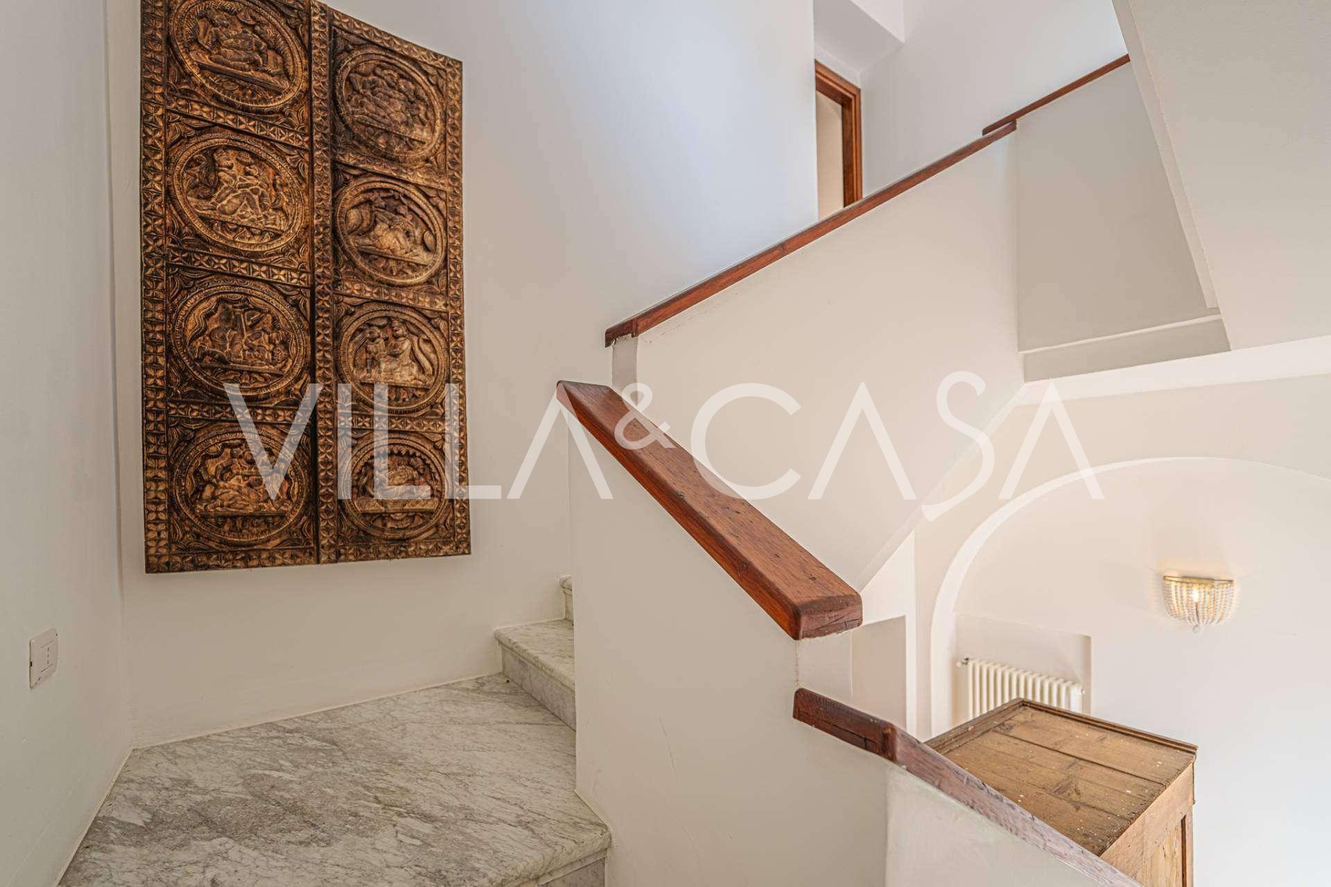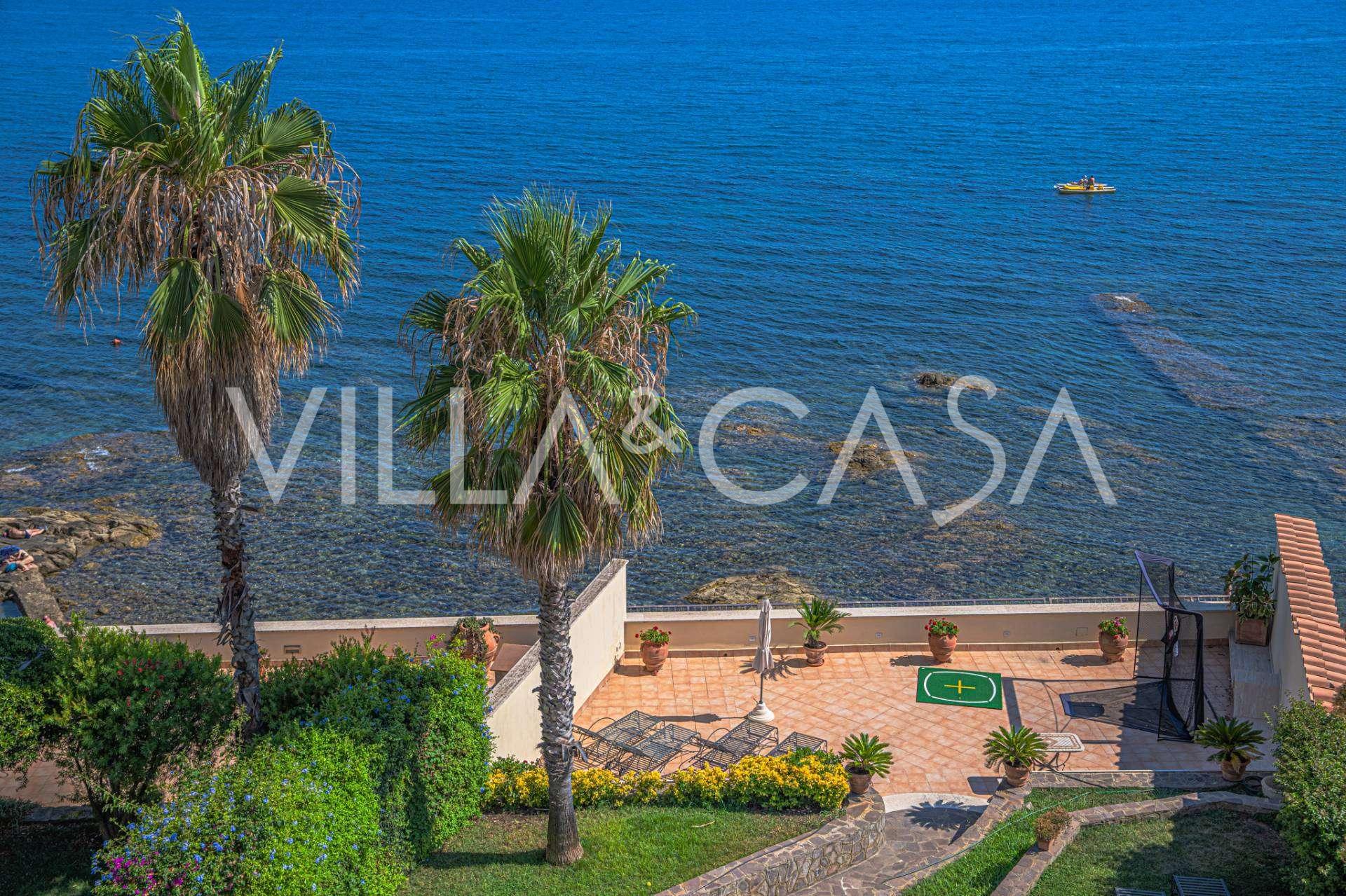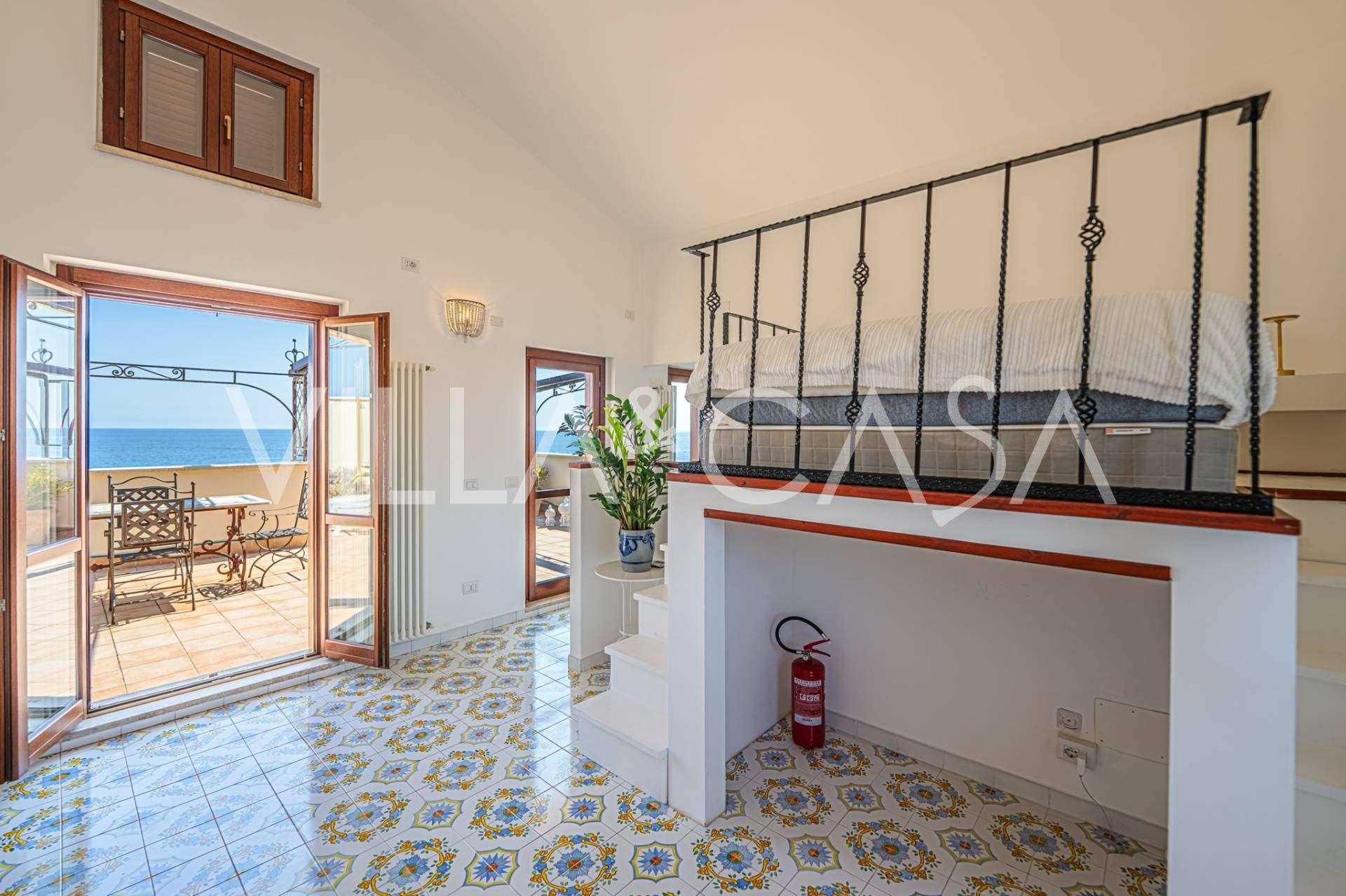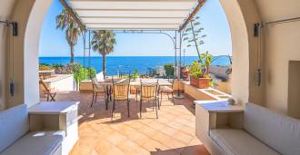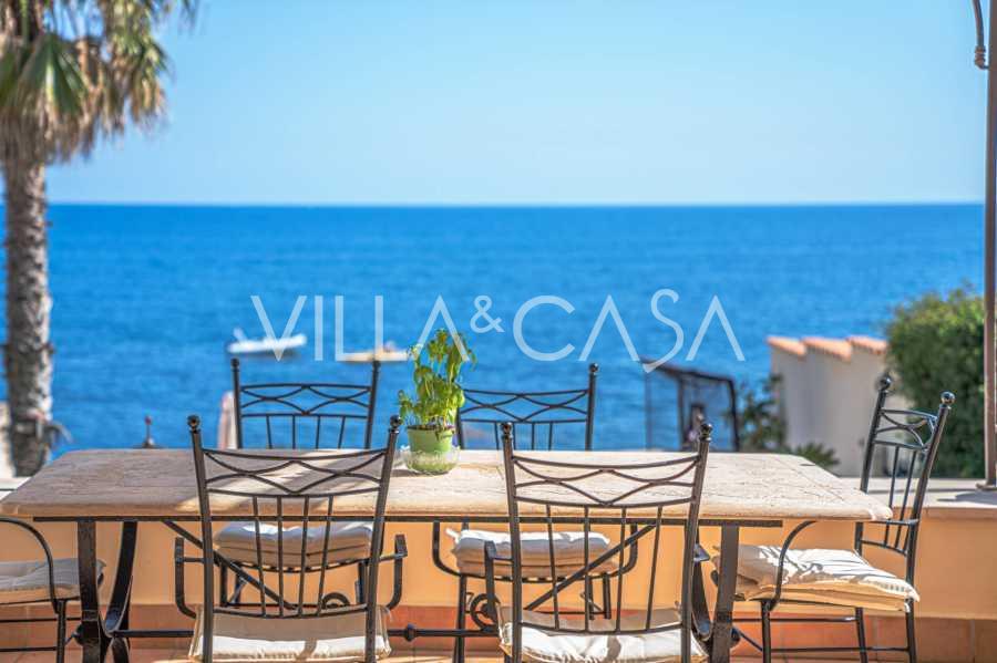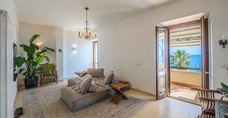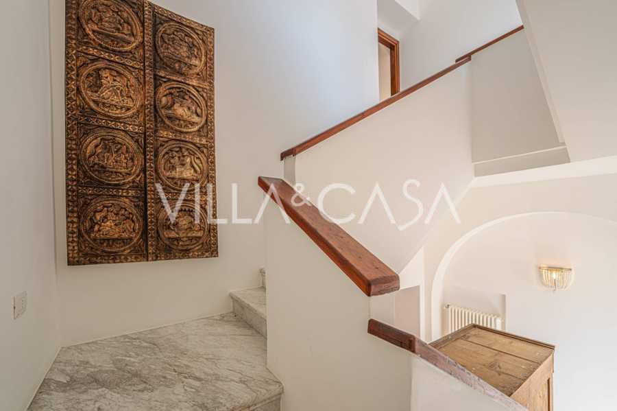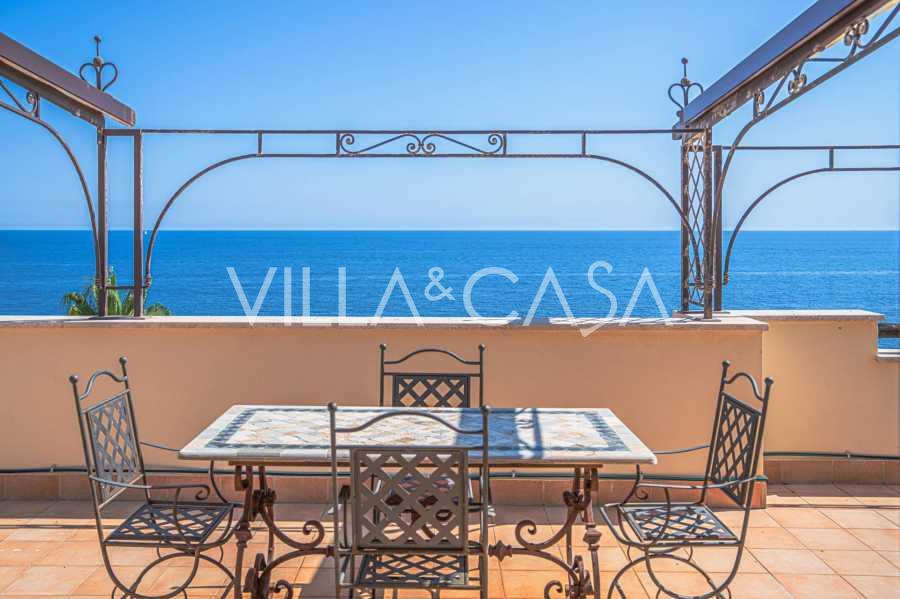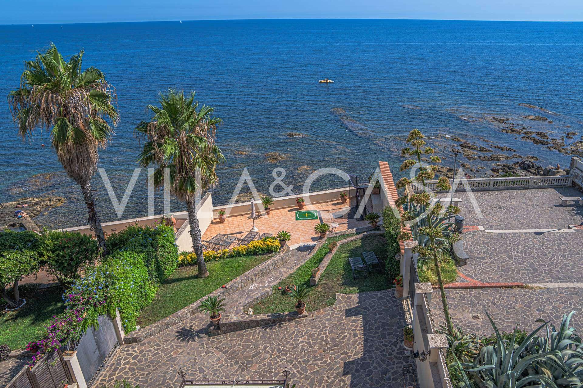 Die Fenster bieten einen 180-Grad-Panoramablick auf das Meer, der blaue Horizont füllt jeden Innenraum und erstreckt sich bis zu den weitläufigen Panoramaterrassen. Die Innenräume, mit Deckenhöhen von über drei Metern, Terrakottaböden aus der damaligen Zeit, einer Marmortreppe und einem Kamin, schaffen eine Atmosphäre von raffinierter, zeitloser Eleganz.