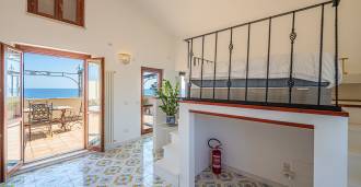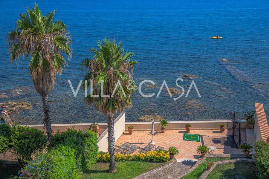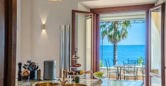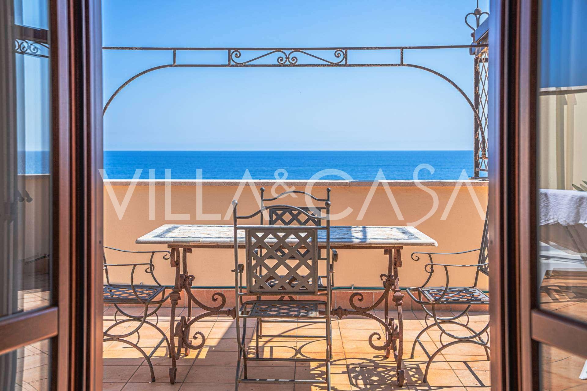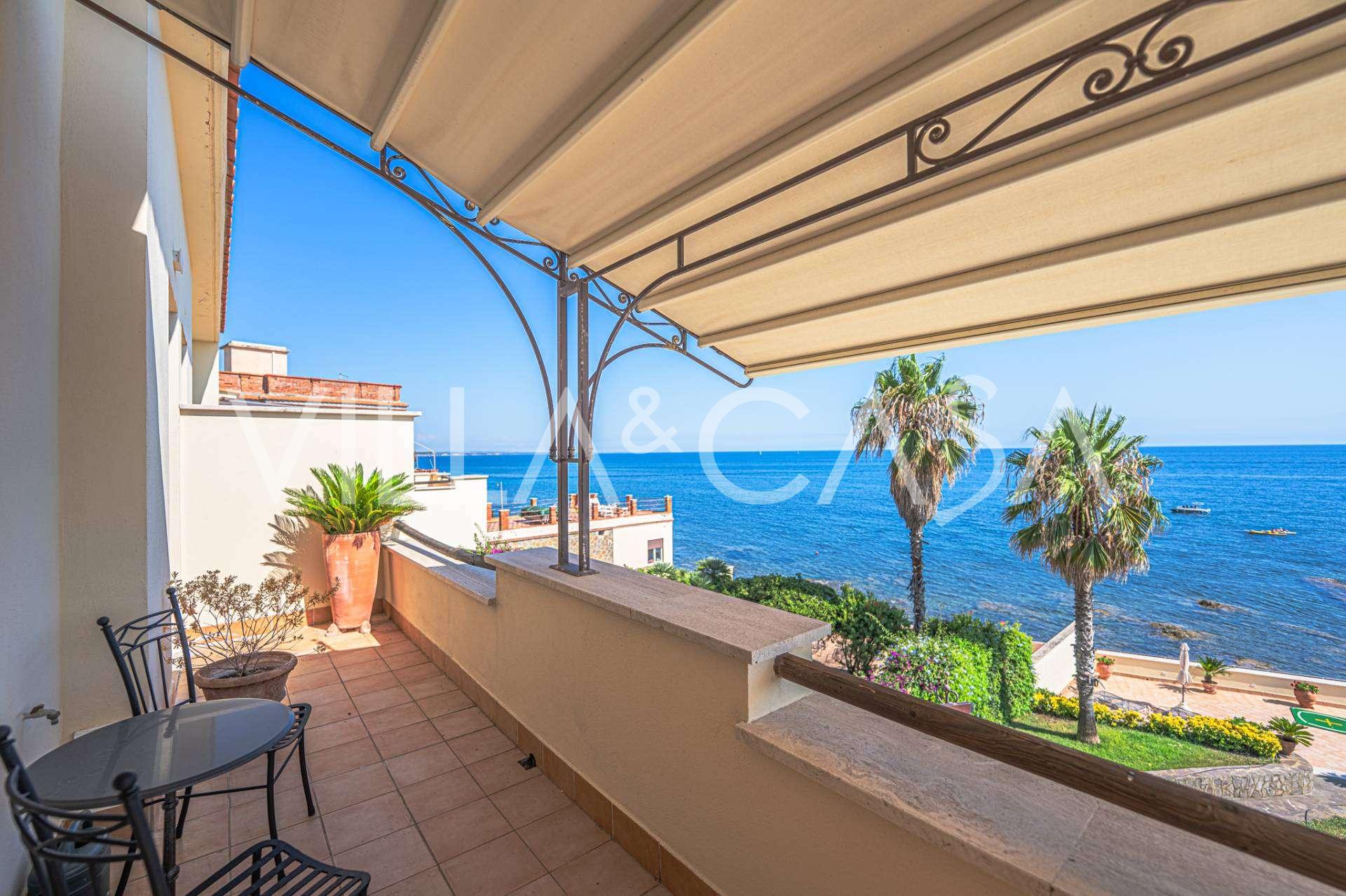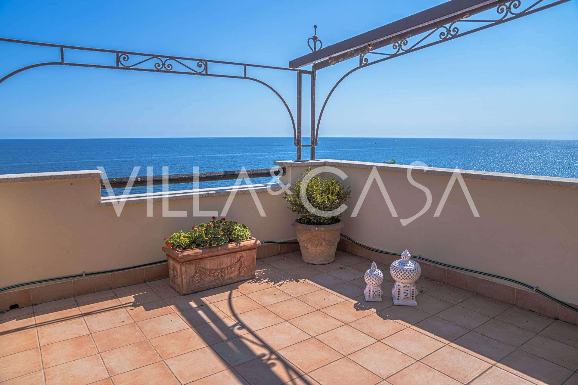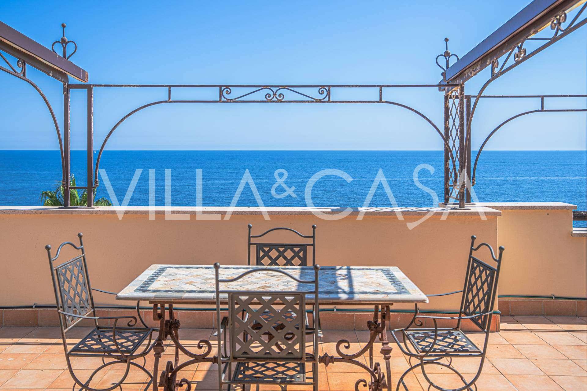 Die Fenster bieten einen 180-Grad-Panoramablick auf das Meer, der blaue Horizont füllt jeden Innenraum und erstreckt sich bis zu den weitläufigen Panoramaterrassen. Die Innenräume, mit Deckenhöhen von über drei Metern, Terrakottaböden aus der damaligen Zeit, einer Marmortreppe und einem Kamin, schaffen eine Atmosphäre von raffinierter, zeitloser Eleganz.