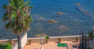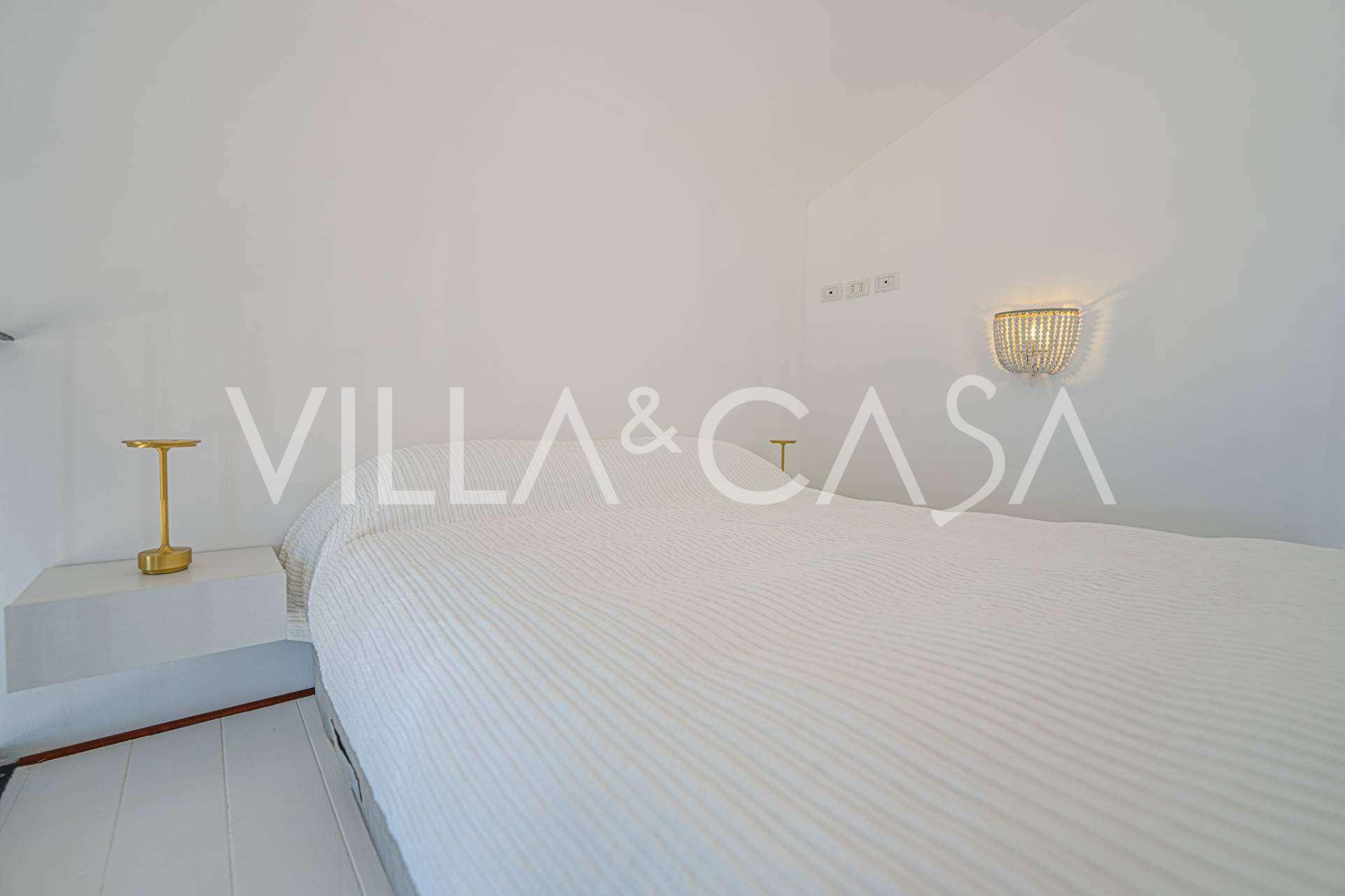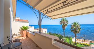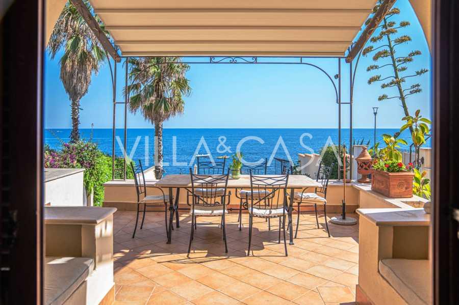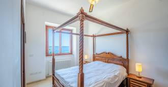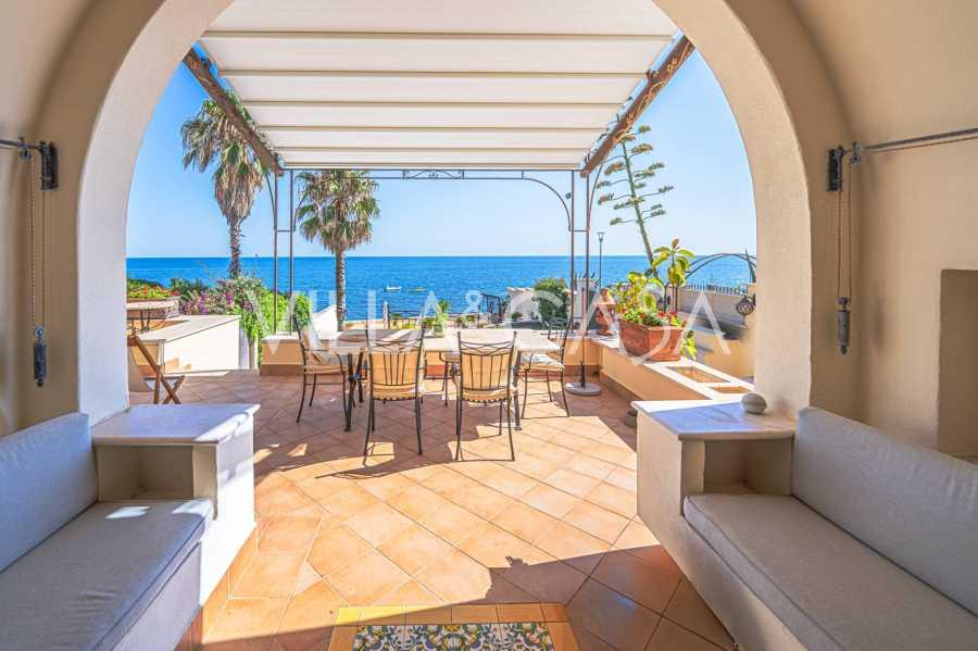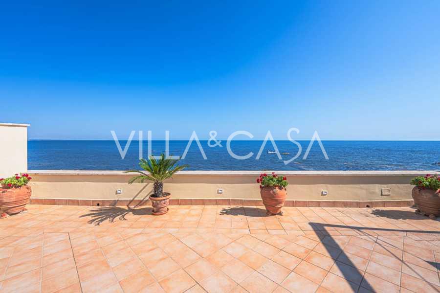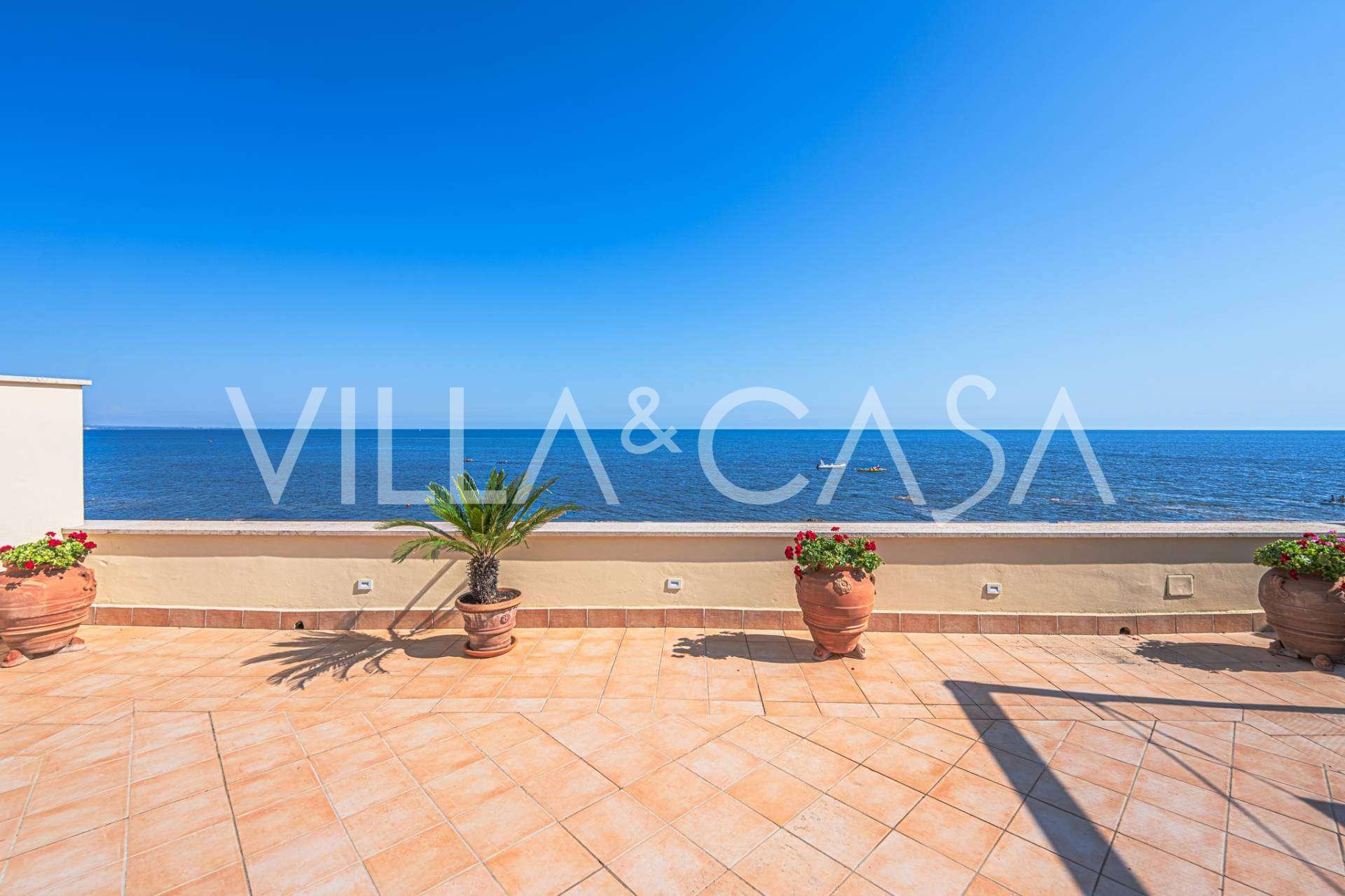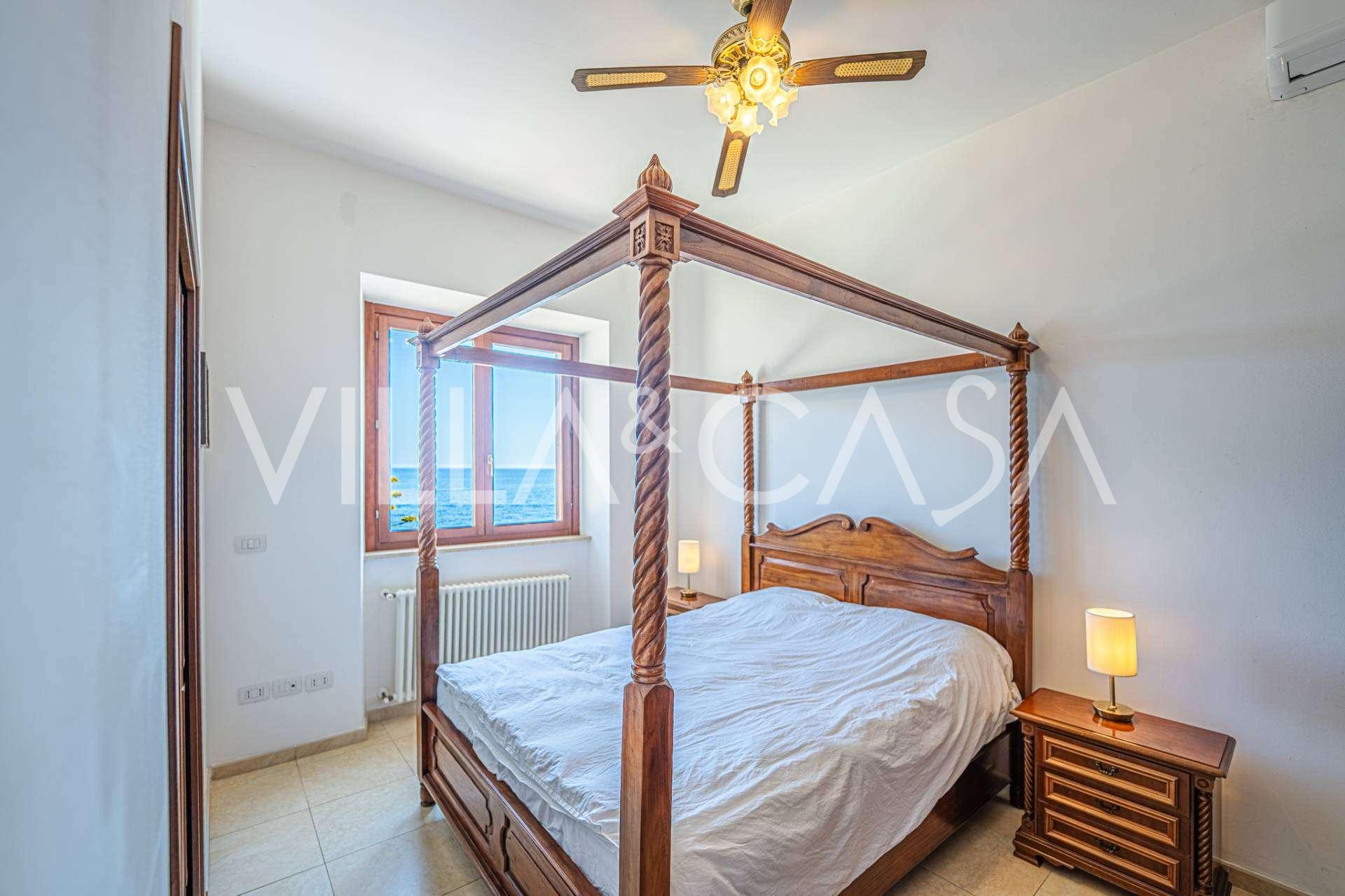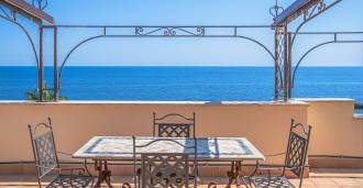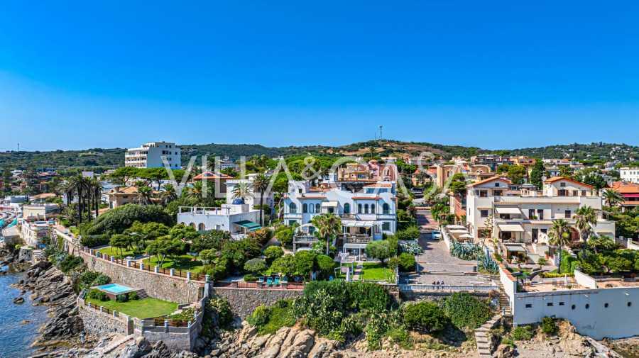 Die Fenster bieten einen 180-Grad-Panoramablick auf das Meer, der blaue Horizont füllt jeden Innenraum und erstreckt sich bis zu den weitläufigen Panoramaterrassen. Die Innenräume, mit Deckenhöhen von über drei Metern, Terrakottaböden aus der damaligen Zeit, einer Marmortreppe und einem Kamin, schaffen eine Atmosphäre von raffinierter, zeitloser Eleganz.