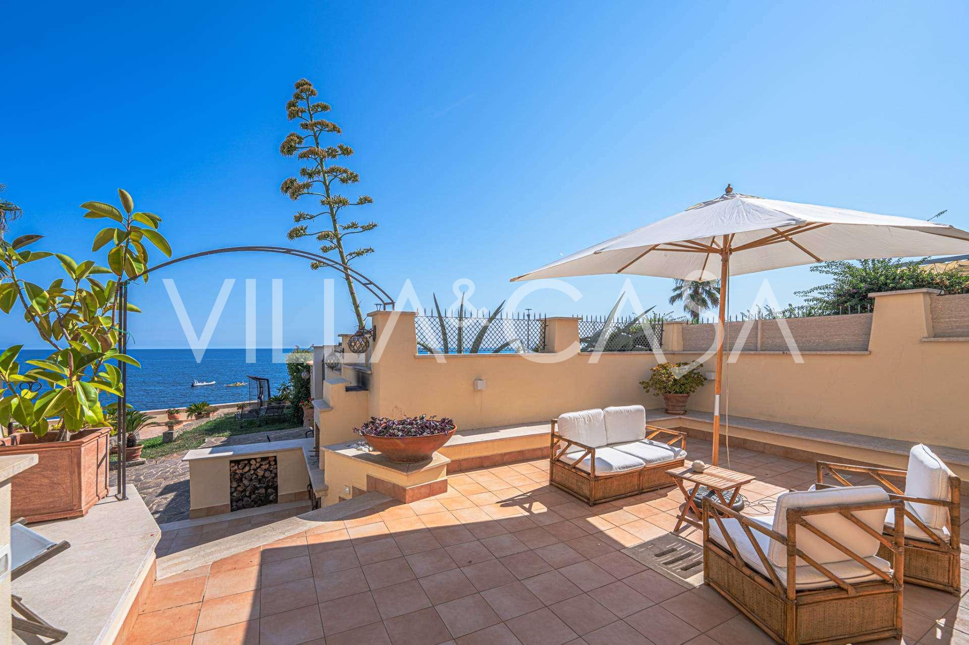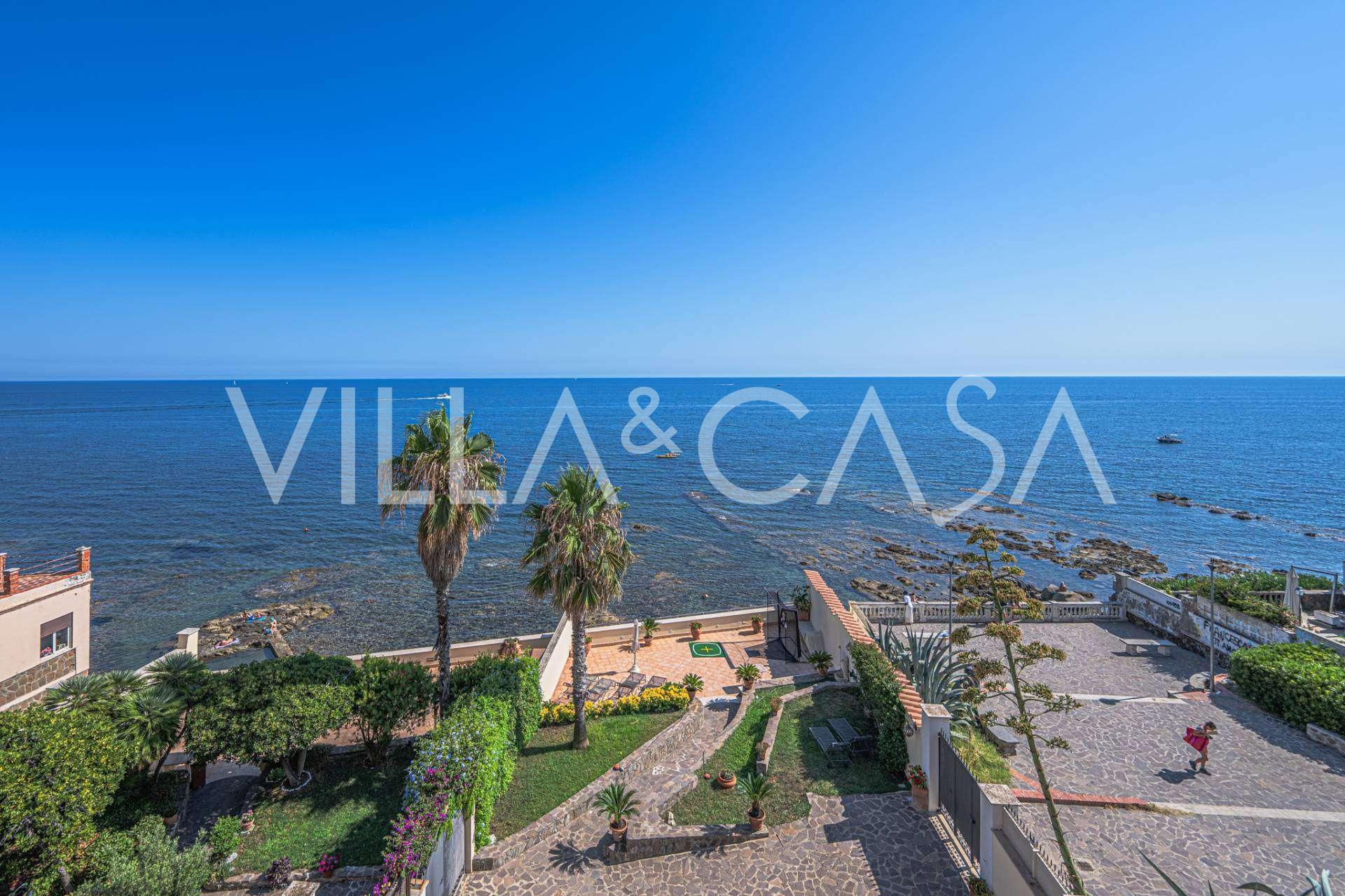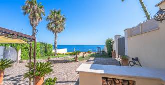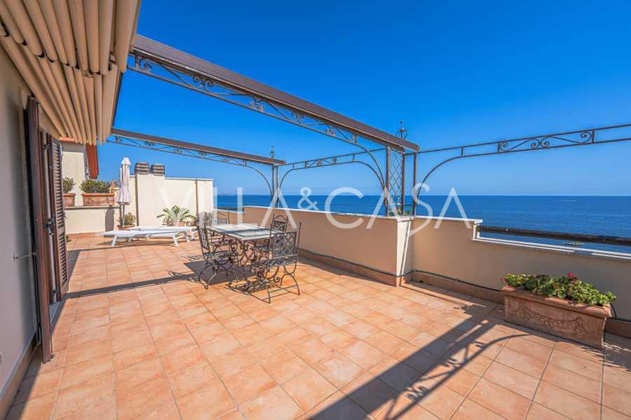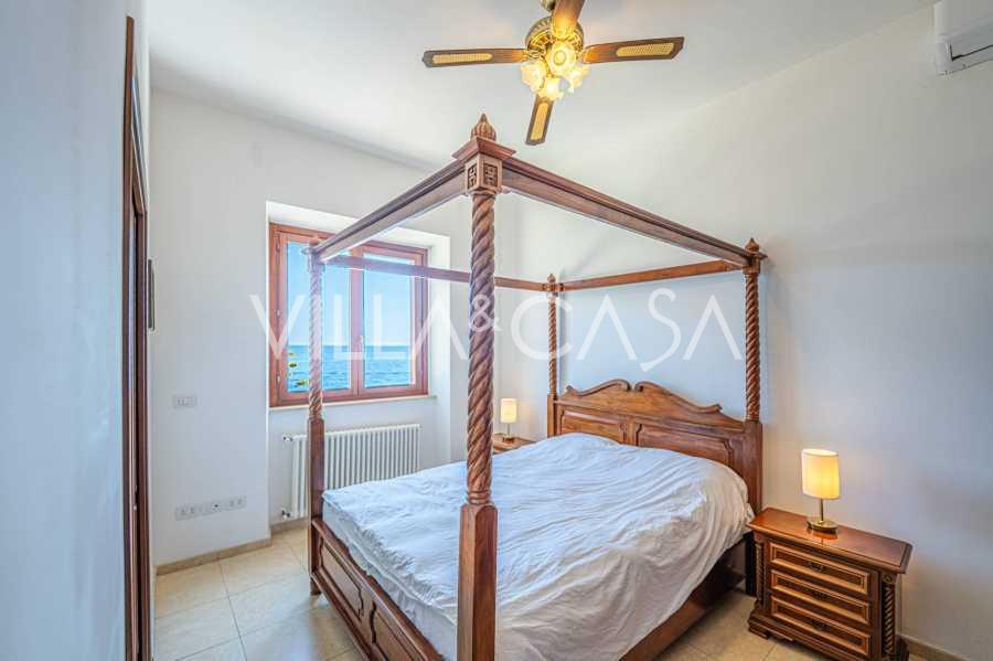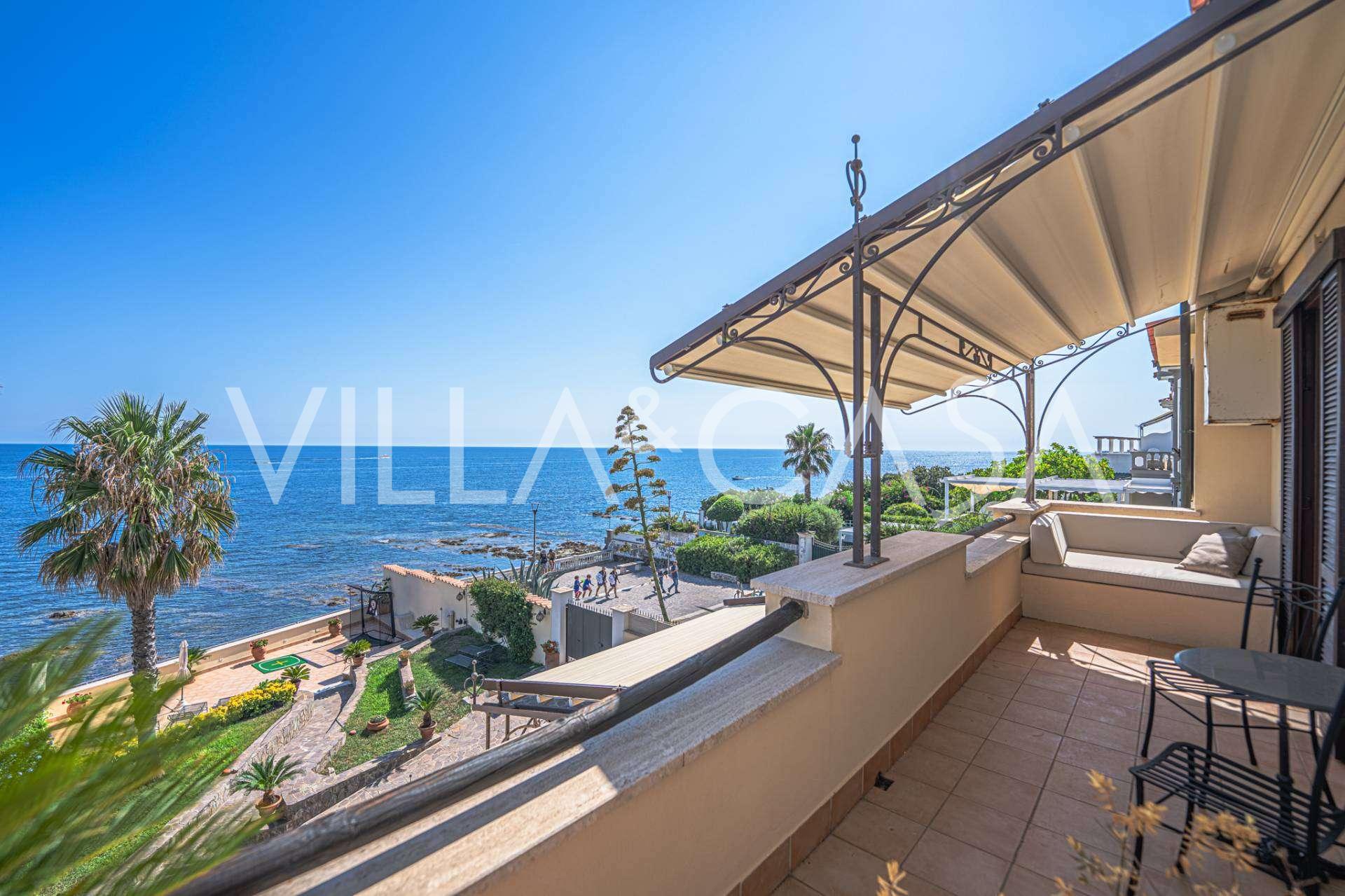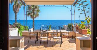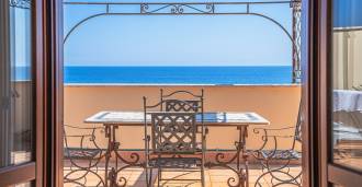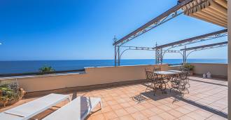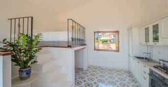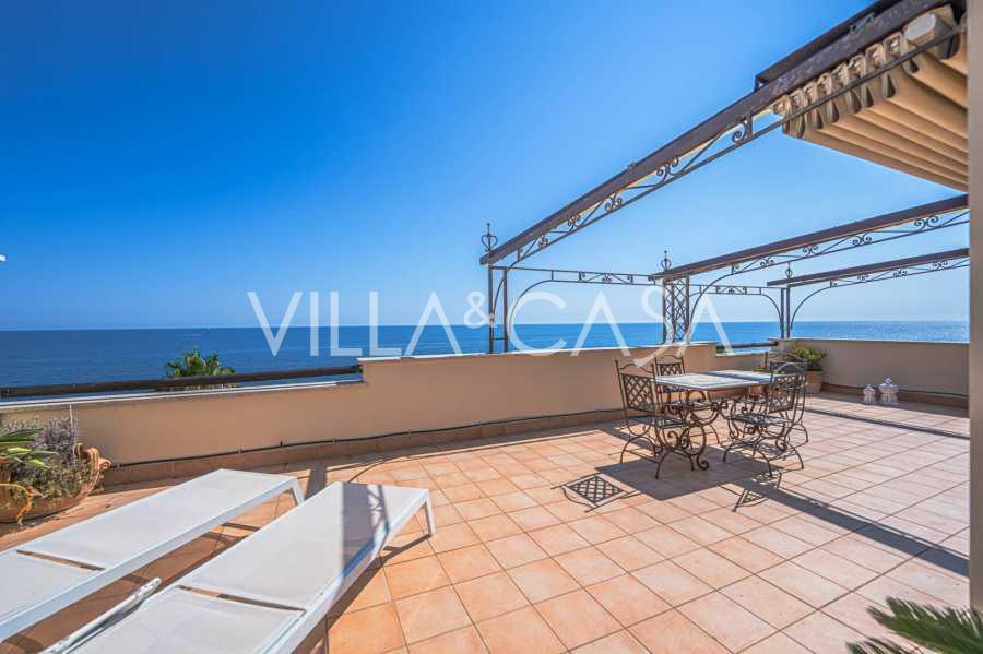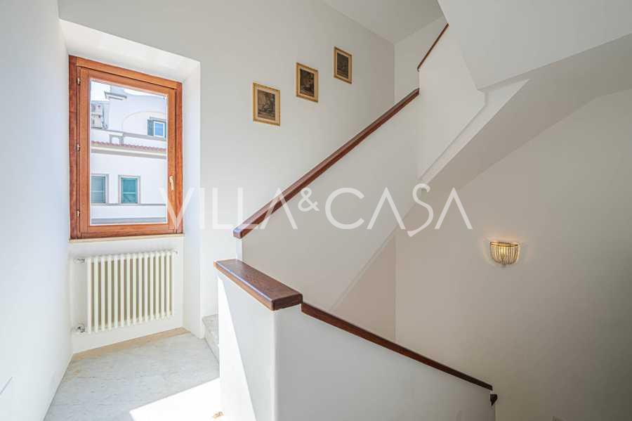Die Fenster bieten einen 180-Grad-Panoramablick auf das Meer, der blaue Horizont füllt jeden Innenraum und erstreckt sich bis zu den weitläufigen Panoramaterrassen. Die Innenräume, mit Deckenhöhen von über drei Metern, Terrakottaböden aus der damaligen Zeit, einer Marmortreppe und einem Kamin, schaffen eine Atmosphäre von raffinierter, zeitloser Eleganz.