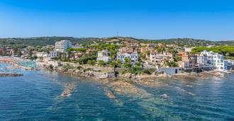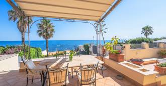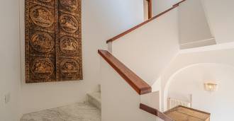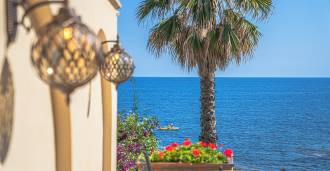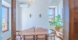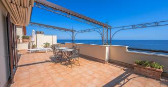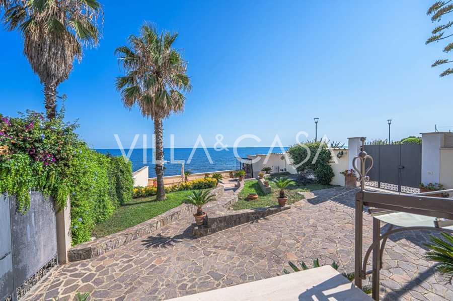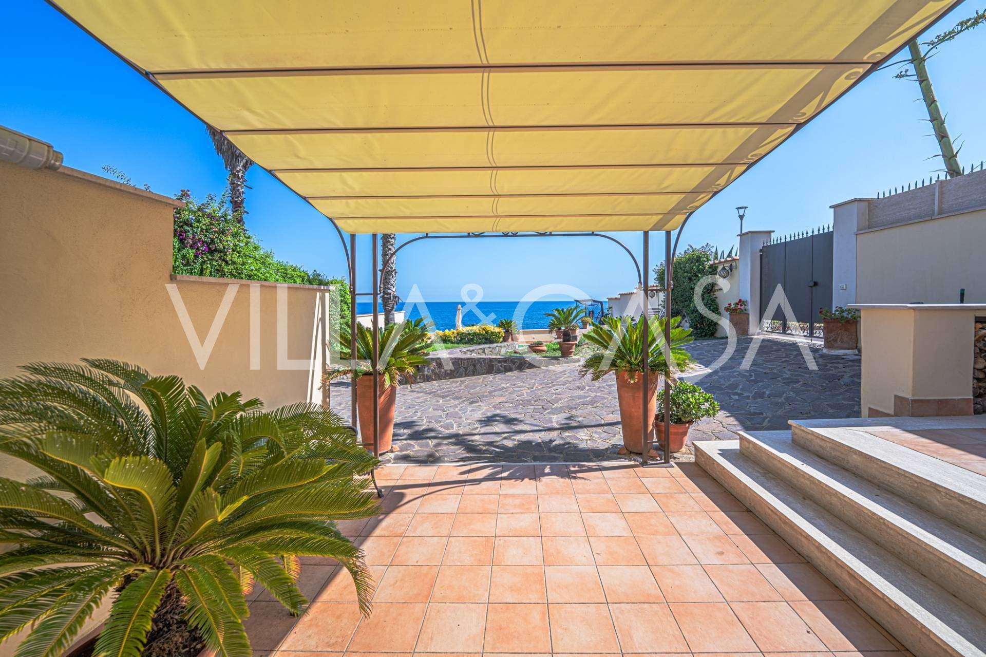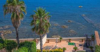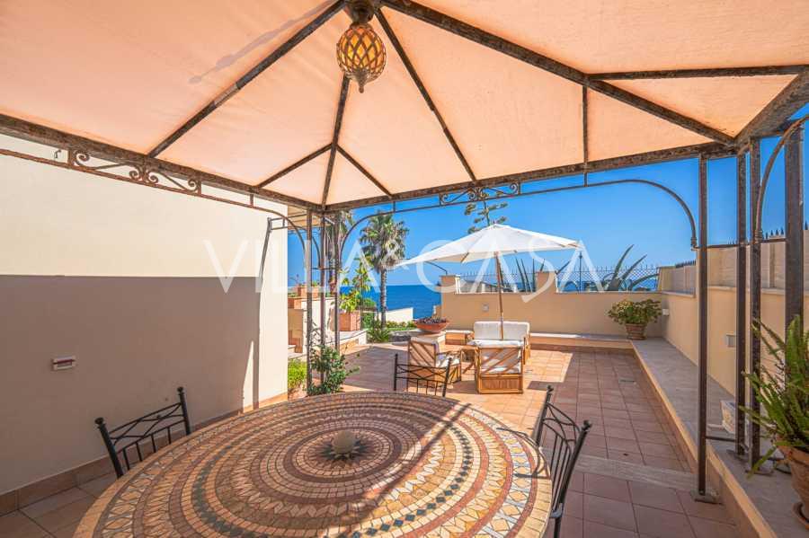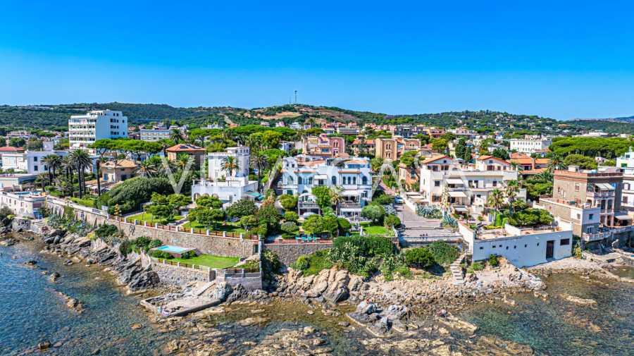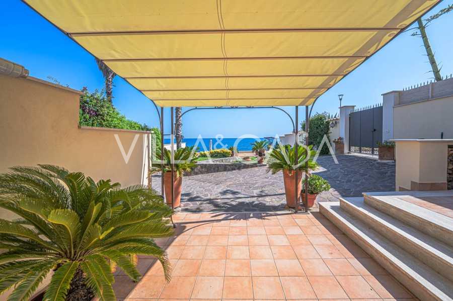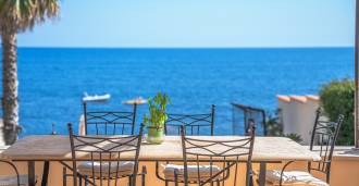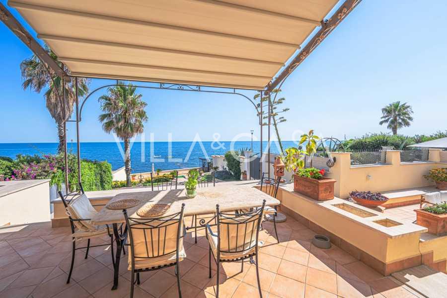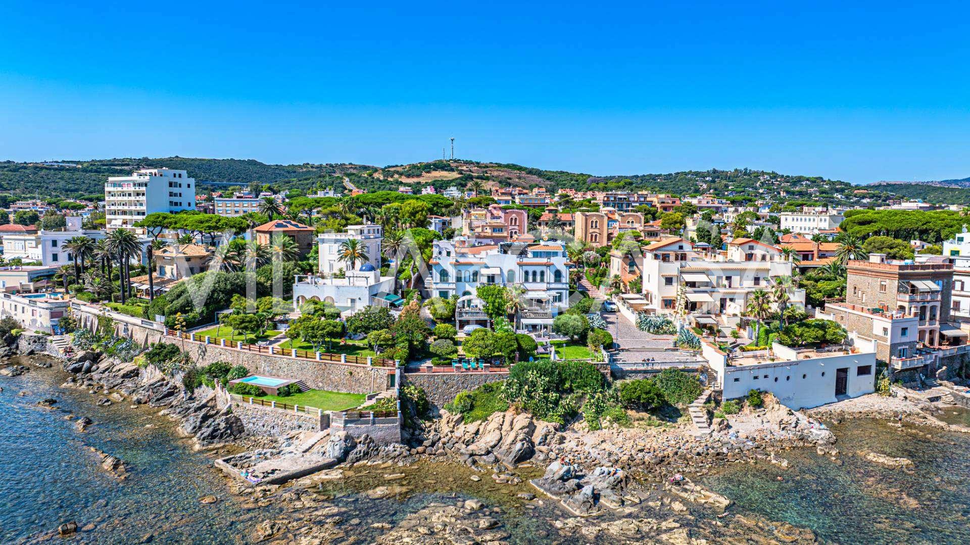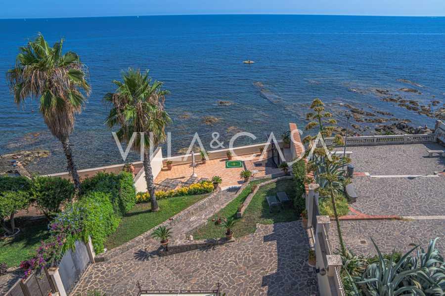 Die Fenster bieten einen 180-Grad-Panoramablick auf das Meer, der blaue Horizont füllt jeden Innenraum und erstreckt sich bis zu den weitläufigen Panoramaterrassen. Die Innenräume, mit Deckenhöhen von über drei Metern, Terrakottaböden aus der damaligen Zeit, einer Marmortreppe und einem Kamin, schaffen eine Atmosphäre von raffinierter, zeitloser Eleganz.