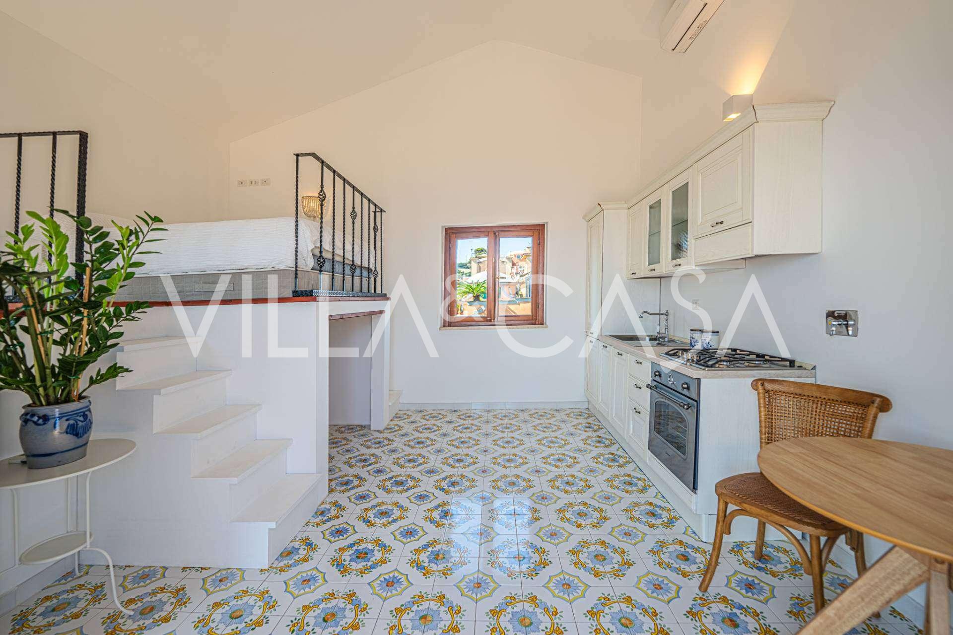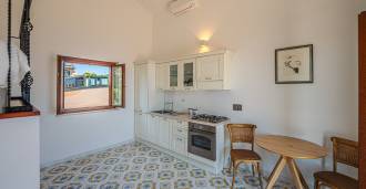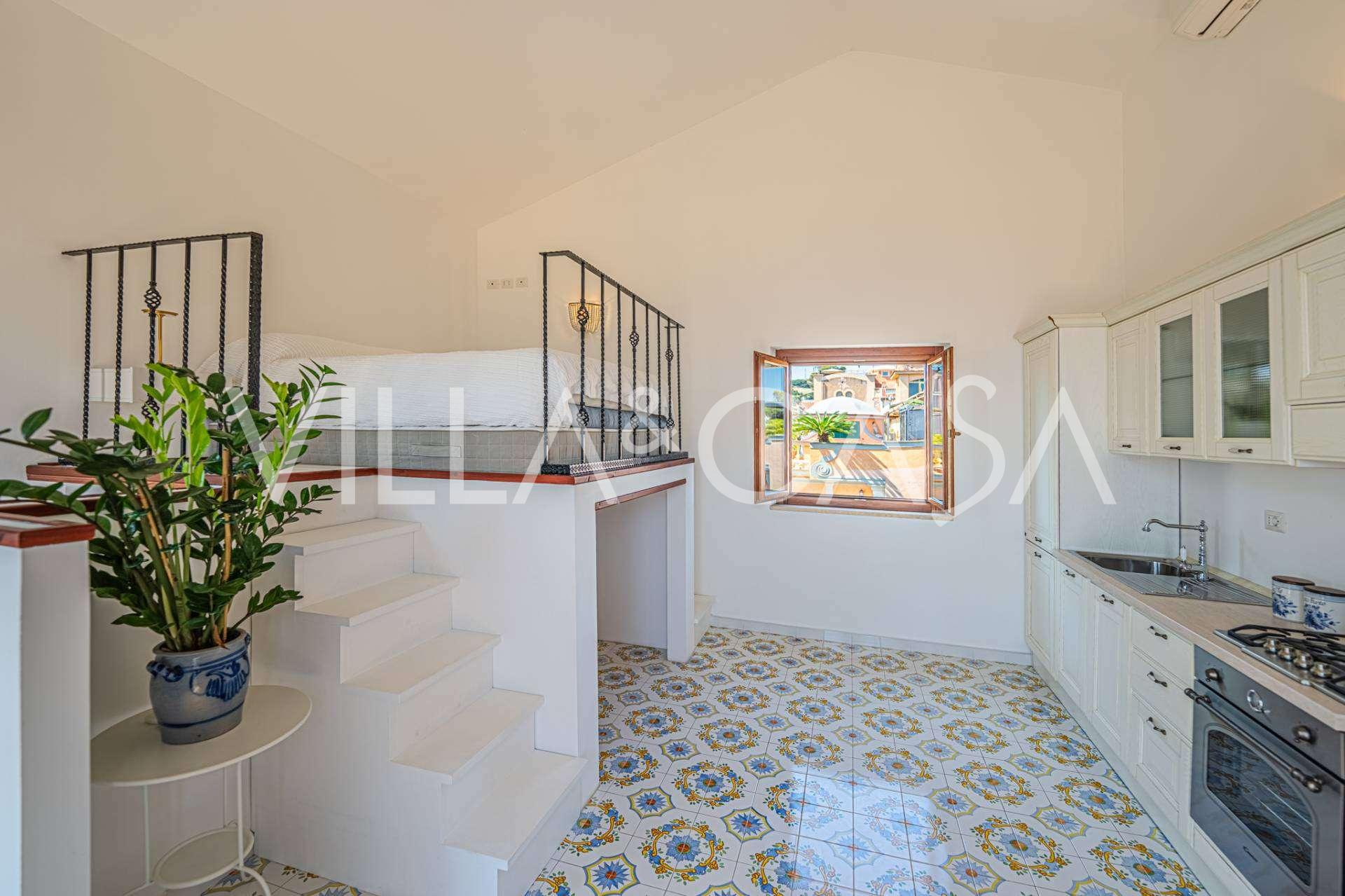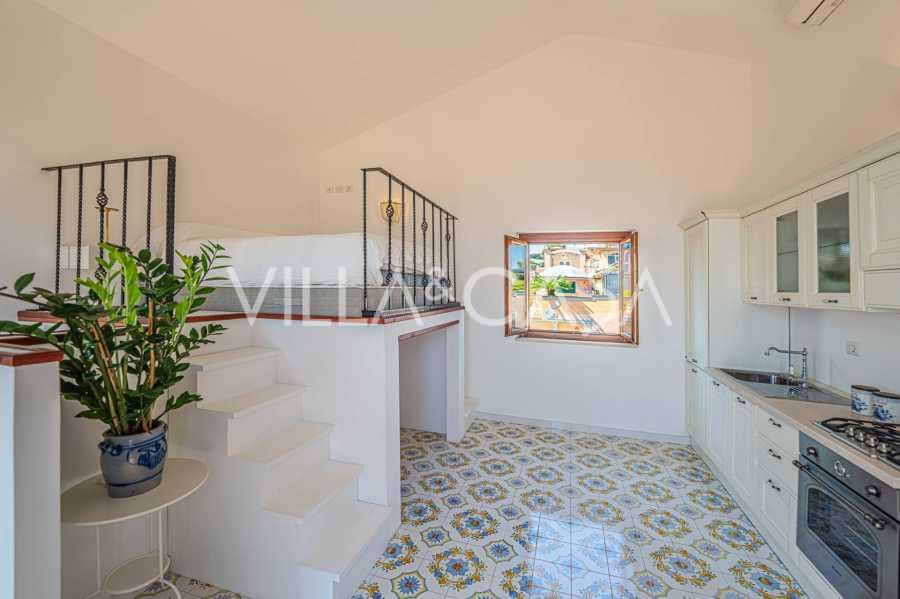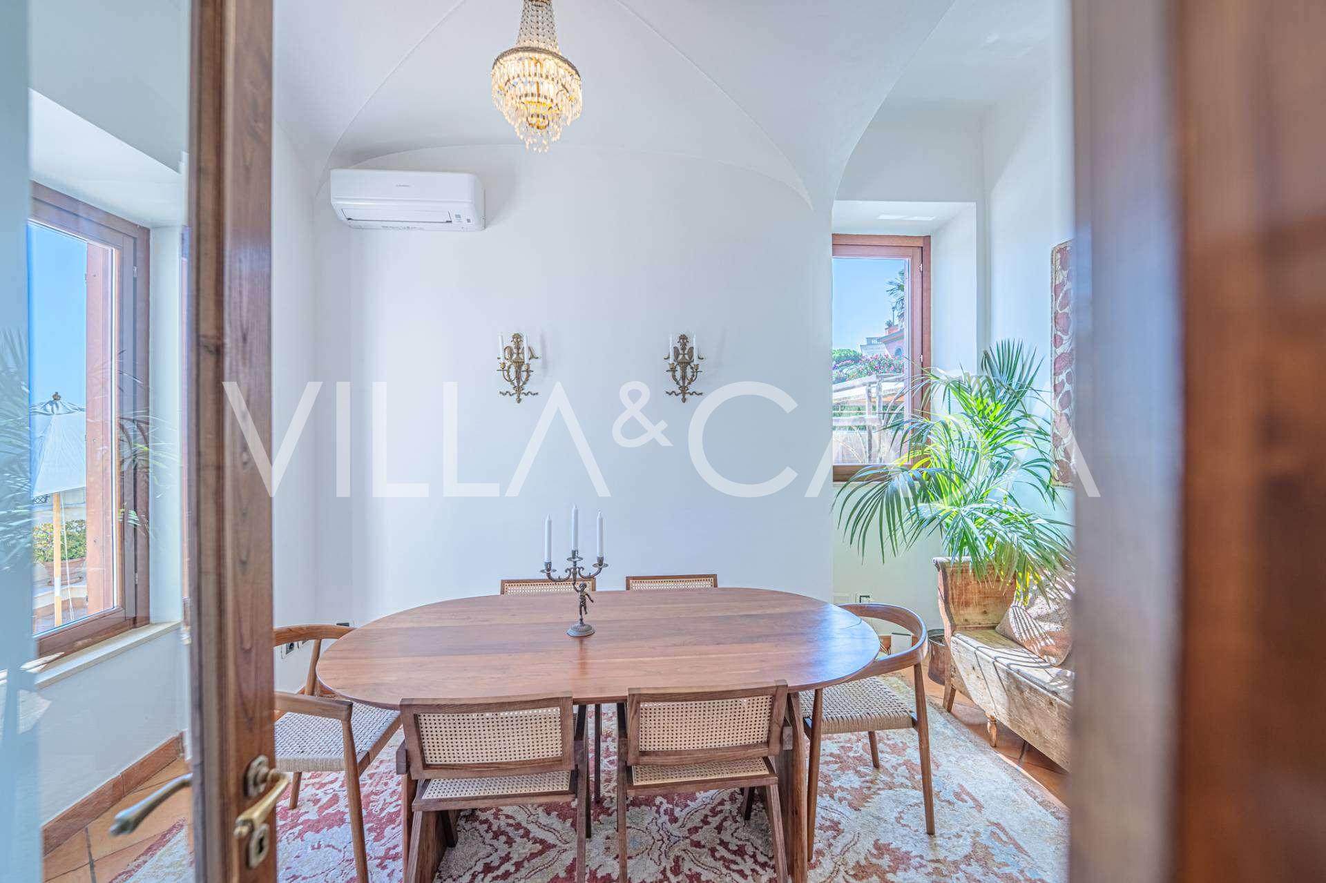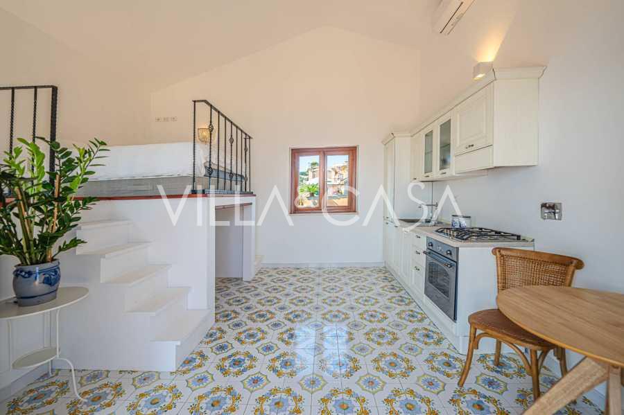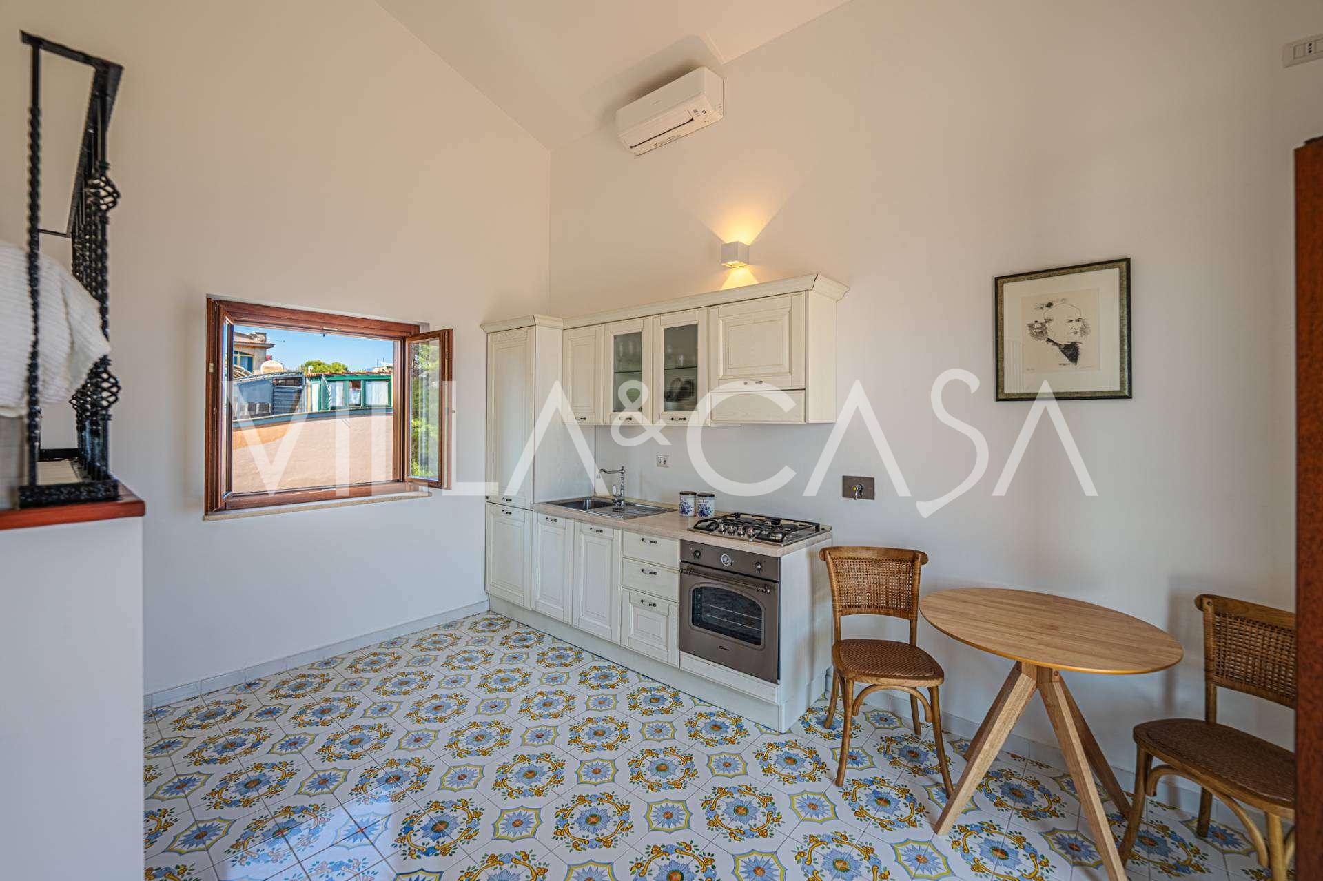 Das Hauptwohnzimmer, geschmückt mit großen Fenstern, öffnet sich zur Terrasse, die sich perfekt für geselliges Beisammensein und das Genießen seltener Sonnenuntergänge eignet. Die maßgefertigte Küche verbindet Ästhetik und Funktionalität und verfügt über eine Insel, die mit handbemalten Positano-Fliesen verziert ist, sowie über originale Kupferspülen.