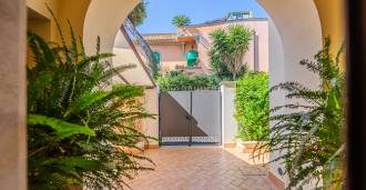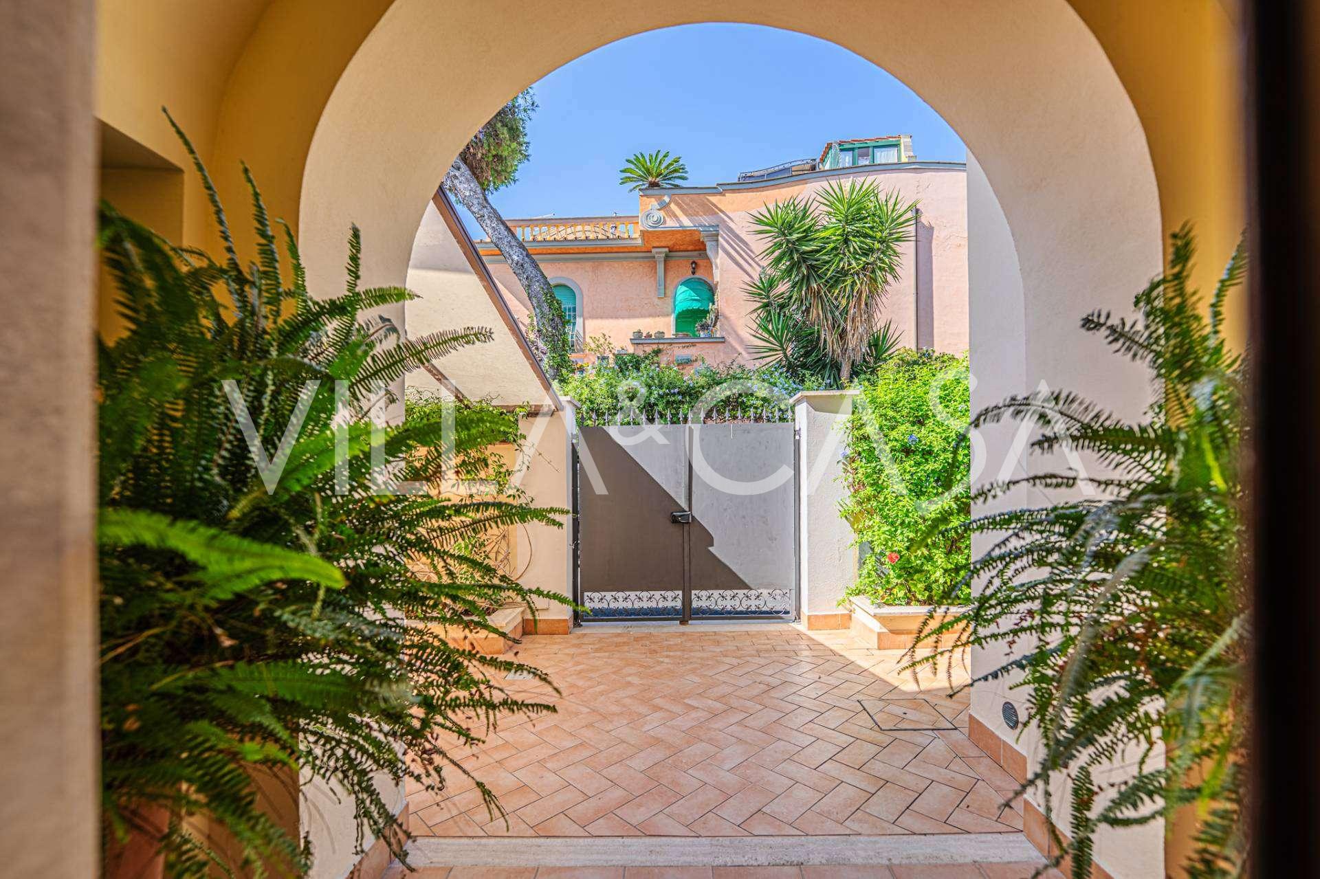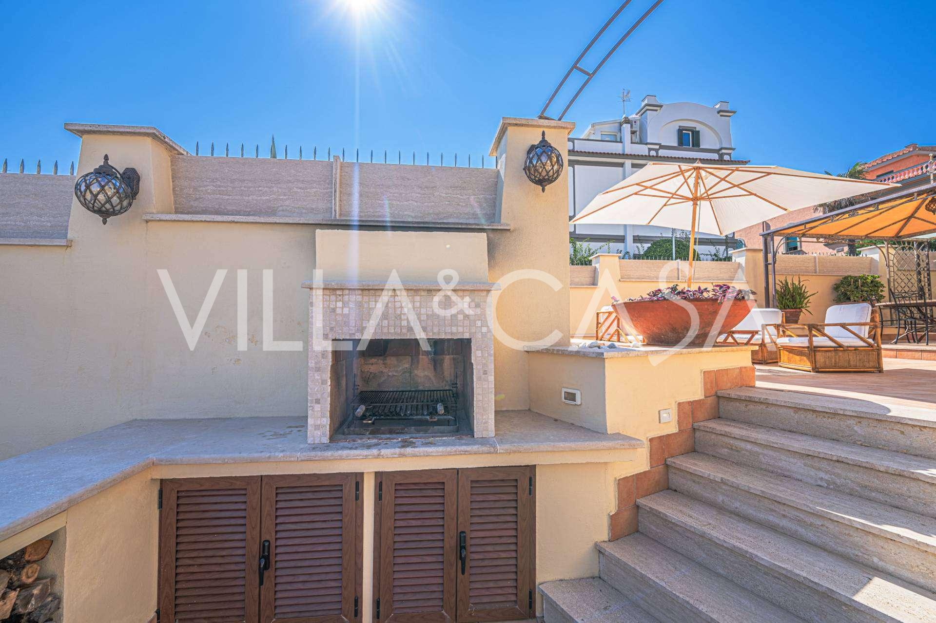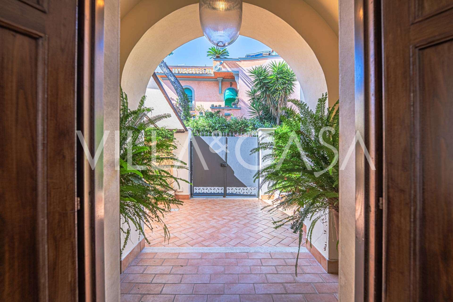 Die Residenz nimmt einen Teil eines eleganten Doppelhauses ein und bietet dank eines separaten Eingangs, eines geräumigen privaten Gartens von etwa 800 Quadratmetern und eines direkten privaten Zugangs zum Strand, was an der Küste von Latium eine Seltenheit ist, vollständige Unabhängigkeit.