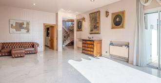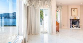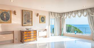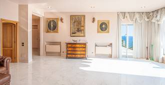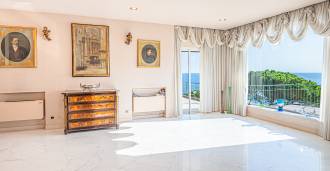Geräumiges Wohnzimmer mit Marmorkamin und Meerblick, große Terrasse mit Panoramablick, separater Essbereich, voll ausgestattete Küche, zwei elegante Schlafzimmer, zwei stilvolle Badezimmer, Gäste-WC und Waschküche.