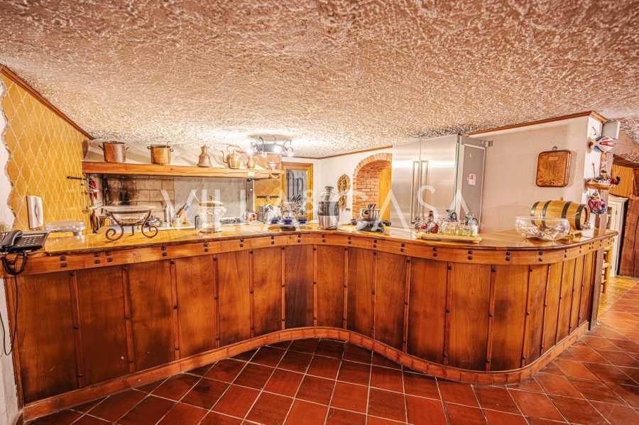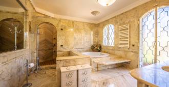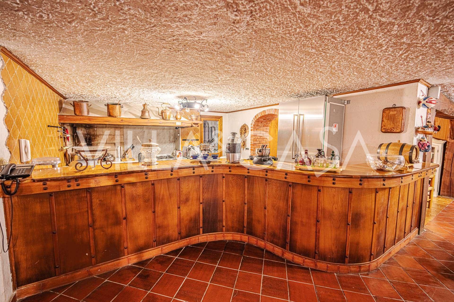 Kellergeschoss: Erholungsbereich mit Bar, Küche, Saal mit Kamin, Schlafzimmer, zwei Badezimmer, Fitnessraum, Technikraum, Weinkeller, Kühlraum für Fleisch.