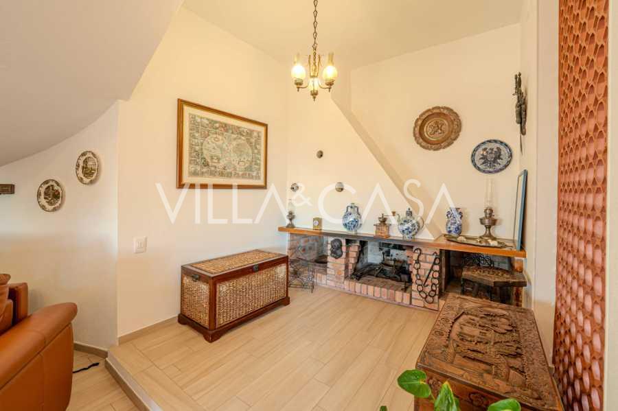 Auf der zweiten Ebene: ein großes Wohnzimmer mit Kamin und Meerblick, von dem aus man Zugang zum Garten und zum Balkon hat. Die Küche bietet ebenfalls Meerblick. Ein Badezimmer.