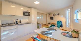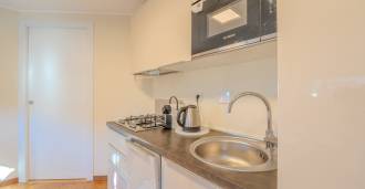 Auf der ersten Ebene befinden sich separate Apartments, die Folgendes umfassen: einen Eingangsbereich mit Garderobe, ein Wohnzimmer mit Küche und ein Badezimmer.
