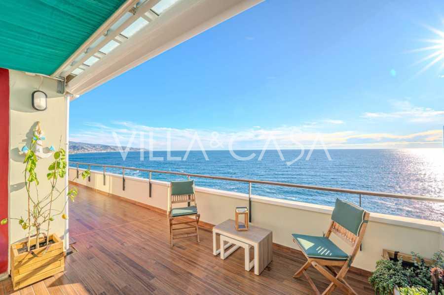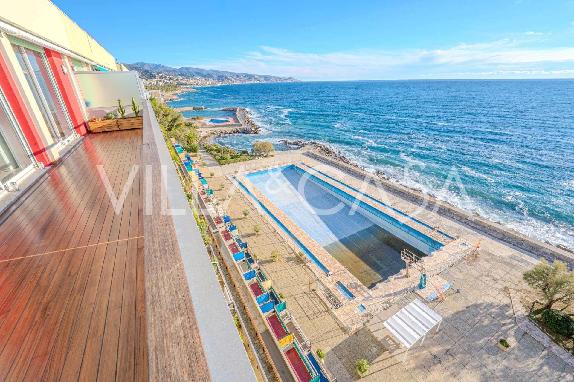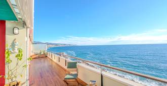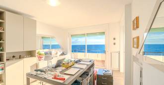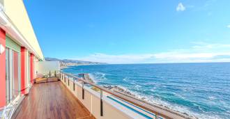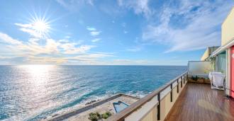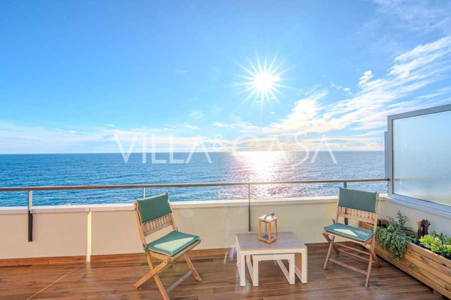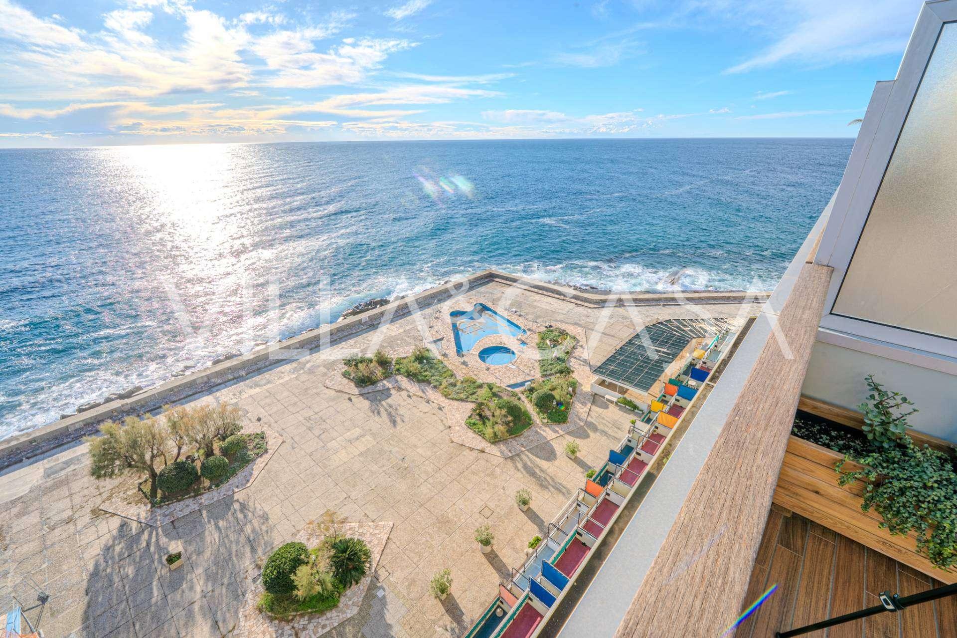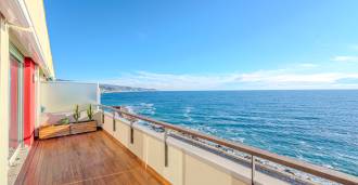 Ein Penthouse mit einer geräumigen Terrasse von 143 m² (123 m² Wohnfläche + 20 m² Garage) direkt am Meer wird angeboten. Das elegante Penthouse, das 2023 komplett renoviert wurde, befindet sich im 5. Stock eines Gebäudes mit Concierge. Die Wohnung ist nach Südosten ausgerichtet und verfügt über eine große Terrasse, die eine helle und gemütliche Atmosphäre schafft.