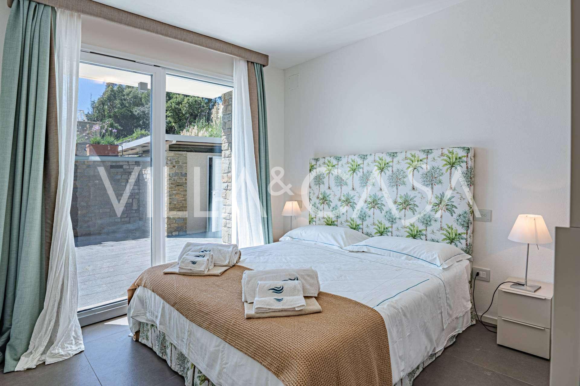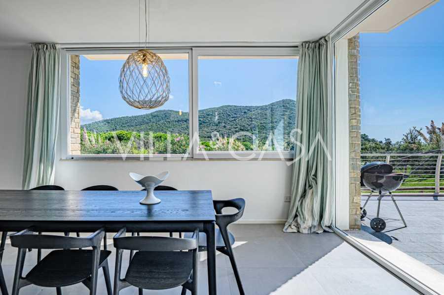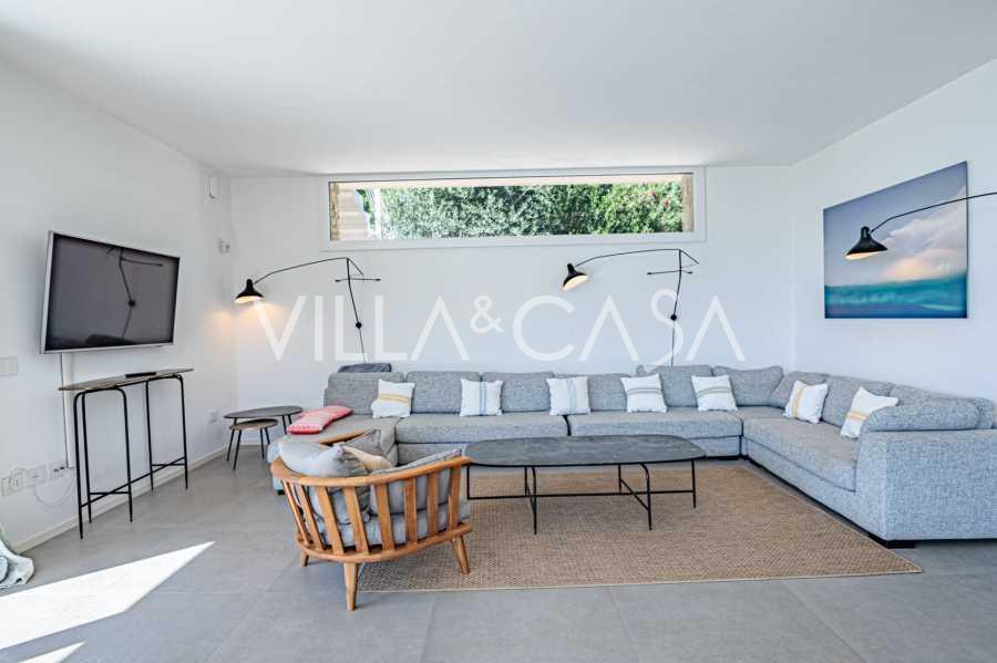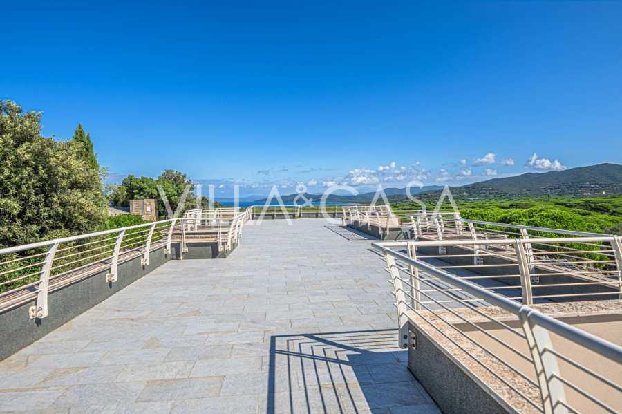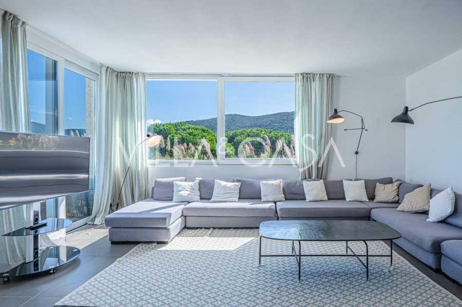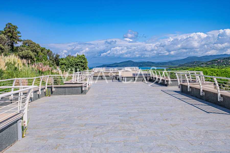 Auf der unteren Ebene, im eleganten Sockelgeschoss, befinden sich geräumige Terrassen mit Blick auf das Meer von Punta Ala, die für maximale Nutzung des Tageslichts entworfen wurden und eine gemütliche Atmosphäre in jedem Raum schaffen.