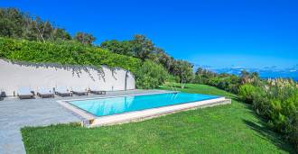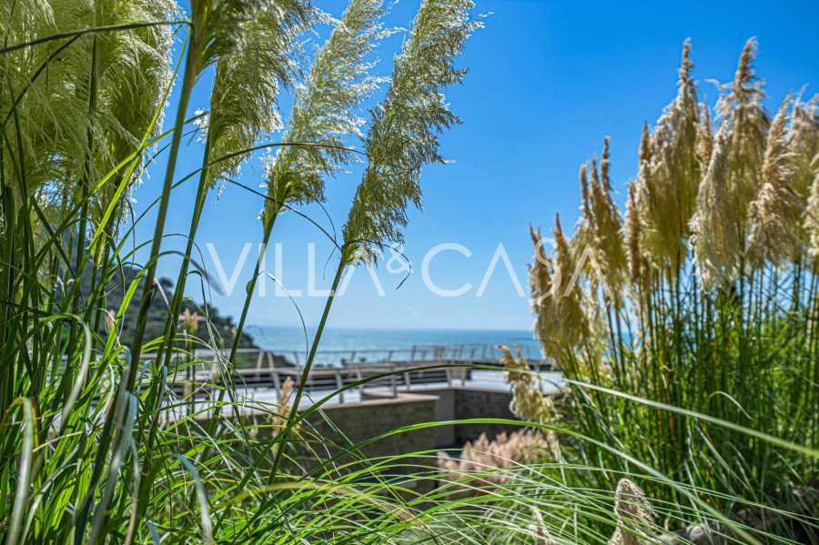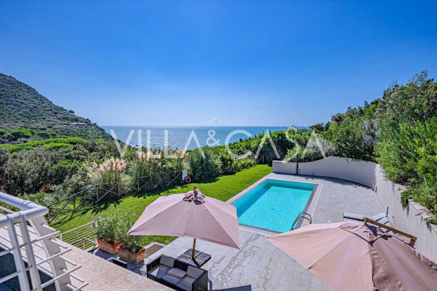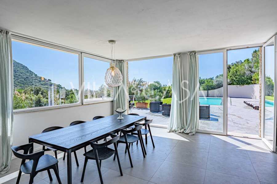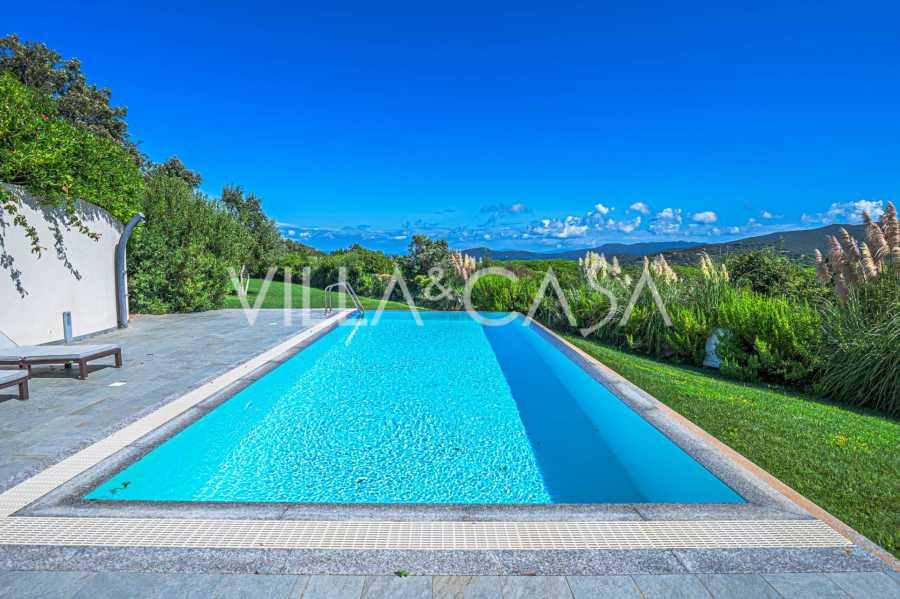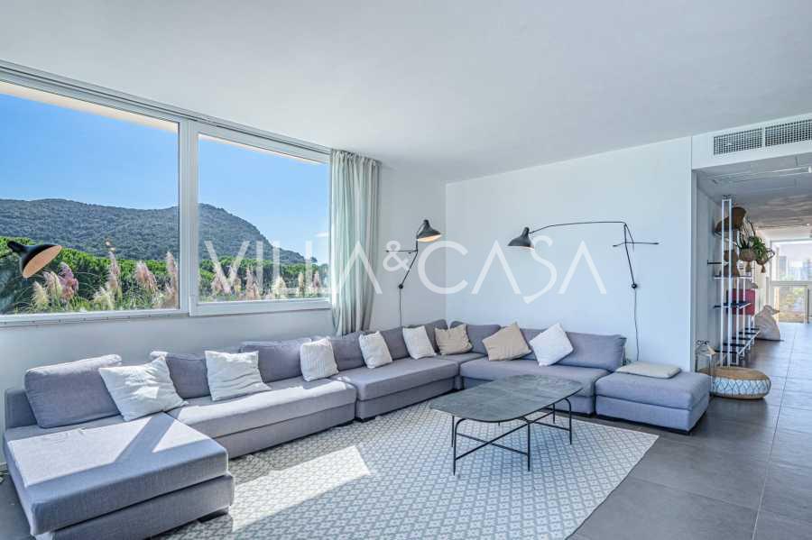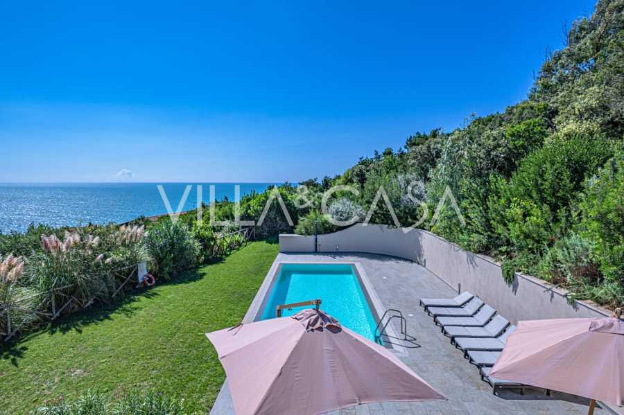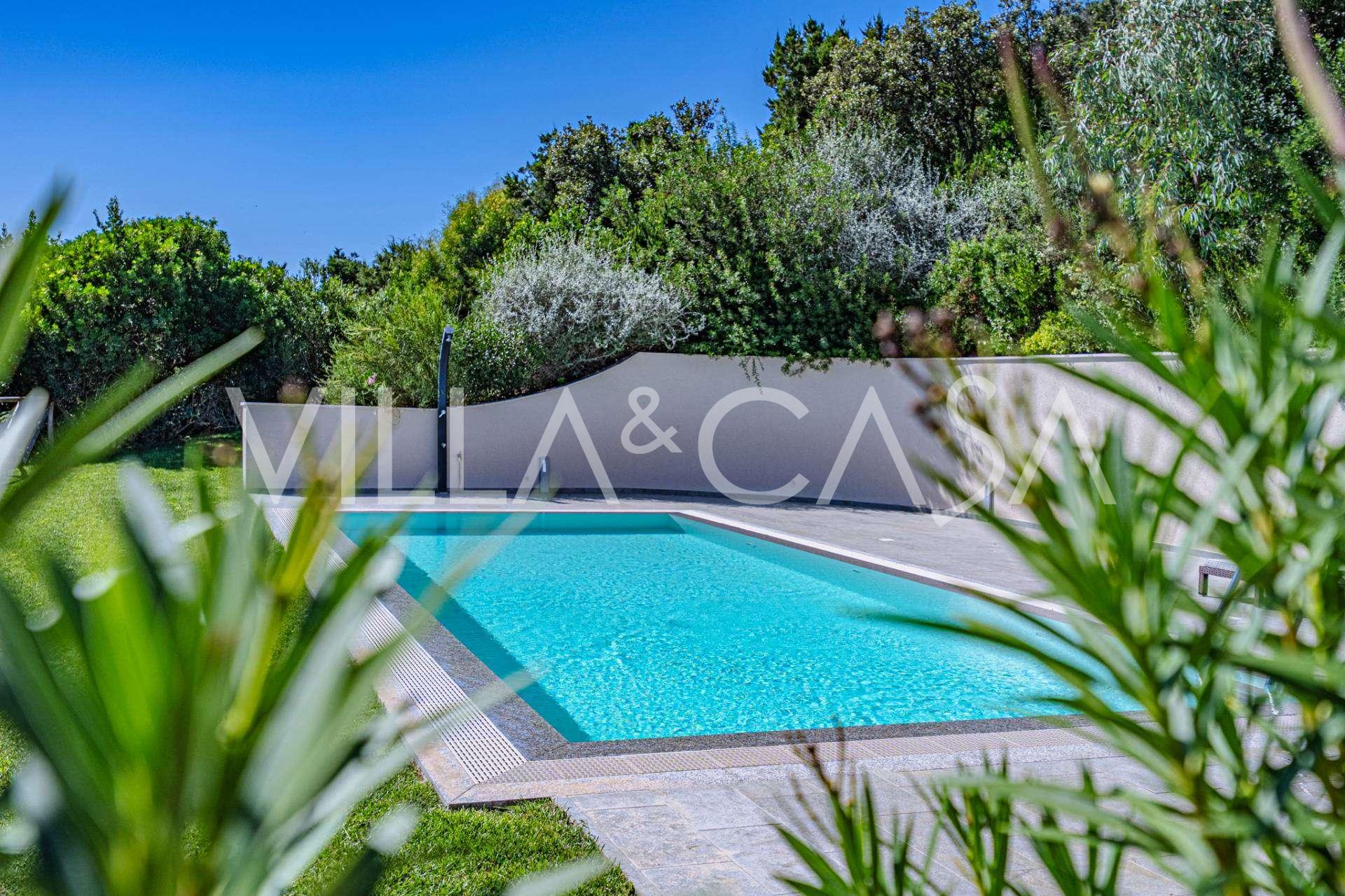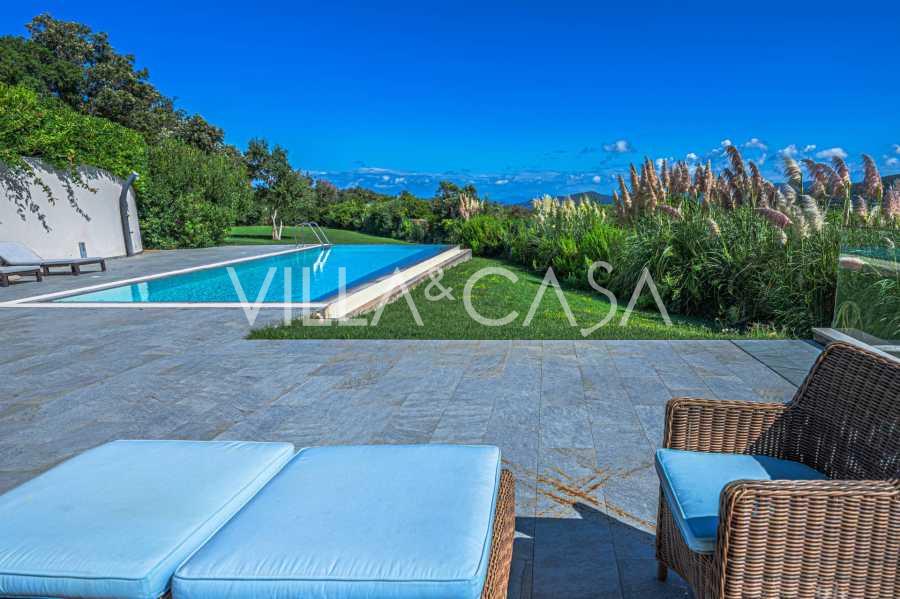 Der Pool, umgeben von einer Sonnenzone mit Liegestühlen und Designermöbeln, ist das Zentrum der Außenbereiche: der perfekte Ort für Entspannung mit einem atemberaubenden Blick auf die Bucht.