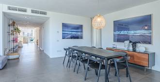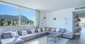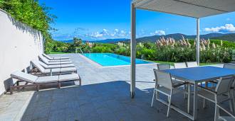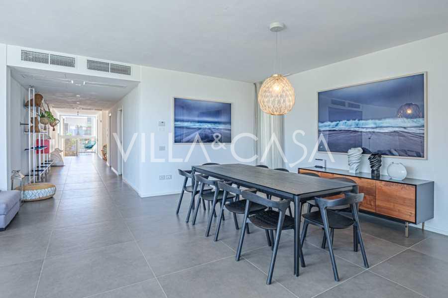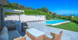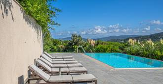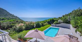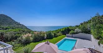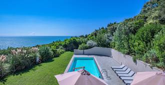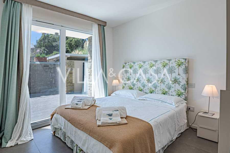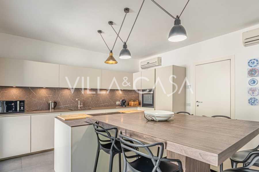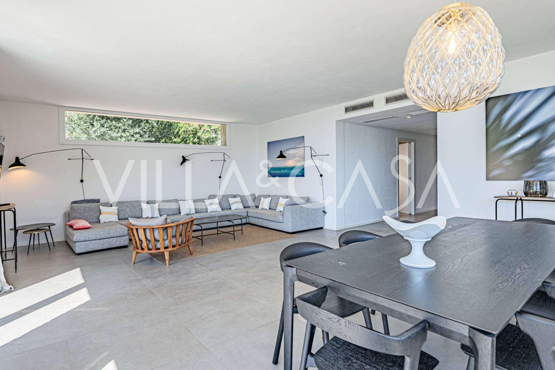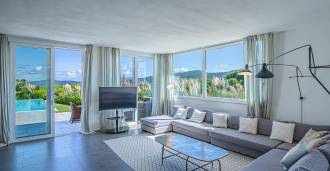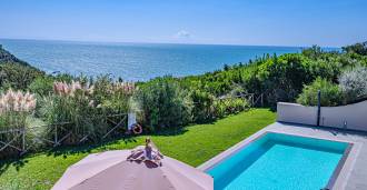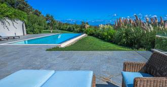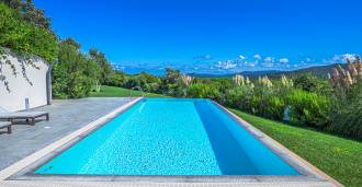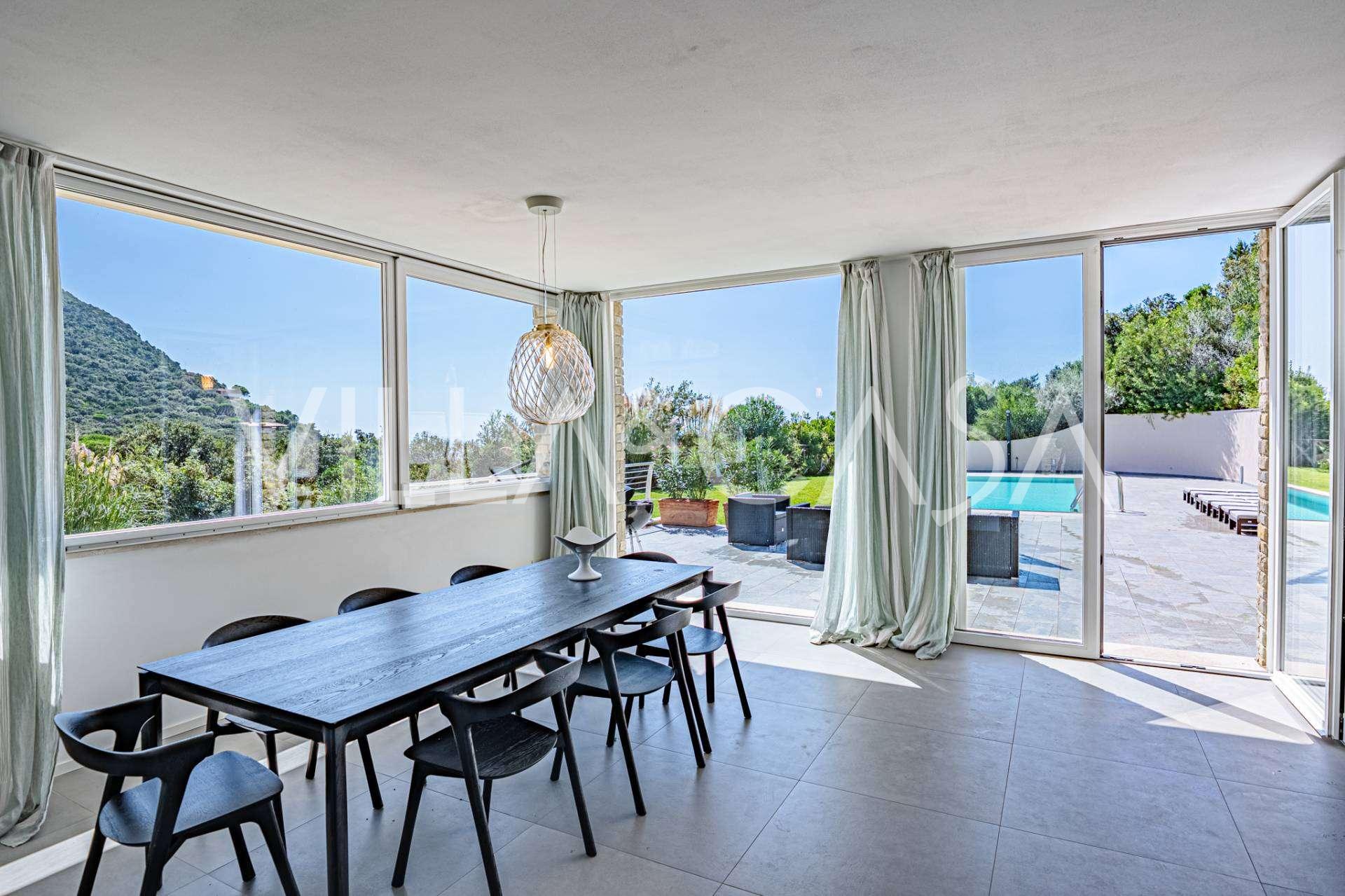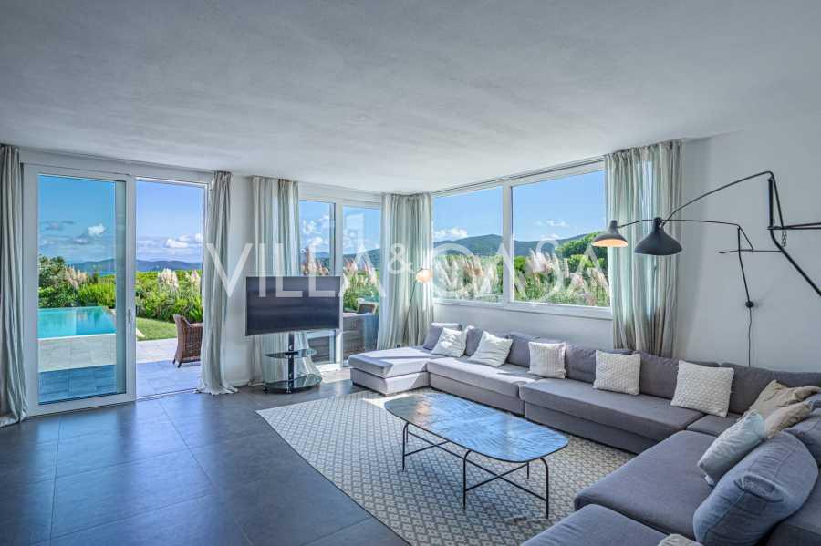 Der Pool, umgeben von einer Sonnenzone mit Liegestühlen und Designermöbeln, ist das Zentrum der Außenbereiche: der perfekte Ort für Entspannung mit einem atemberaubenden Blick auf die Bucht.